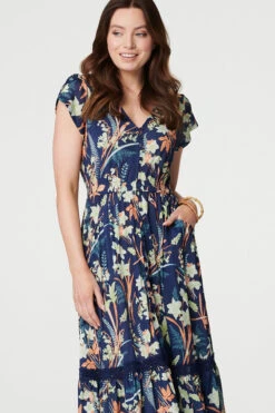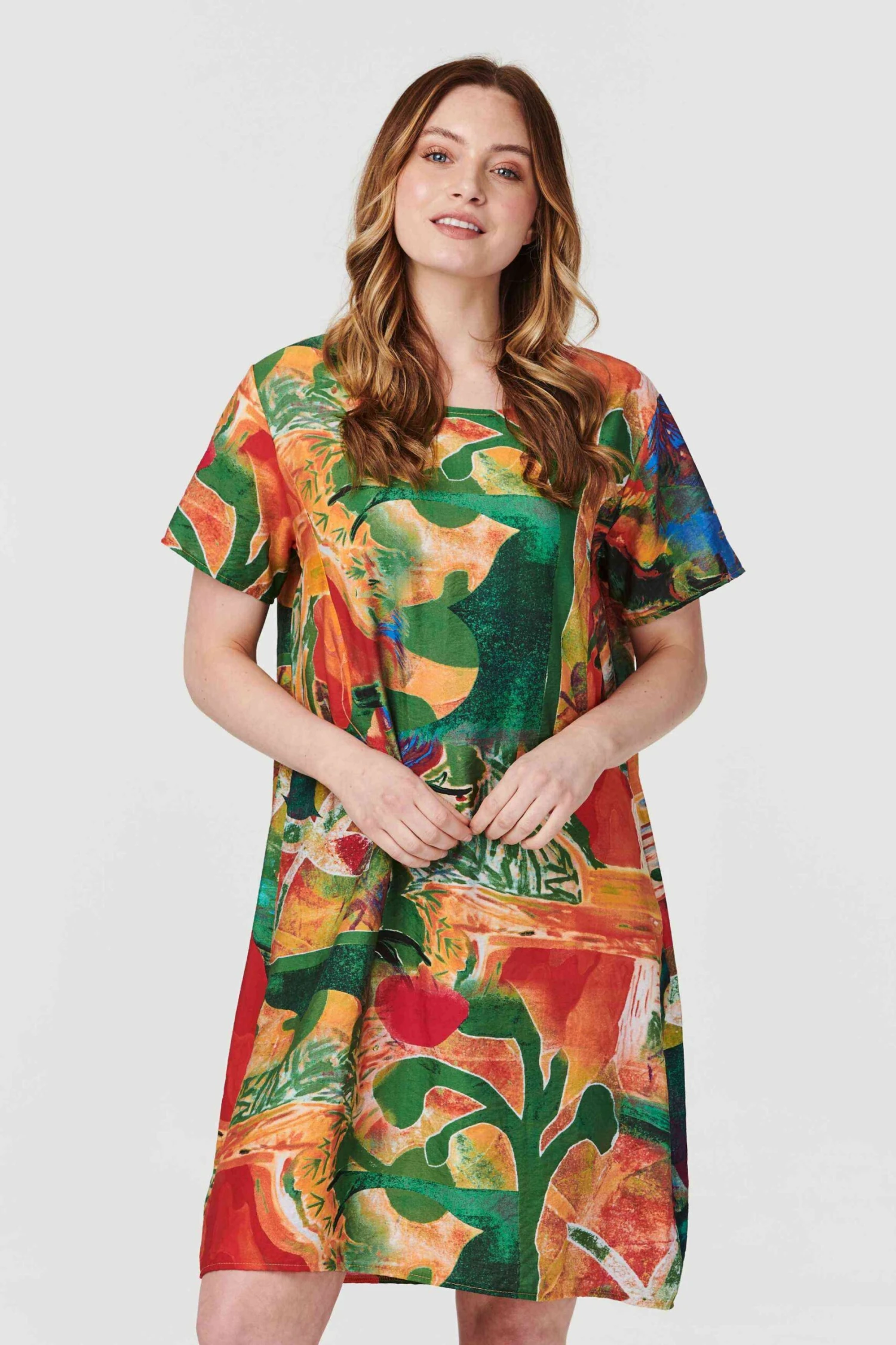 Add a bold printed shift dress to your closet with this watercolour print style. With a round neck, short sleeves, pockets and a knee length skirt. Style with flat sandals for an effortlessly comfortable outfit.