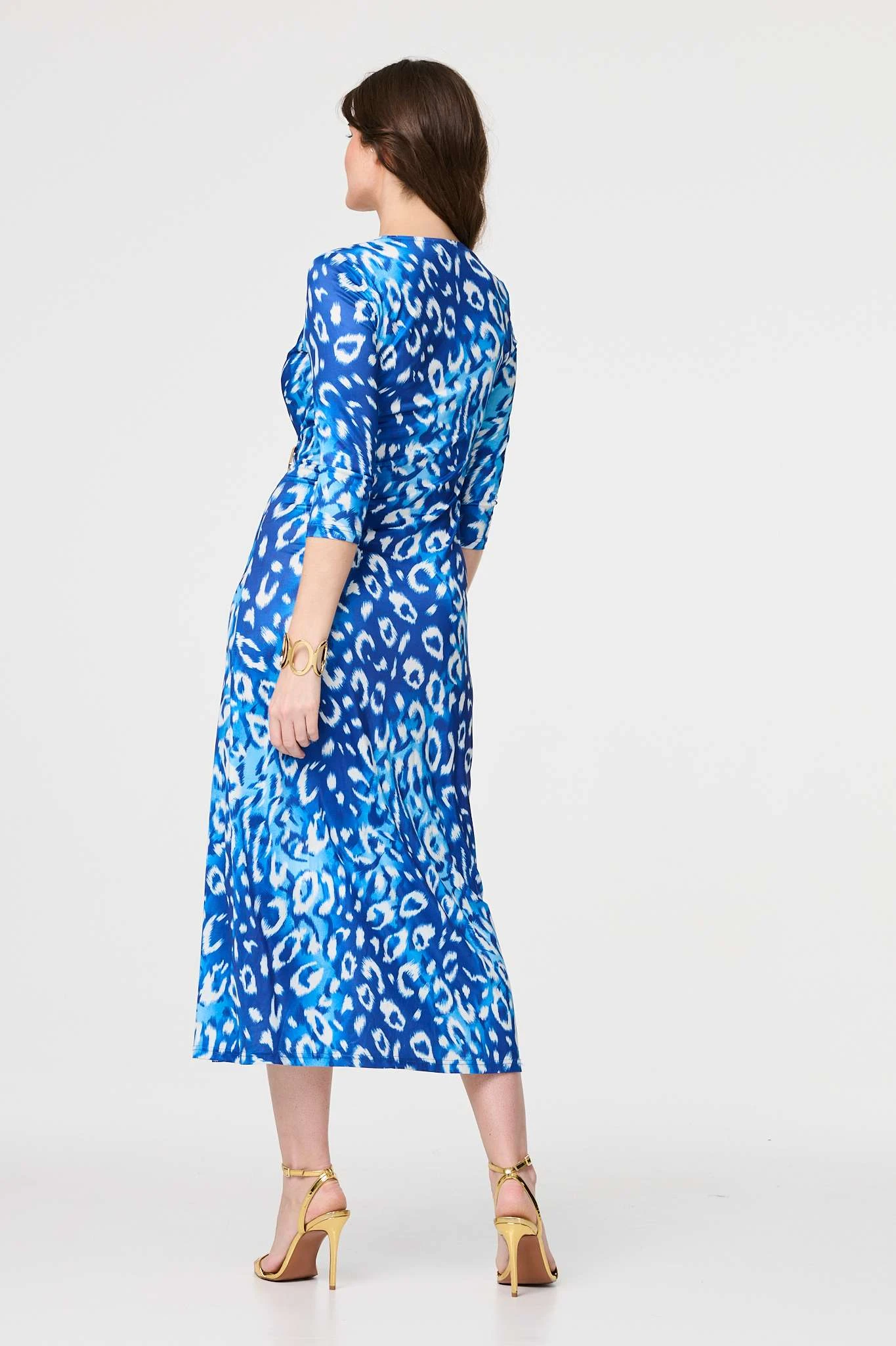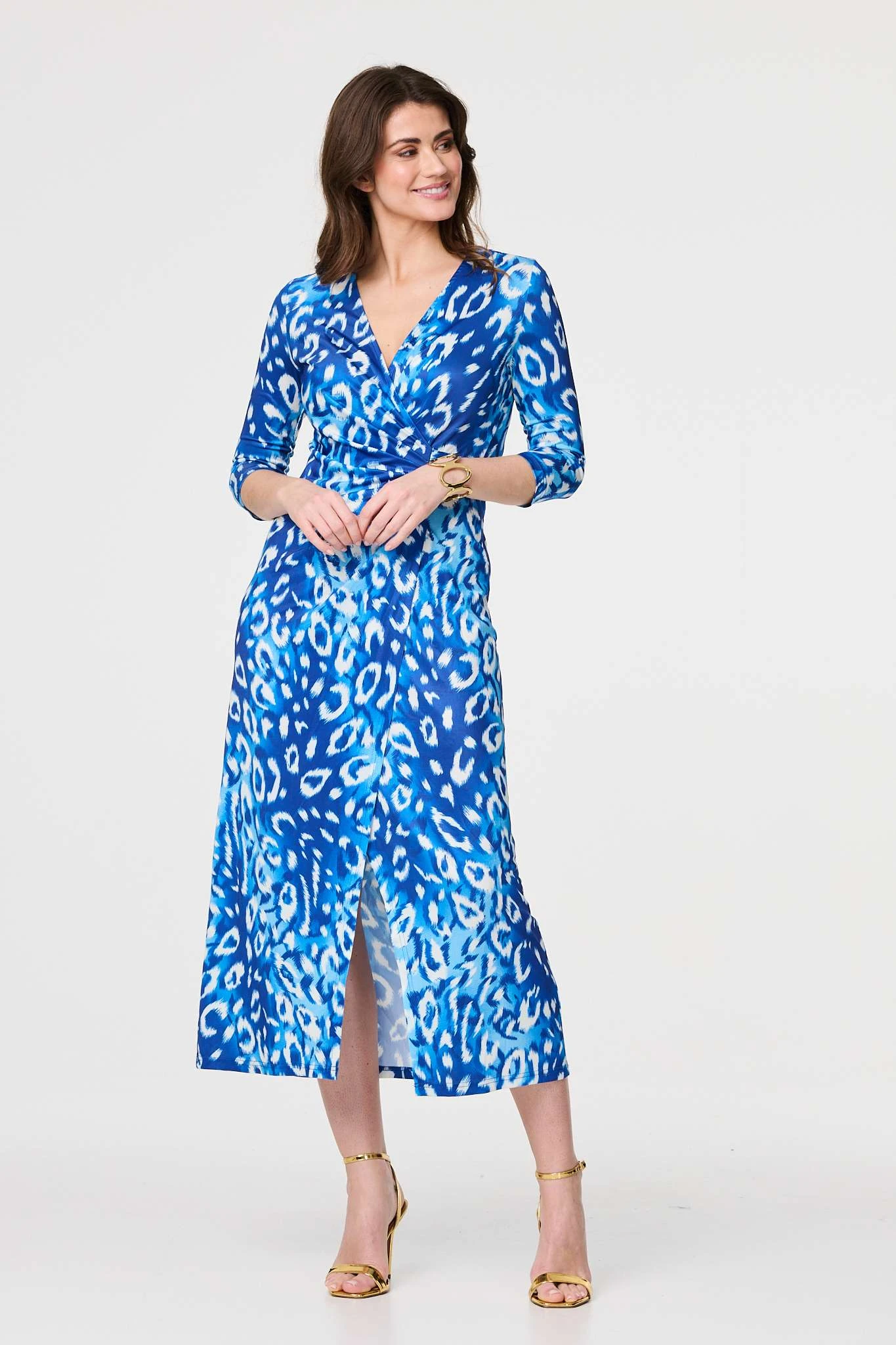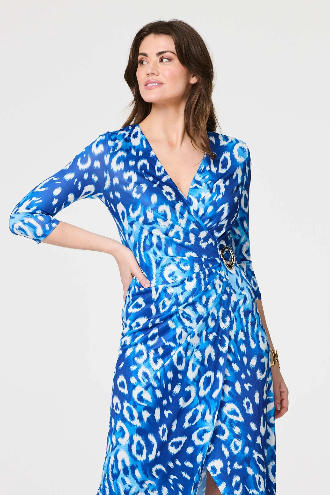 Whether you’re dressing for plans with friends, a day at the office or even a formal event – you’ll look classic and stylish in this wrap dress. It has a v-neck and 3/4 sleeves, with a wrap front that fastens using a metallic buckle. The front split adds some drama to the look too.