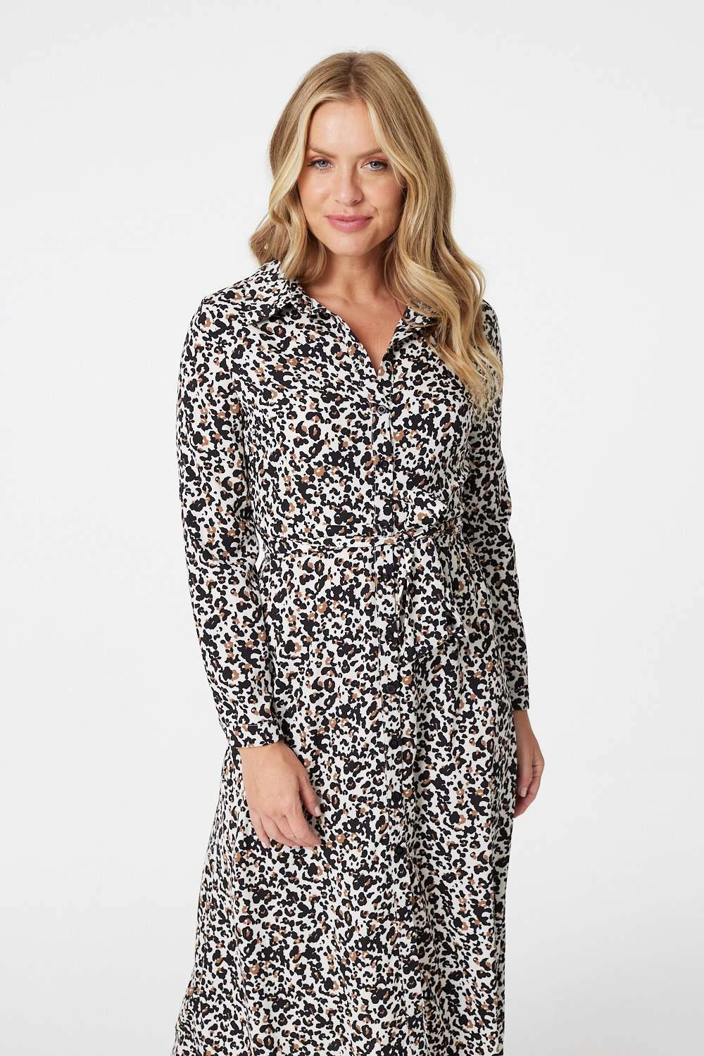 No closet is complete without a shirt dress like this bold animal print look. With a v-neck, classic collar, long sleeves, a self-tie belt, a button front and an a-line midi skirt. Style with strappy heels for a smart event or drinks with the girls or for a bold weather friendly look style with knee high boots and an oversized coat.