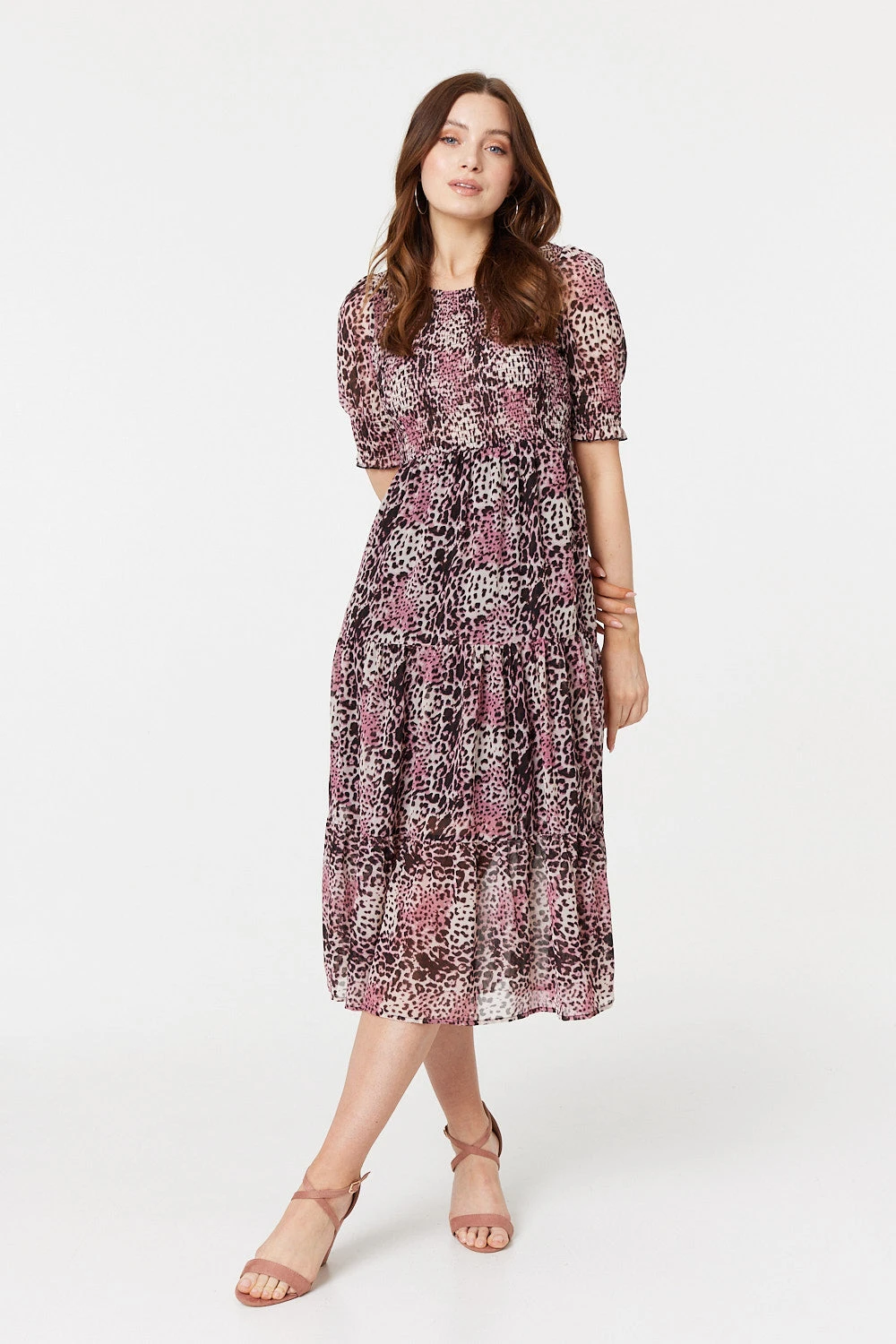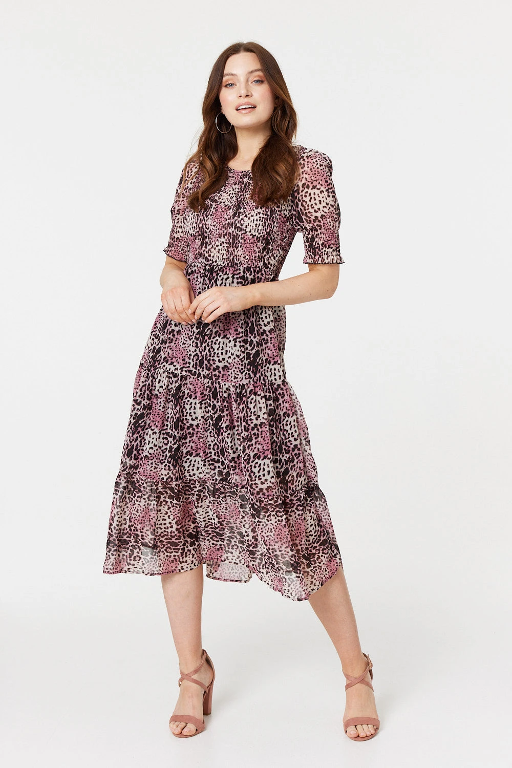 For a playful vintage look, try this charming smock dress. It has a square neck with 1/2 puff sleeves and shirred bodice, which flows into a tiered midi skirt. This casual fit can be styled all year round to get an effortlessly stylish finish that can be dressed up or down.
