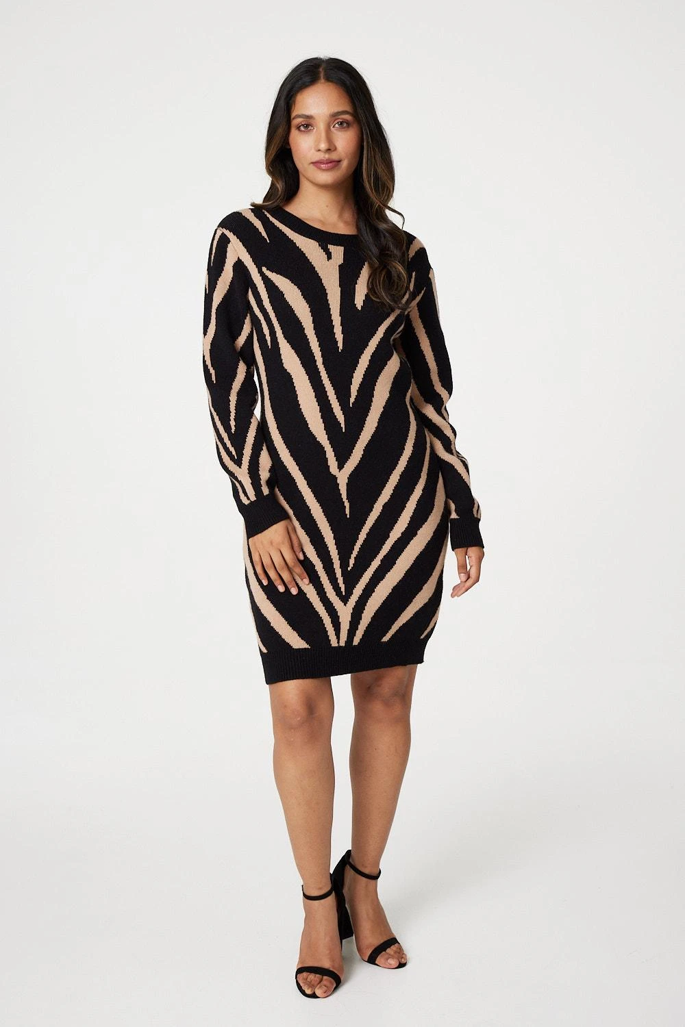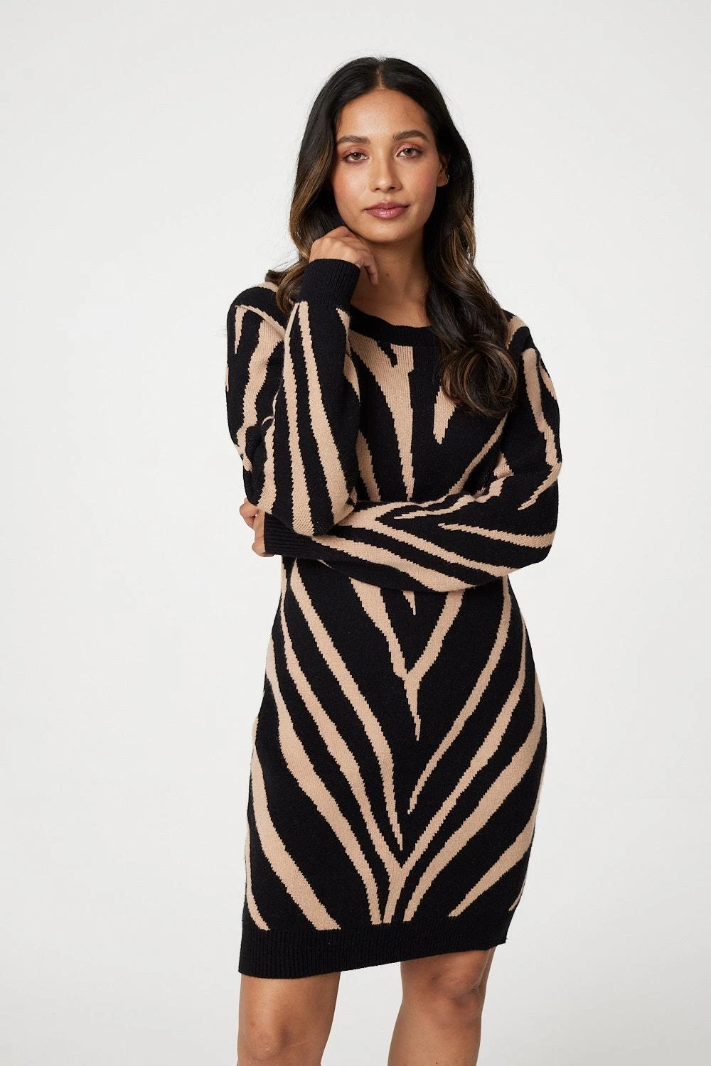 Make a statement in this zebra print knitted tunic dress. It has a round neck, long sleeves, a relaxed fit and a thigh length hem. Pair with opaque tights or leggings and boots for an on-trend cold weather style.