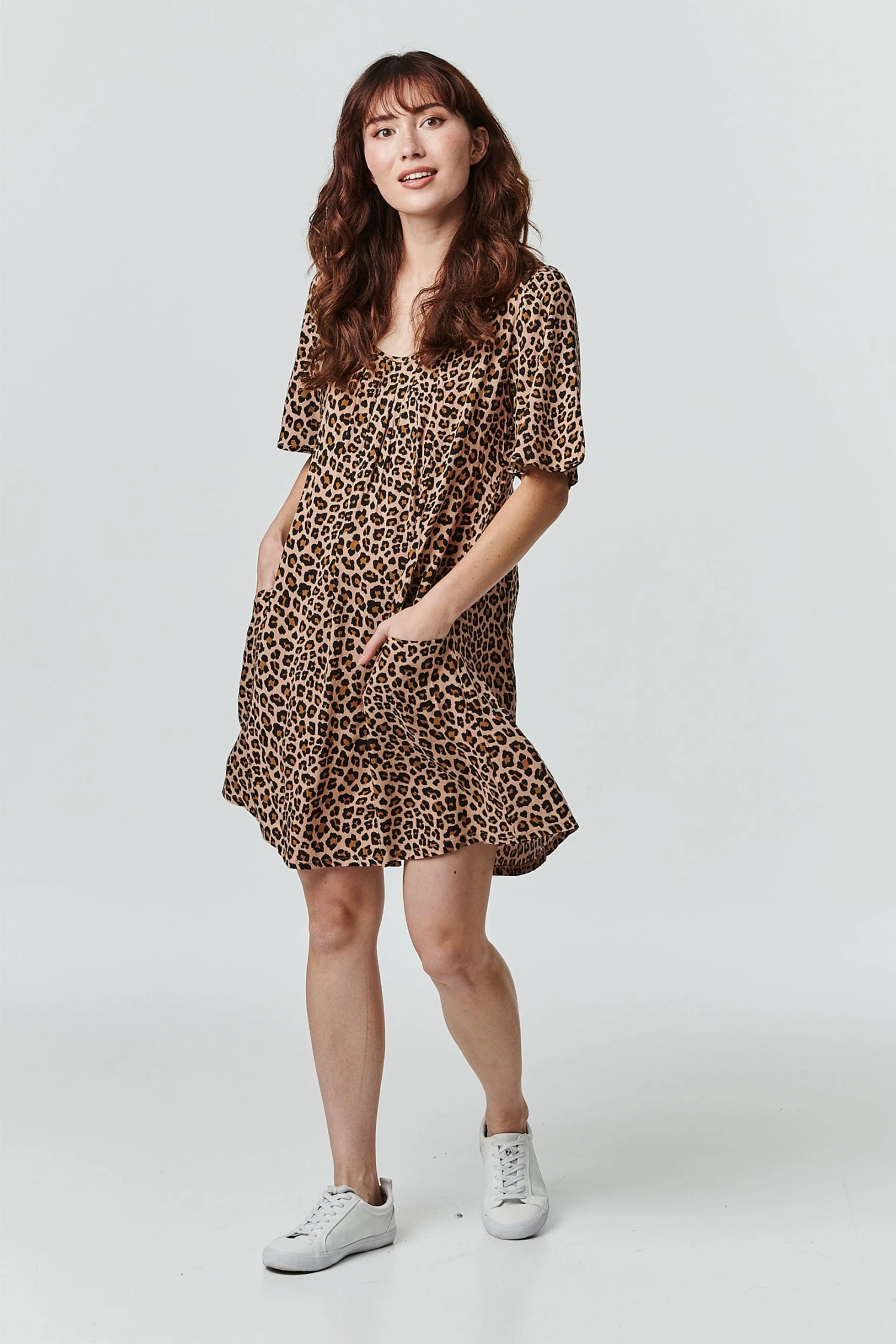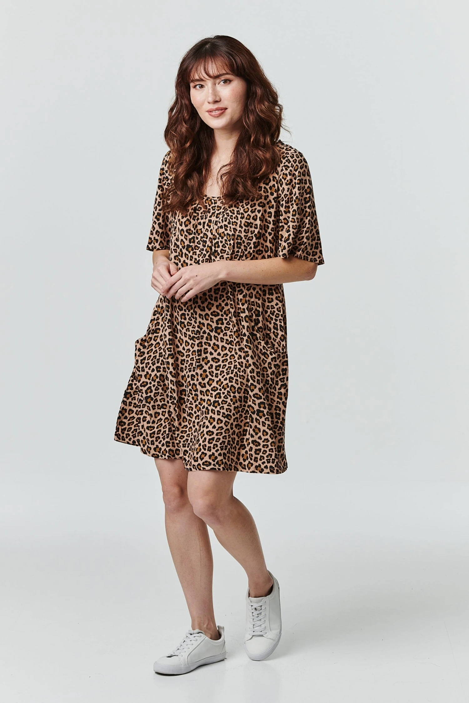 Stand out from the crowd in this animal print mini dress. With a round neck, short sleeves and a flared short skirt. Style with chunky boots and leggings when the cold weather sets in.