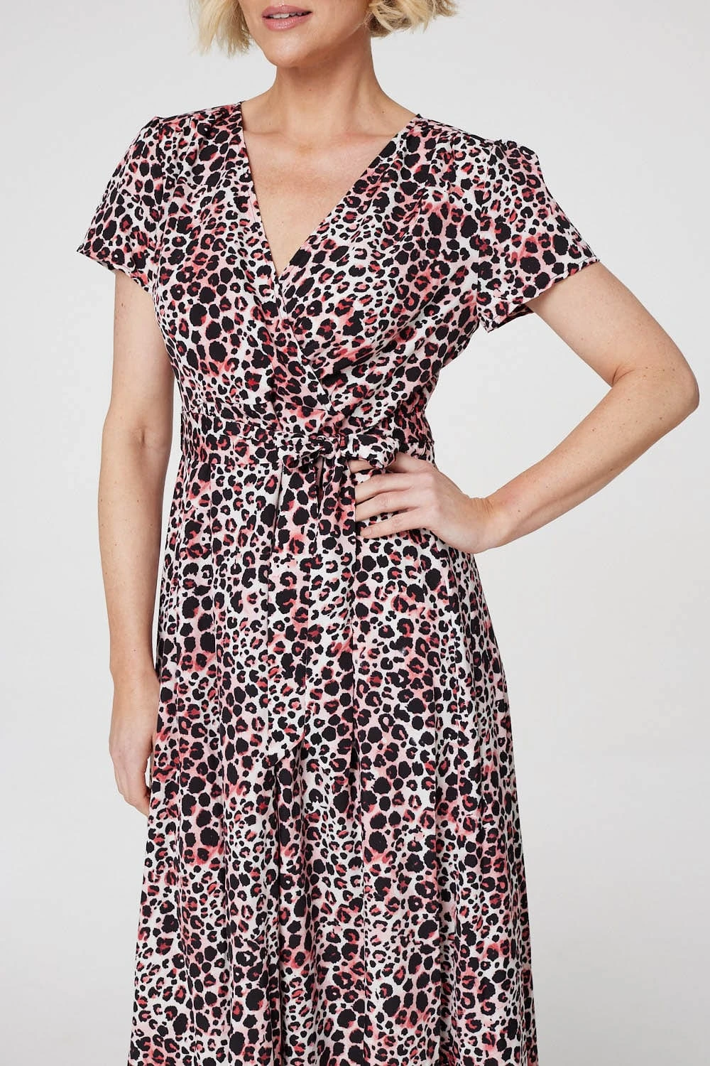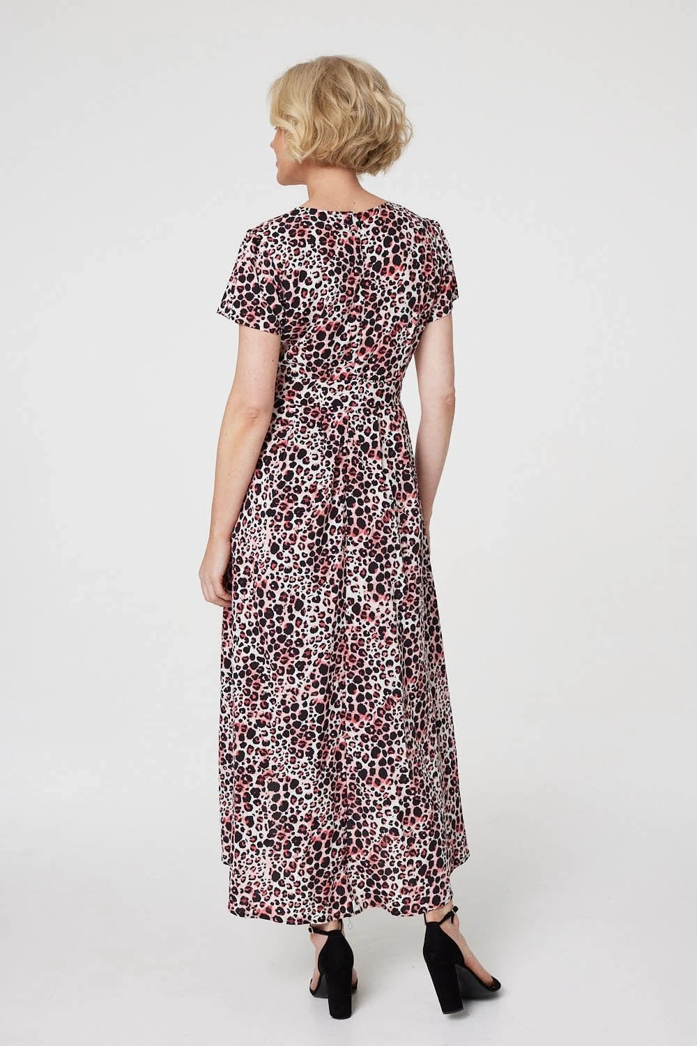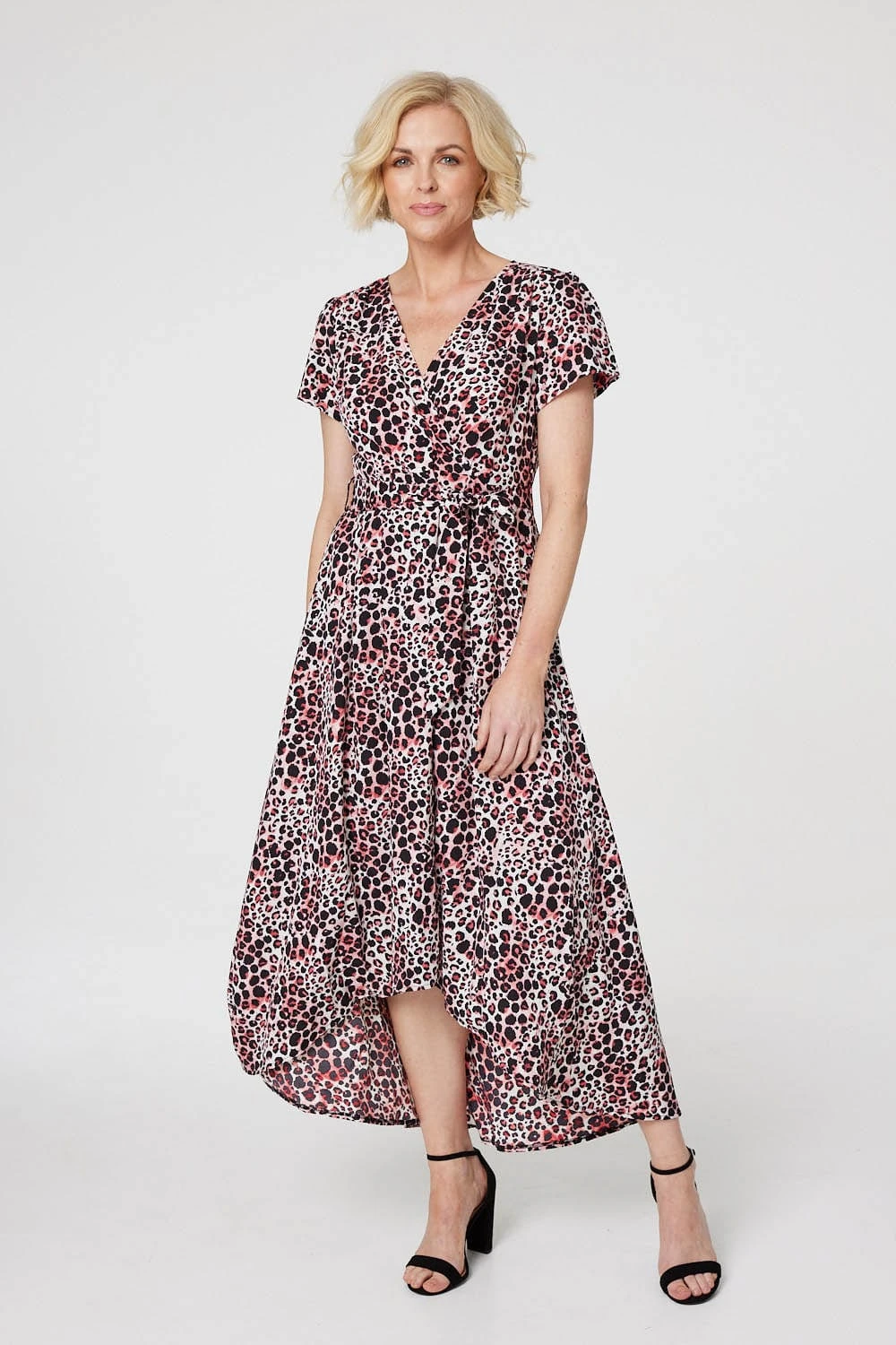 Add a bold leopard print maxi dress to your closet with this high low wrap dress. With a v-neck, short sleeves, a tie detail waist and an a-line maxi skirt with a fun high low hemline. Style with black heels and a matching bag for the perfect dressed up brunch outfit.