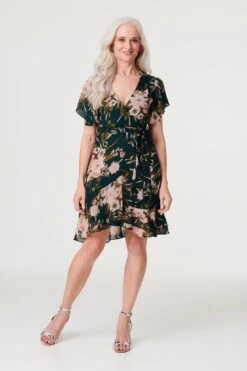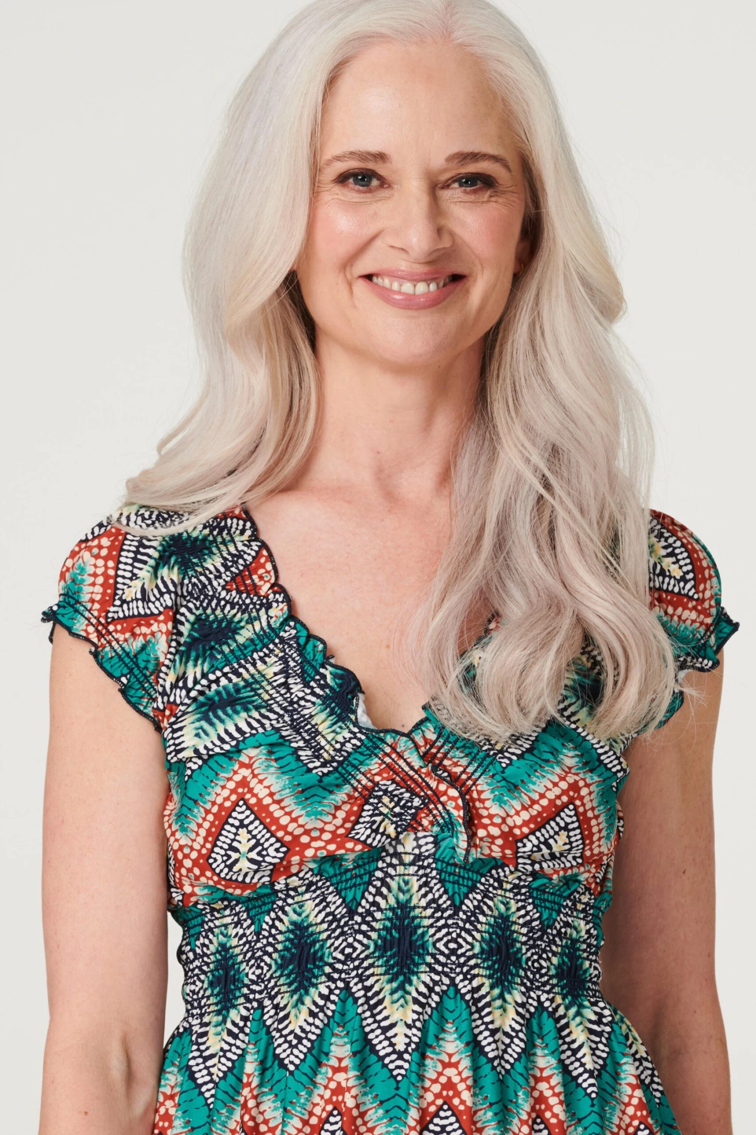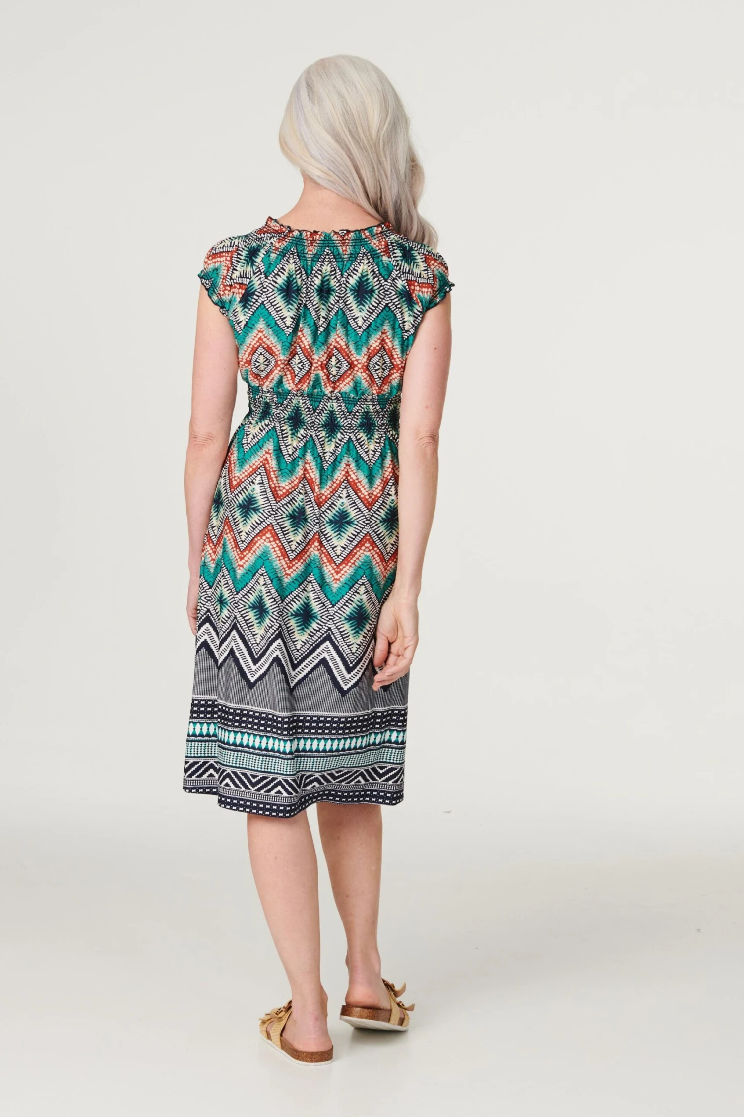 Make a statement with this Aztec print midi. It has a v-neck and short cap sleeves both with a shirred and frilled detail, a smocked waist and a column shape midi length skirt sitting just below the knee. Made from a non-iron stretch jersey fabric, it’s the perfect grab and go outfit. Pair with flat sandals for a great warm weather daytime style.