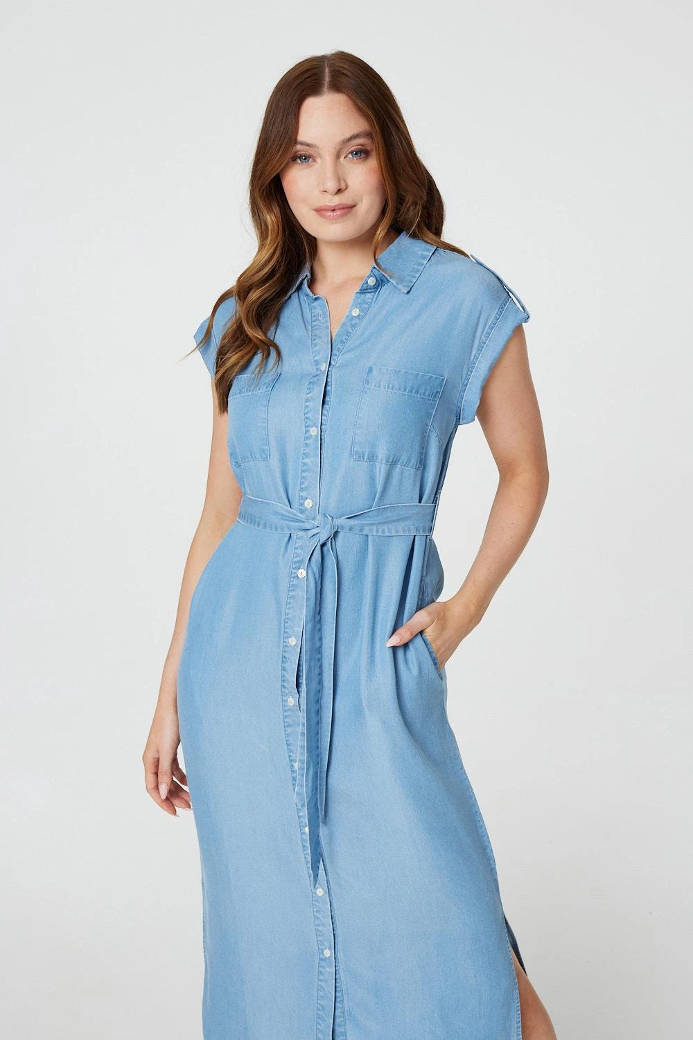 Every capsule wardrobe needs a go-to shirt dress like this lightweight denim style. It has a collar, v-neck, button front, short turn-up sleeves, a detachable self-tie belt, front pockets, handy side pockets and a midi length straight skirt with side splits. Pair with fresh trainers for a chic weekend look.
