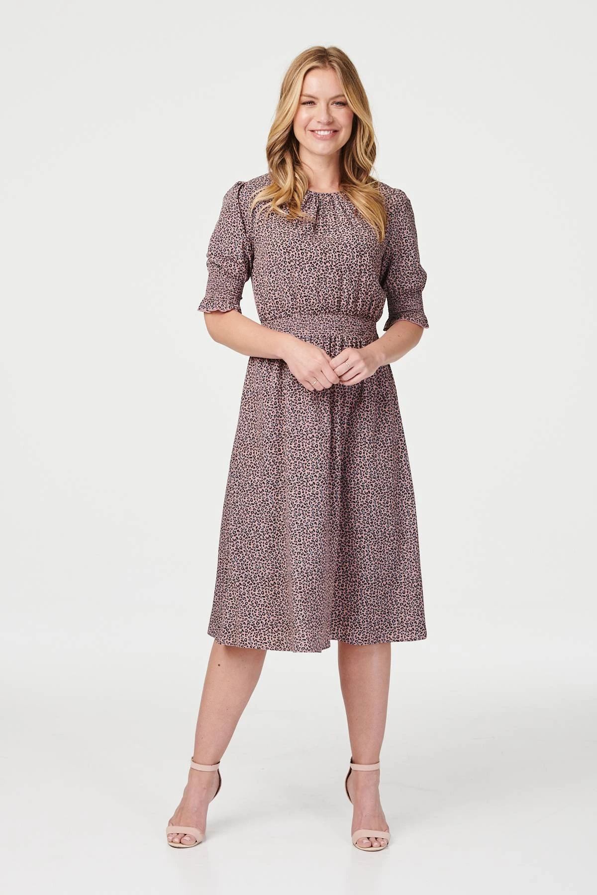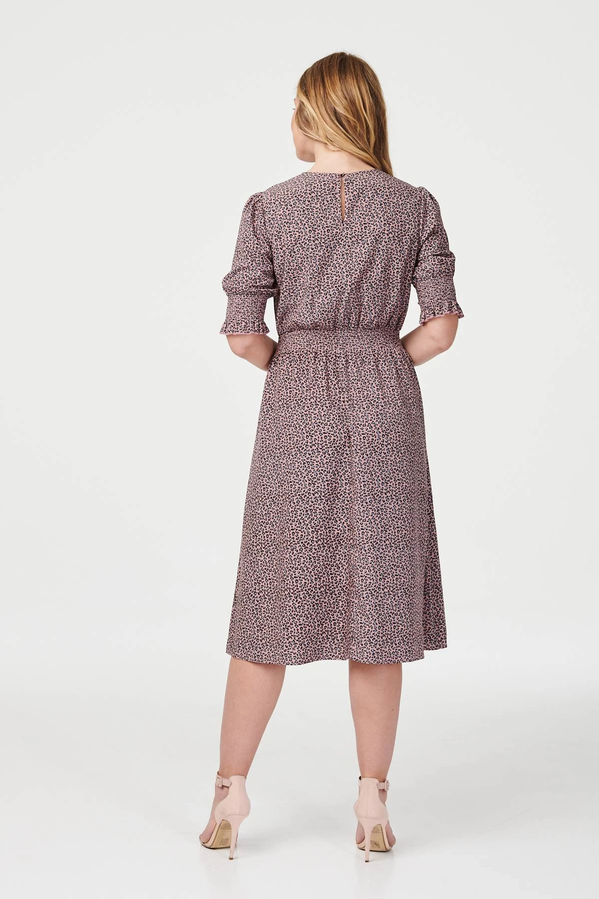 No collection is complete without an animal print dress like this leopard print tea dress. With a round neck, short sleeves with smocked cuffs, a keyhole back detail, a cinched waist and a midi skirt. Style with blush heels for a simple yet stylish daytime outfit.