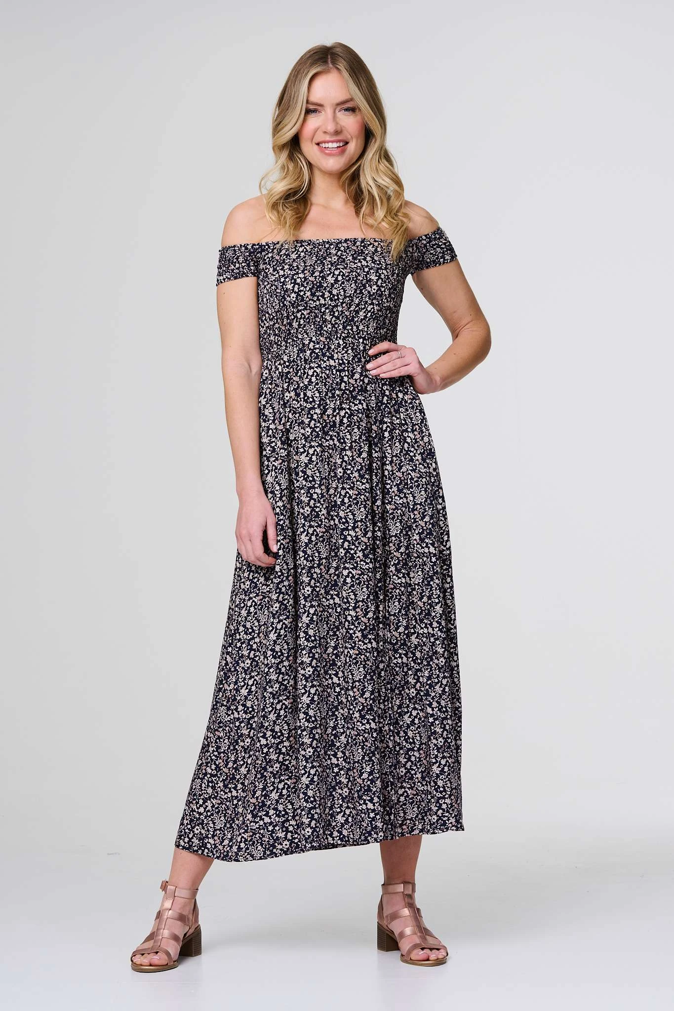 This smocked maxi dress is perfect for any occasion – whether that’s a summer day at work, drinks with the girls or a romantic beach dinner. It has short sleeves, a Bardot neckline, a smocked bodice and a maxi length hem with side splits.