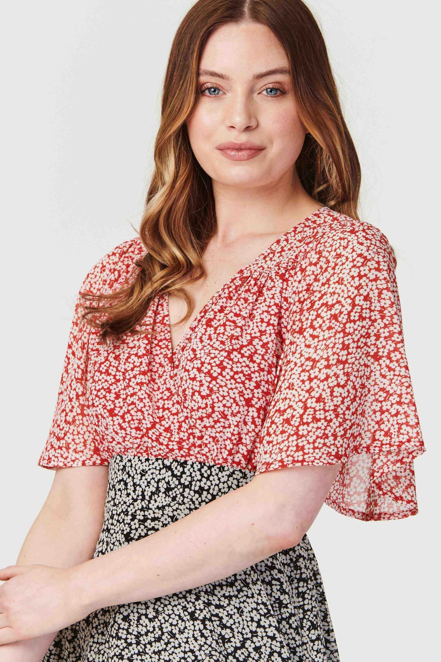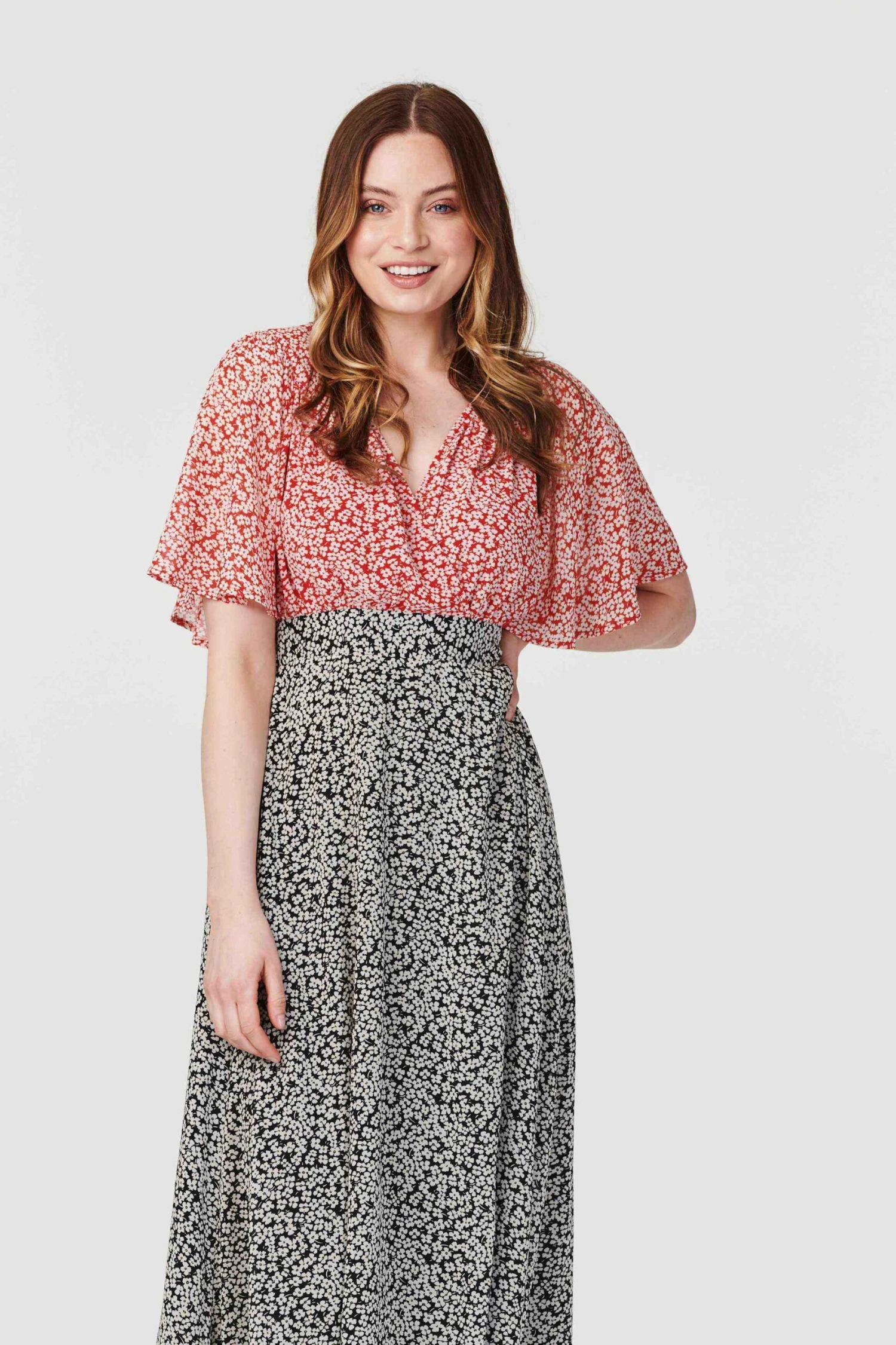 Add a stunning a-line maxi dress to your closet with this ditsy floral dress. With a v-neck, faux wrap front, semi sheer short flared sleeves, a tie detail back, a bold contrasting colour block detail and a classic full length skirt. Pair with black heels for a formal daytime event or dress down with strappy sandals for sunny picnic.