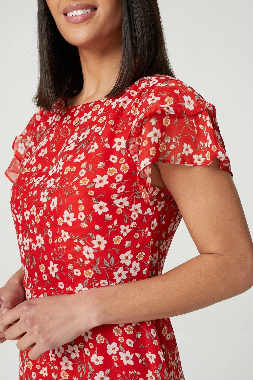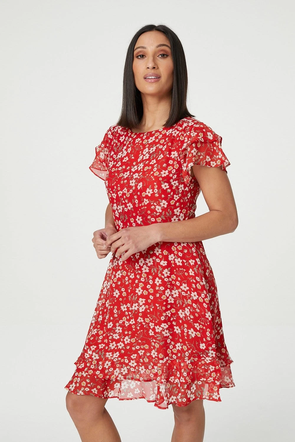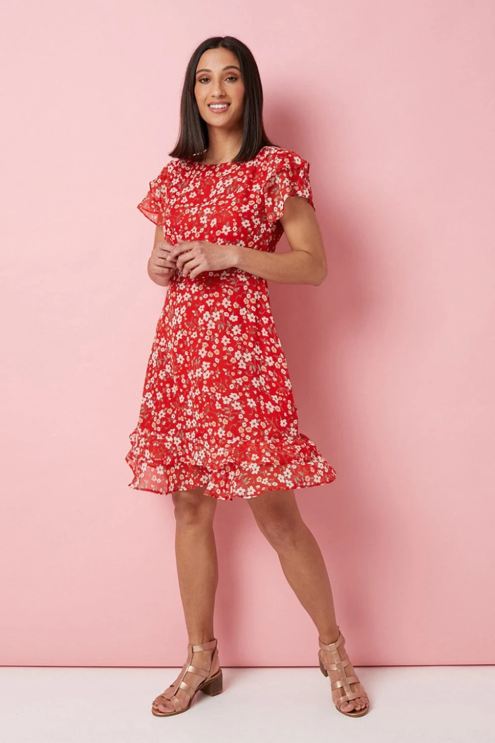Every dress collection needs a bright floral print and a flattering fit & flare shape. With a round neck, sheer frilled cap sleeves, a soft fit & flare cut, a frilled pephem detail and a short length. Pair with nude heels for a wedding or pair with trainers for a dressed down day look.