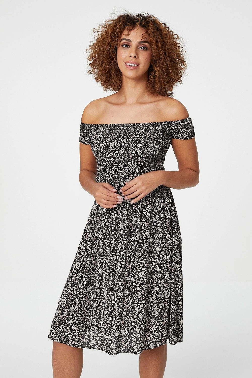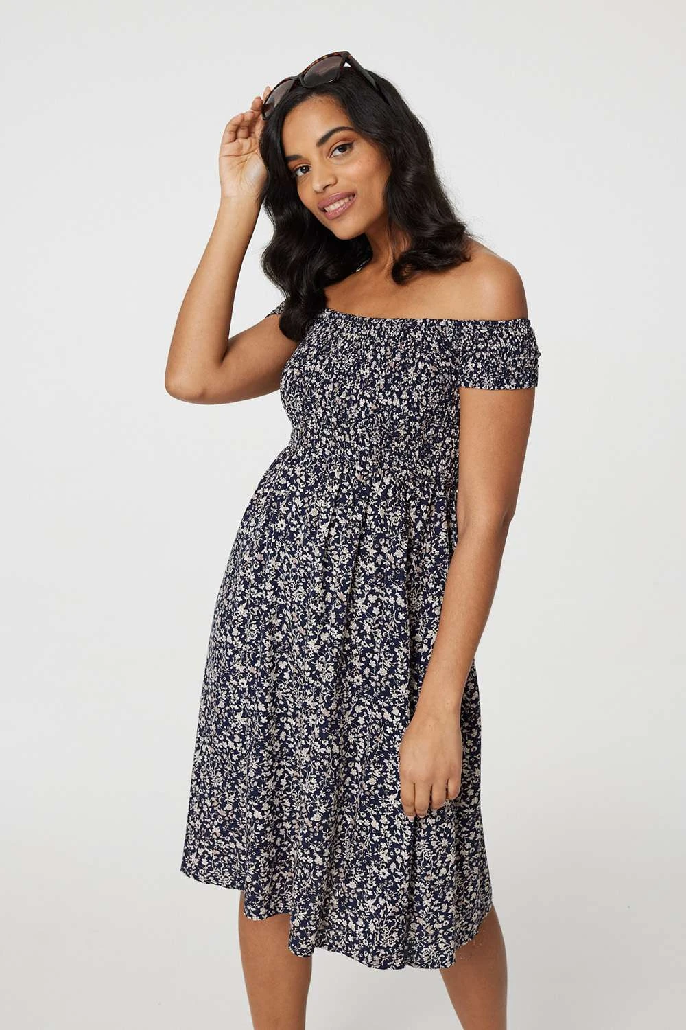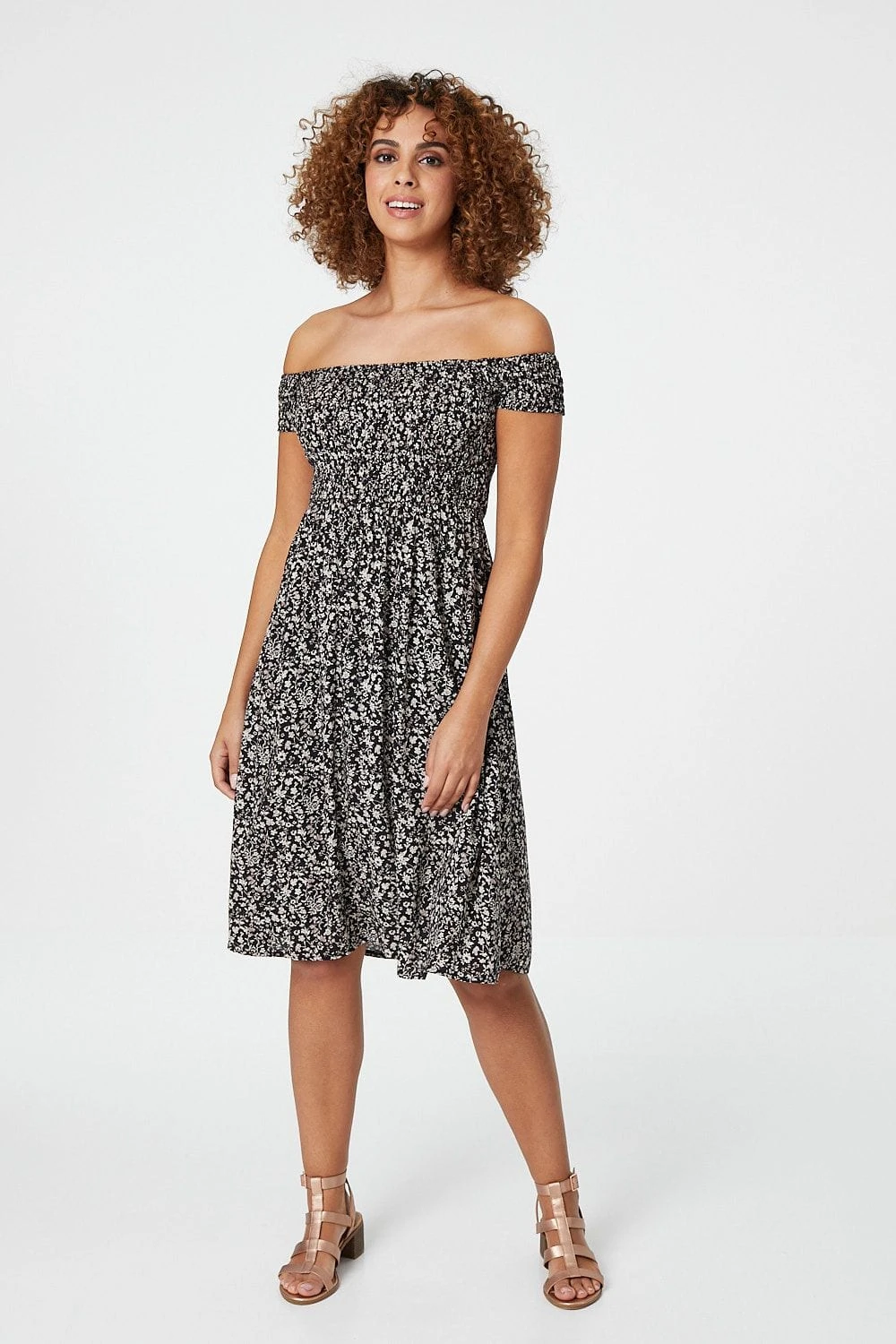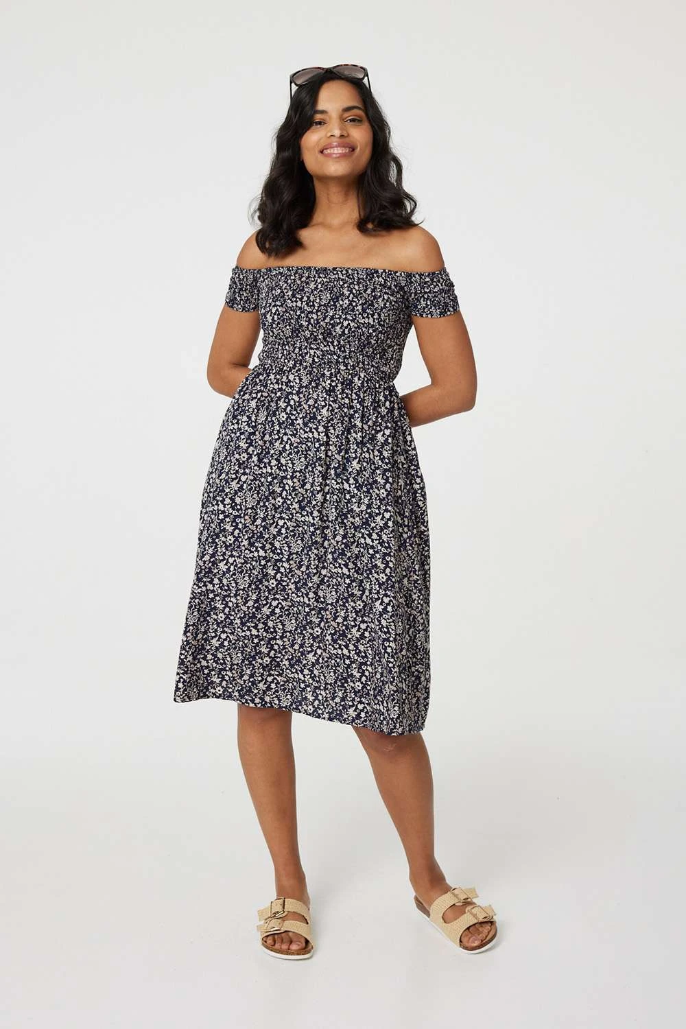 Every wardrobe needs a versatile day dress like this ditsy floral bardot dress. With a straight neck, cap sleeves, a shirred bodice and a straight knee length skirt. Pair with low sandals and a denim jacket for the perfect dressed down daytime look.