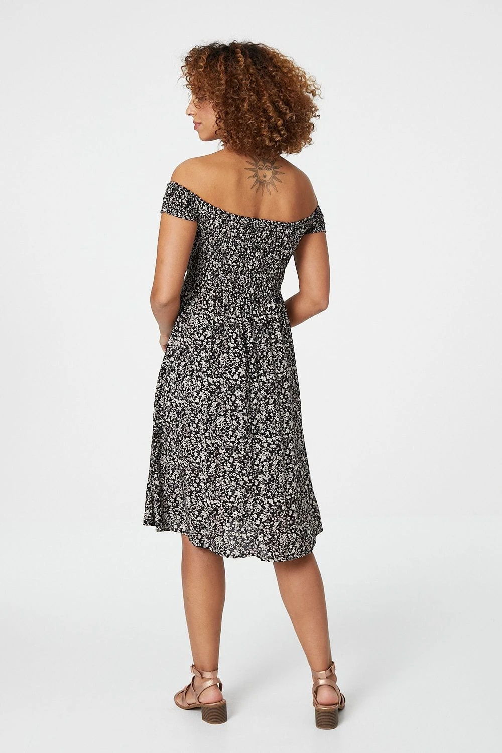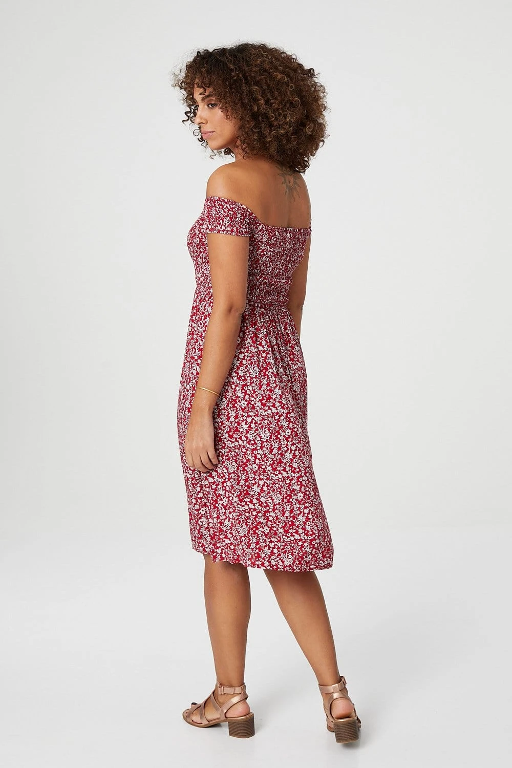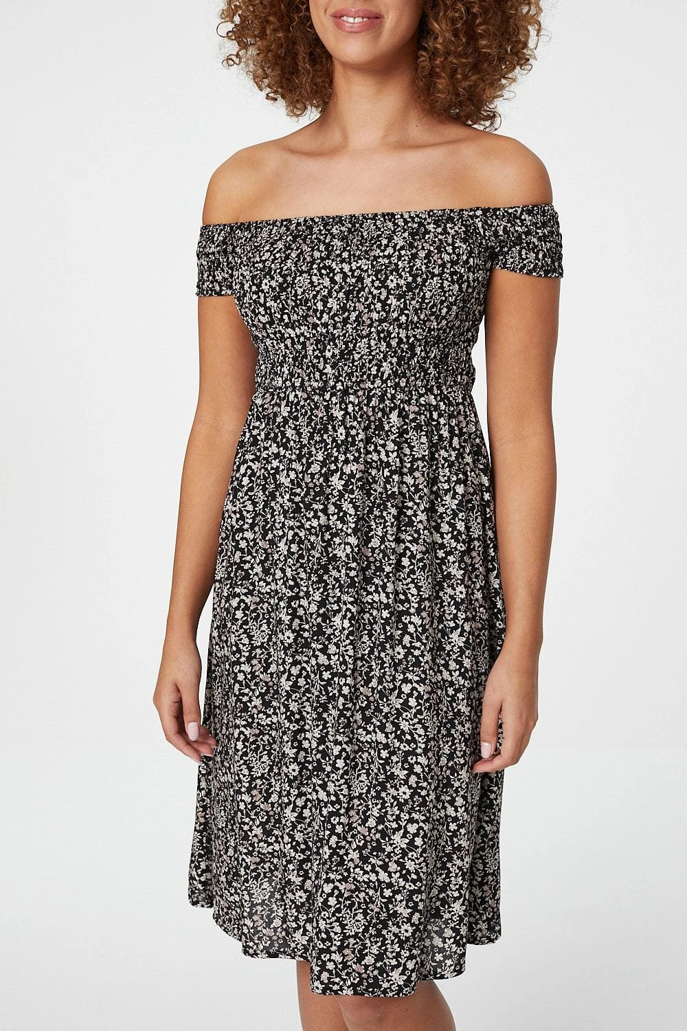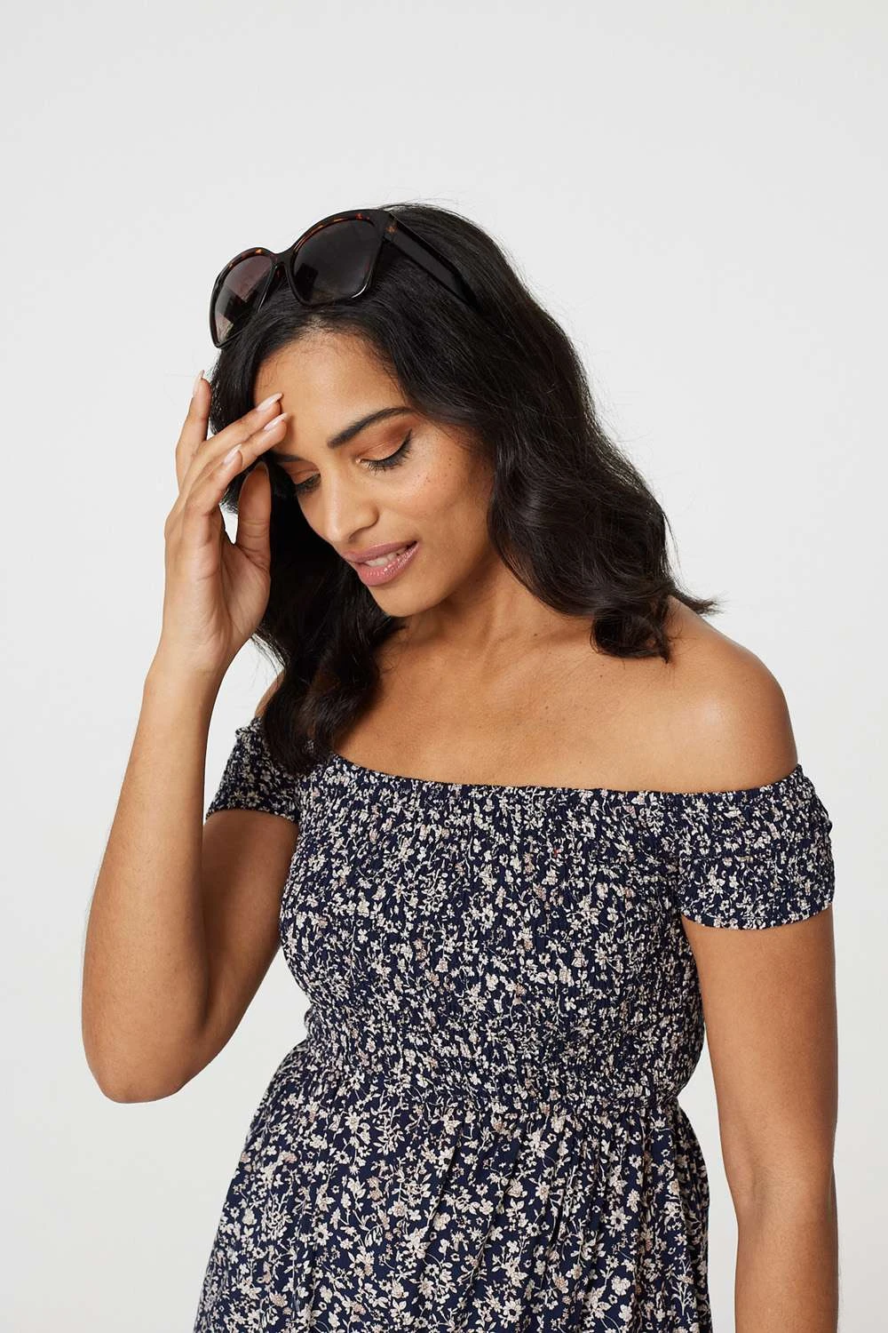 Every wardrobe needs a versatile day dress like this ditsy floral bardot dress. With a straight neck, cap sleeves, a shirred bodice and a straight knee length skirt. Pair with low sandals and a denim jacket for the perfect dressed down daytime look.