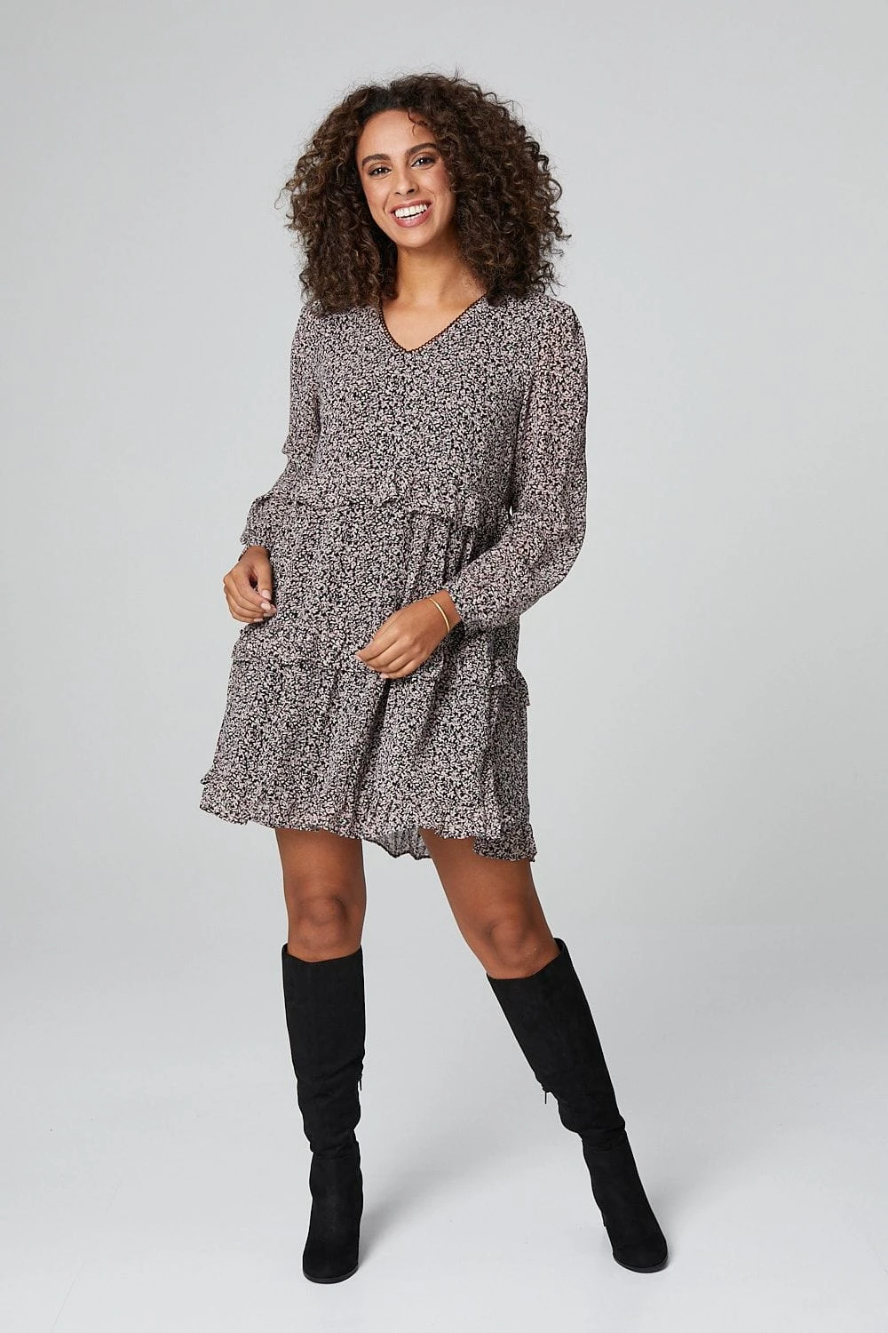 Every new season collection needs a bold ditsy floral smock dress. With a v-neck, long sheer sleeves and a tiered skirt sitting above the knee. Pair with knee high boots and a teddy coat for an on trend off-duty outfit.