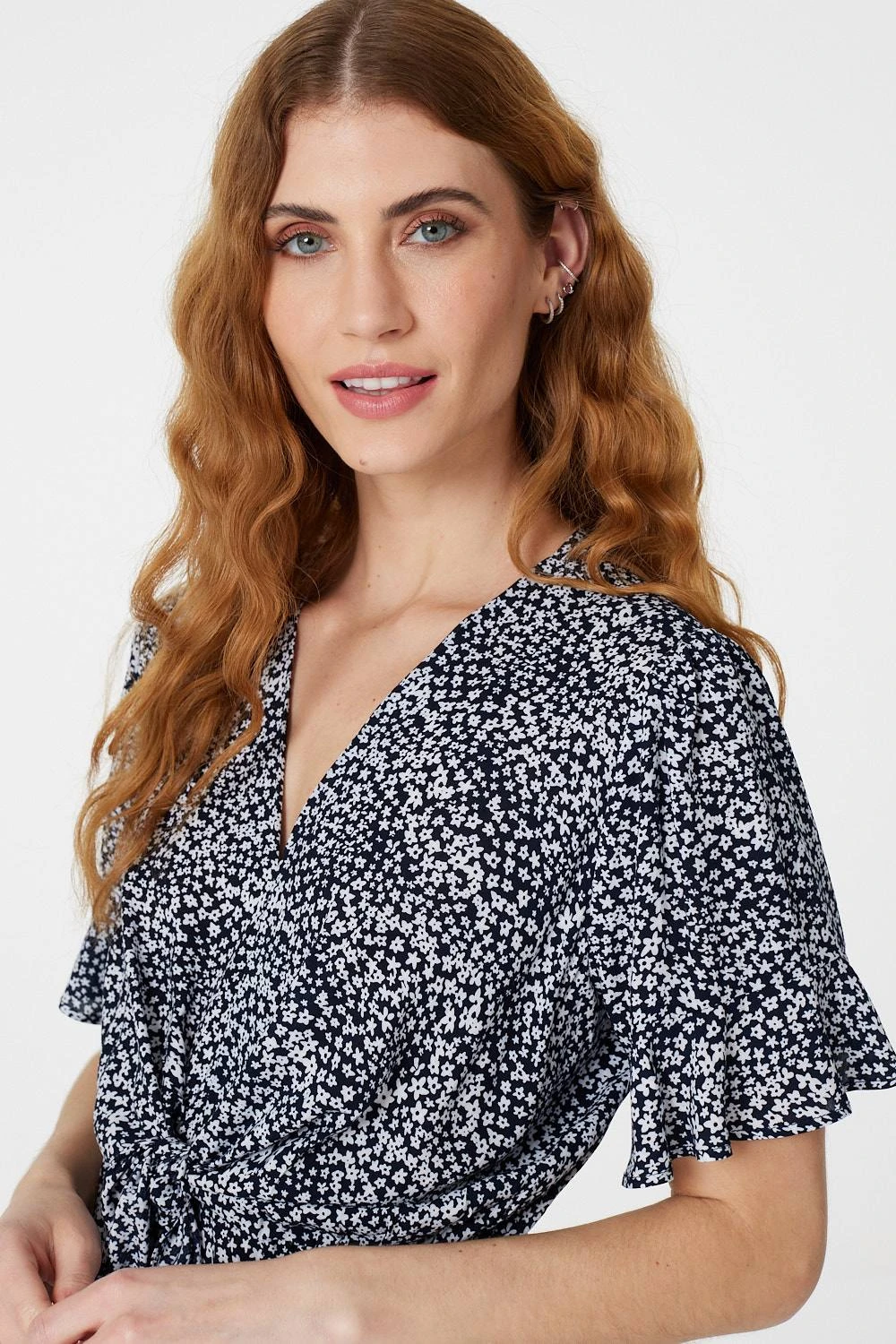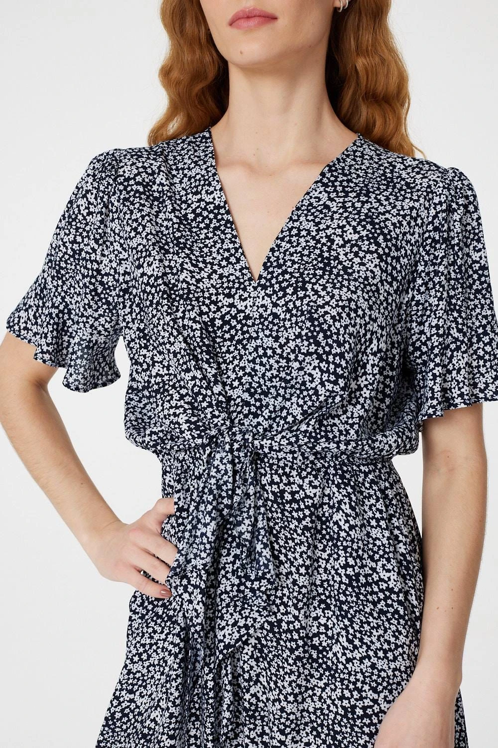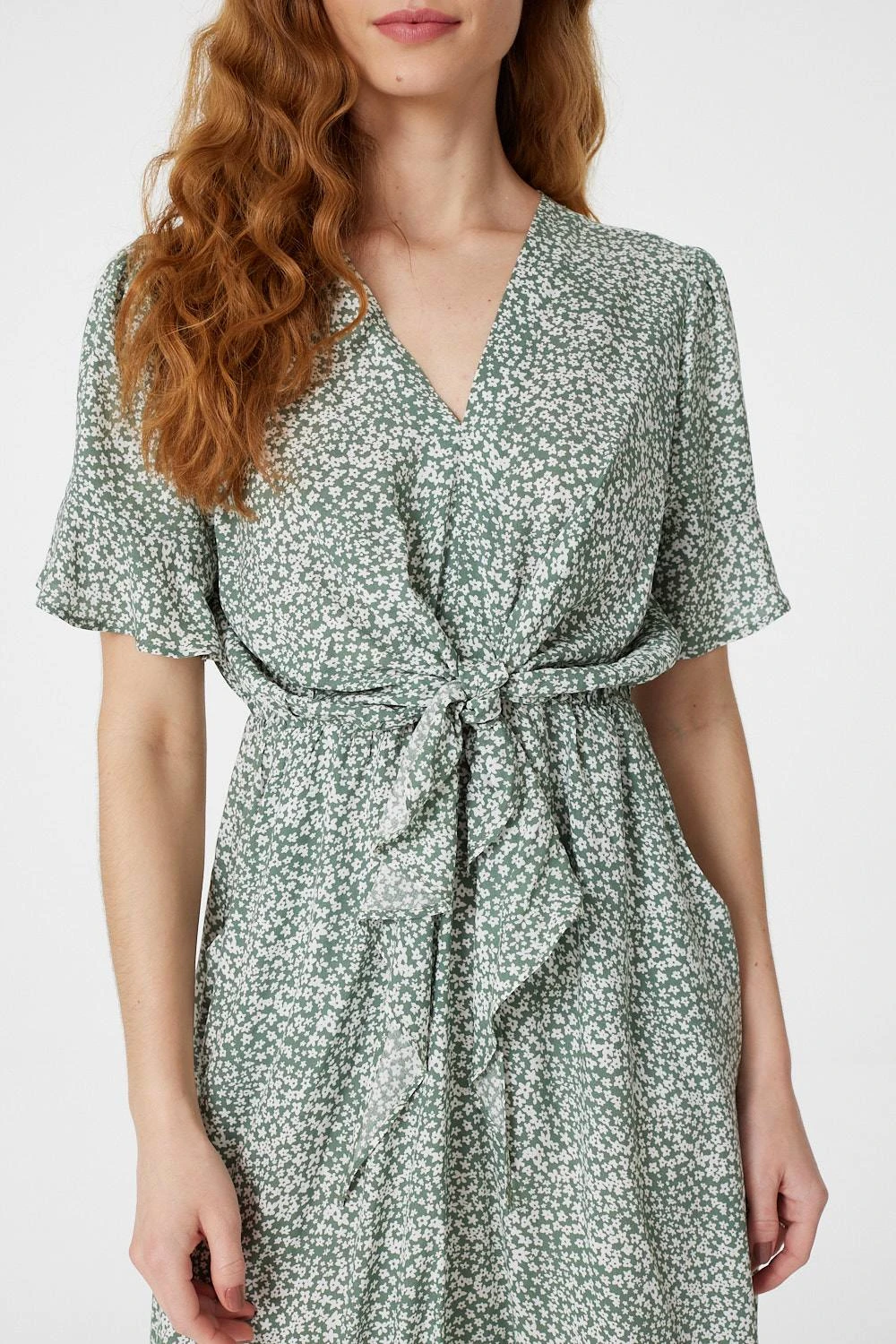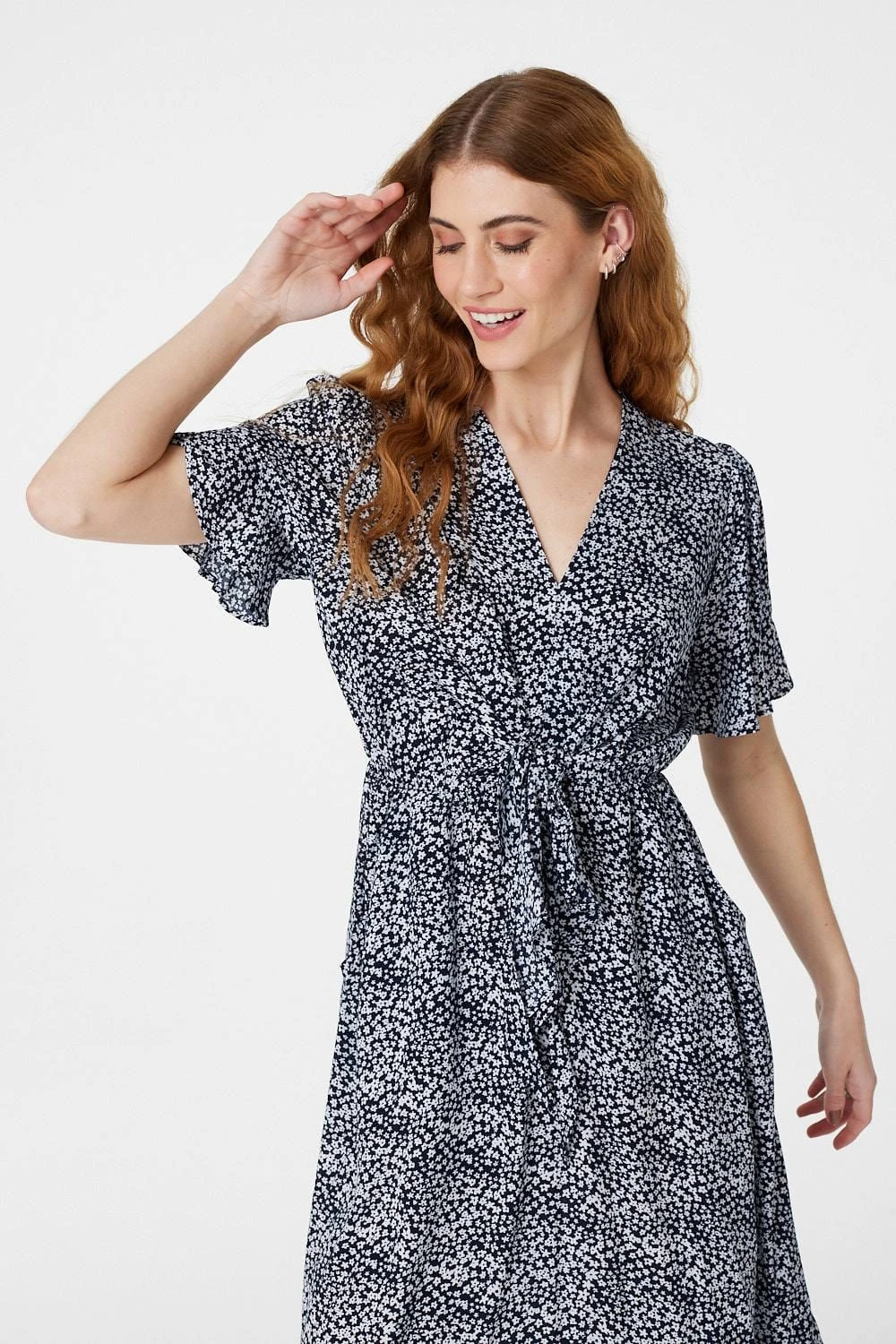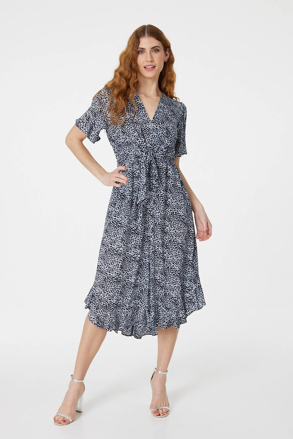 Your everyday dress collection needs this ditsy print tea dress. With a v-neck, short frilled sleeves, a flattering waist-cinching tie front and a frilled detail curved midi skirt. Style with silver heels for a polished evening occasion or dress down with flat sandals.