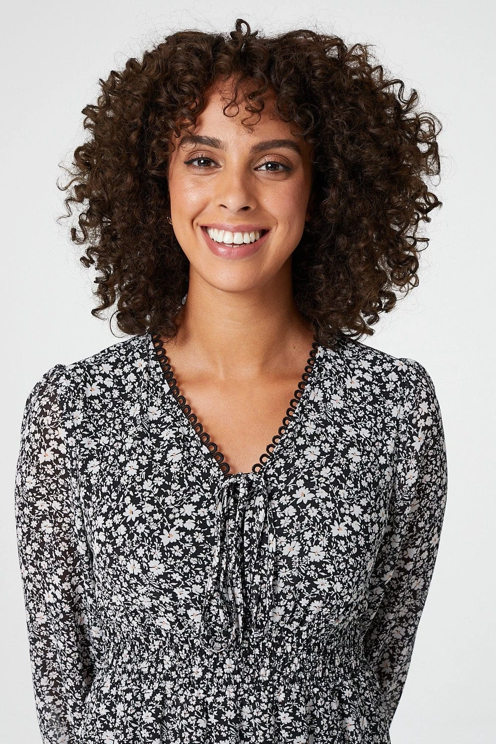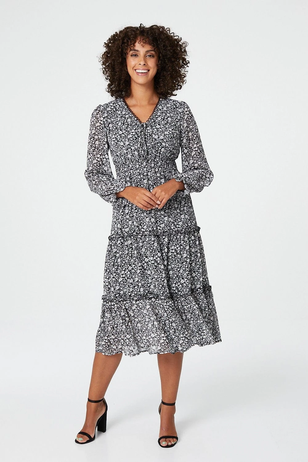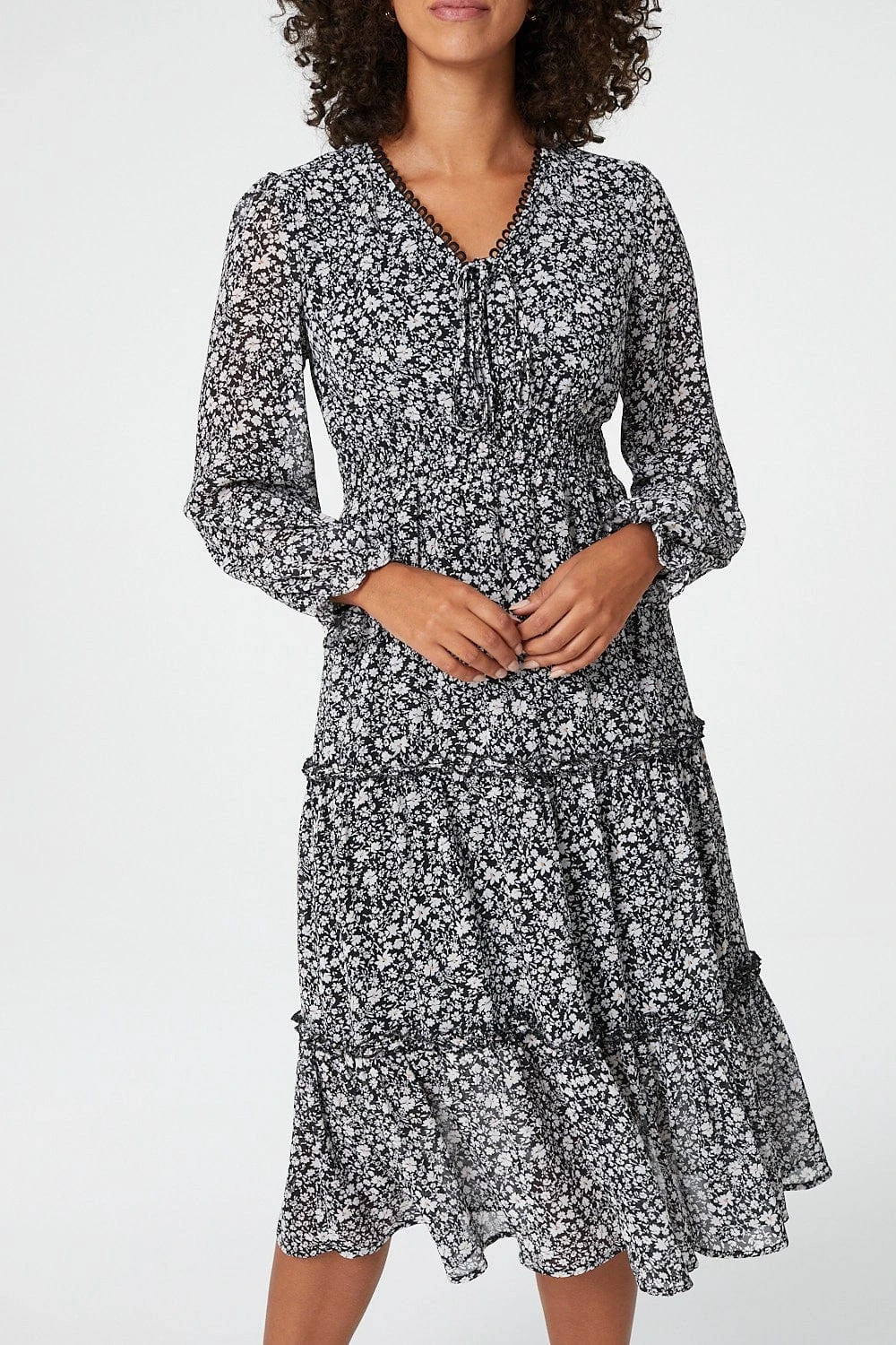 Stay on trend with this ditsy floral midi dress. With a v-neck featuring a tie detail front, long semi sheer sleeves, a cinched waist and a tiered a-line skirt sitting below the knee. Pair with black heels for a chic everyday look.