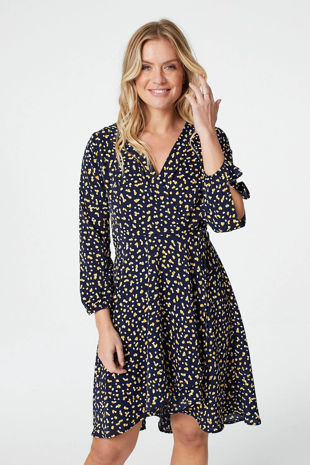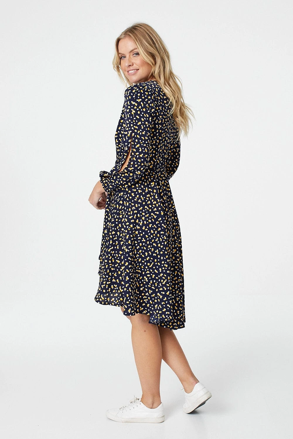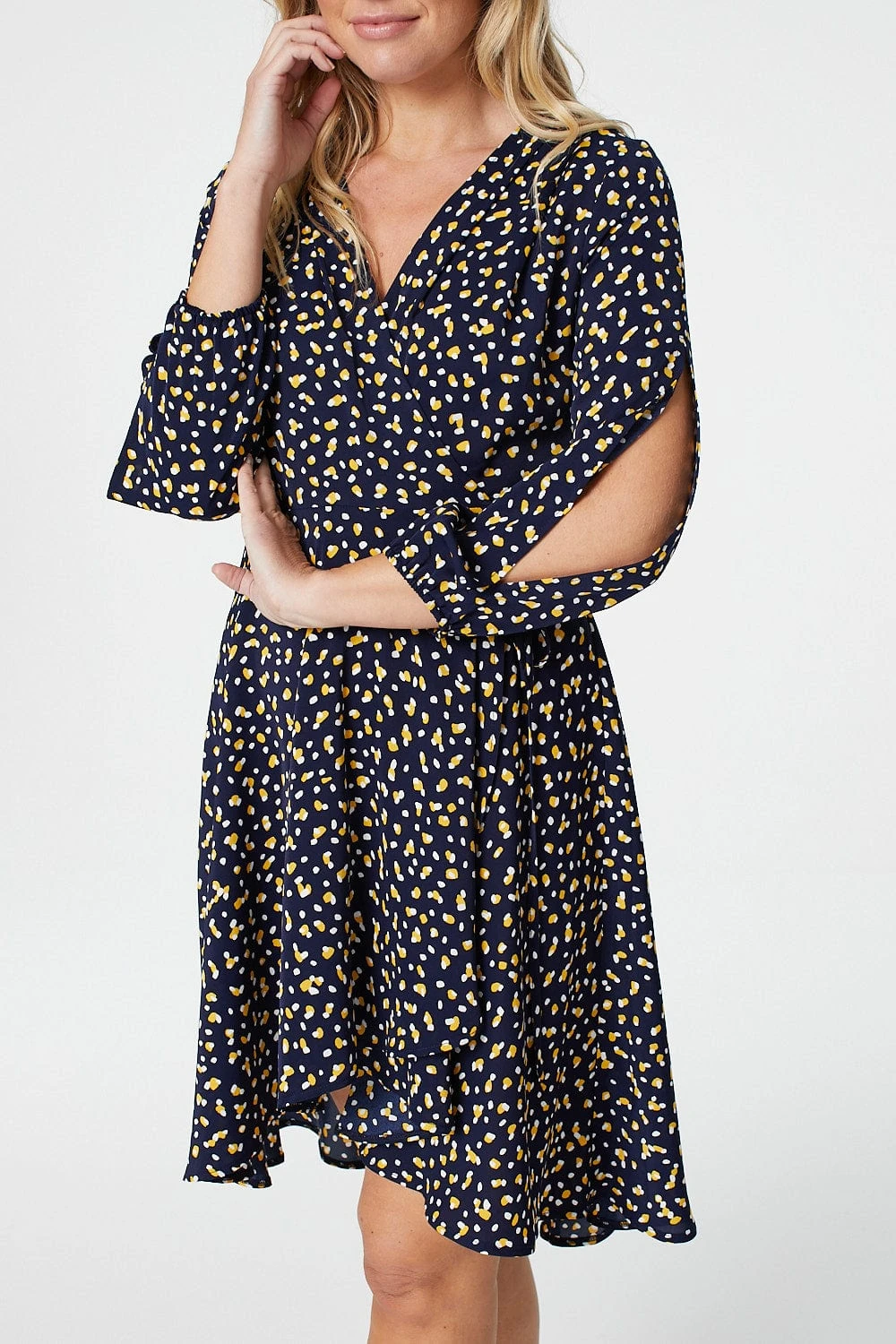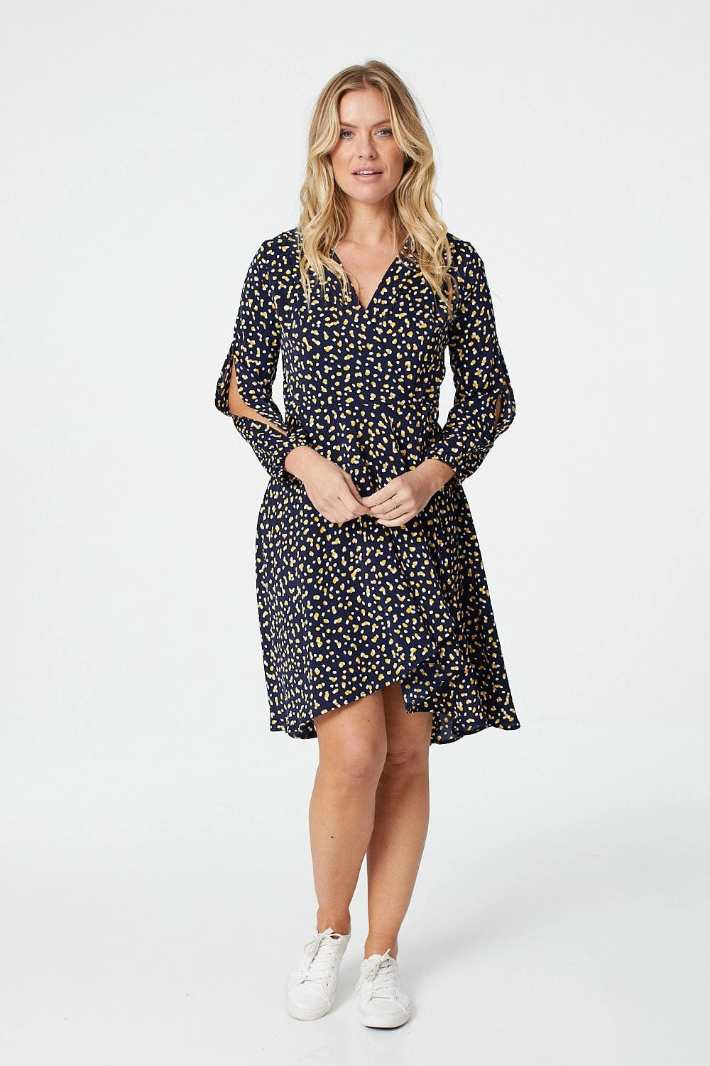 Add a statement making printed wrap dress to your new season closet. With a wrap front, v-neck, long split detail sleeves. a flattering high low hem sitting at the knee and a tie detail waist. Pair with blush heels for a chic wedding guest look.