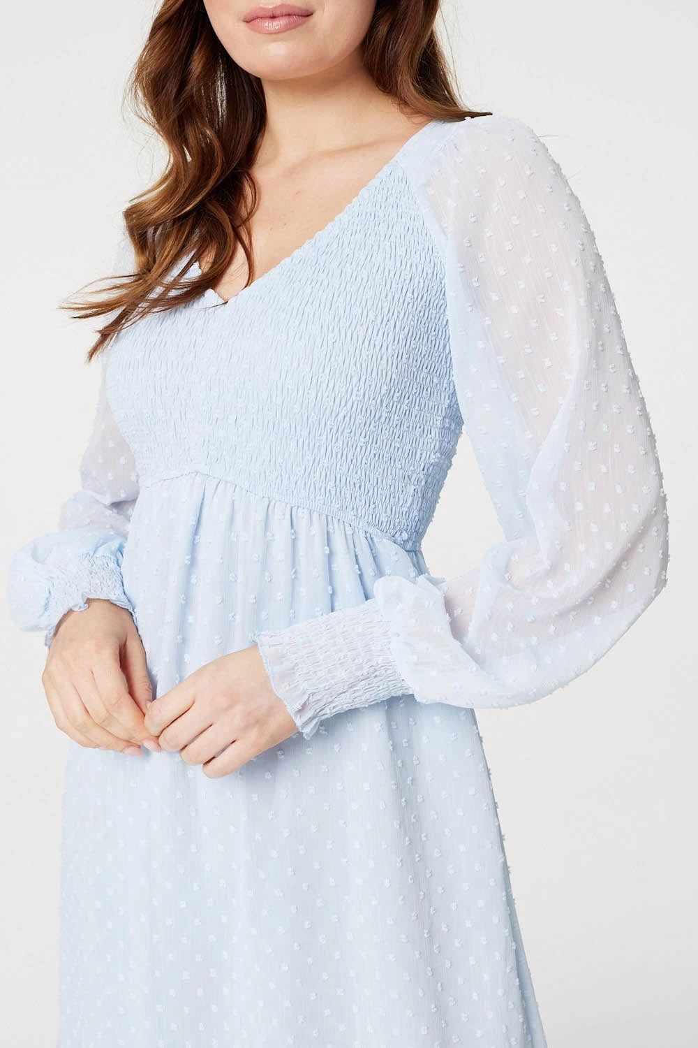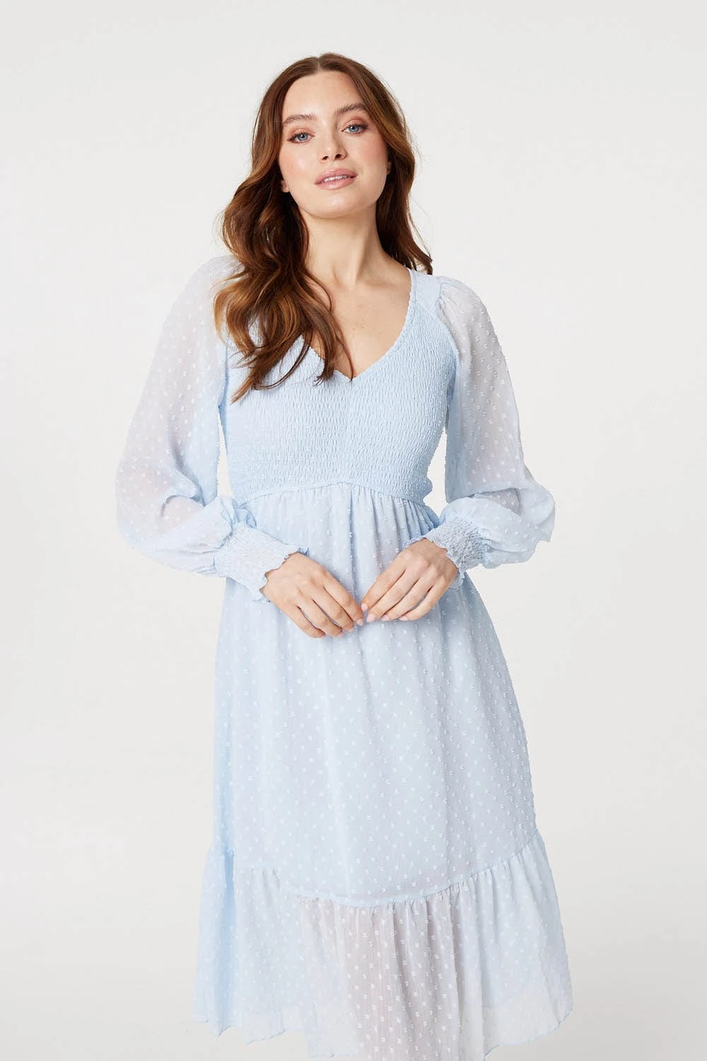 Add a lightweight dress to your warm weather wardrobe like this polka dot embossed midi. It has a v-neck, smocked bodice, long sheer sleeves with shirred cuffs and a midi length skirt. Pair with flat pumps or strappy sandals for a chic casual style.