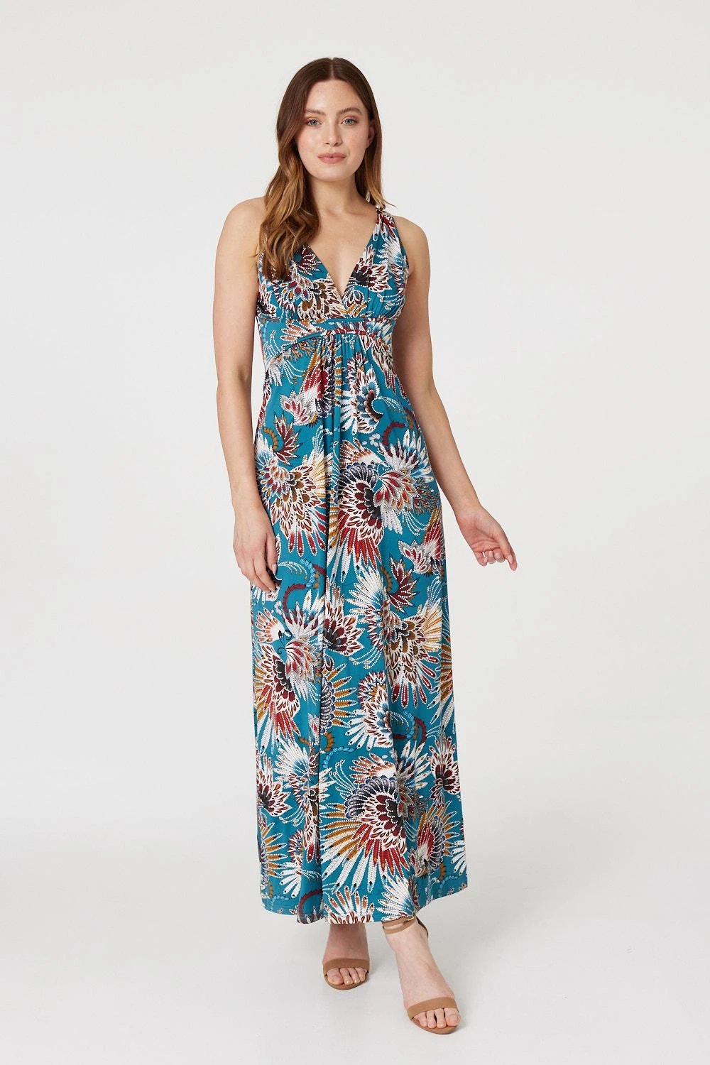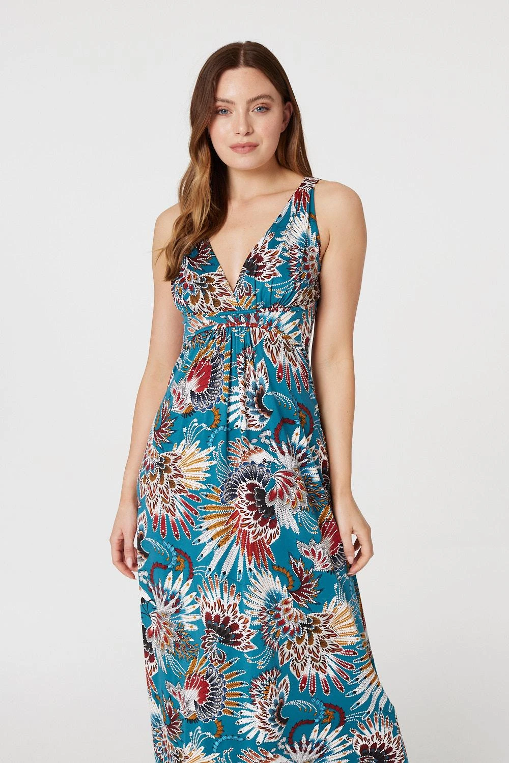 Add a bold print to your warm weather wardrobe with this feather print sun dress. It has a deep V-neck with wide cami straps, an empire silhouette and a straight maxi length skirt. Made from a soft non-iron stretch jersey fabric, it’s the perfect grab and go outfit. Pair with neutral heels for a style that’s perfect for an alfresco evening out.