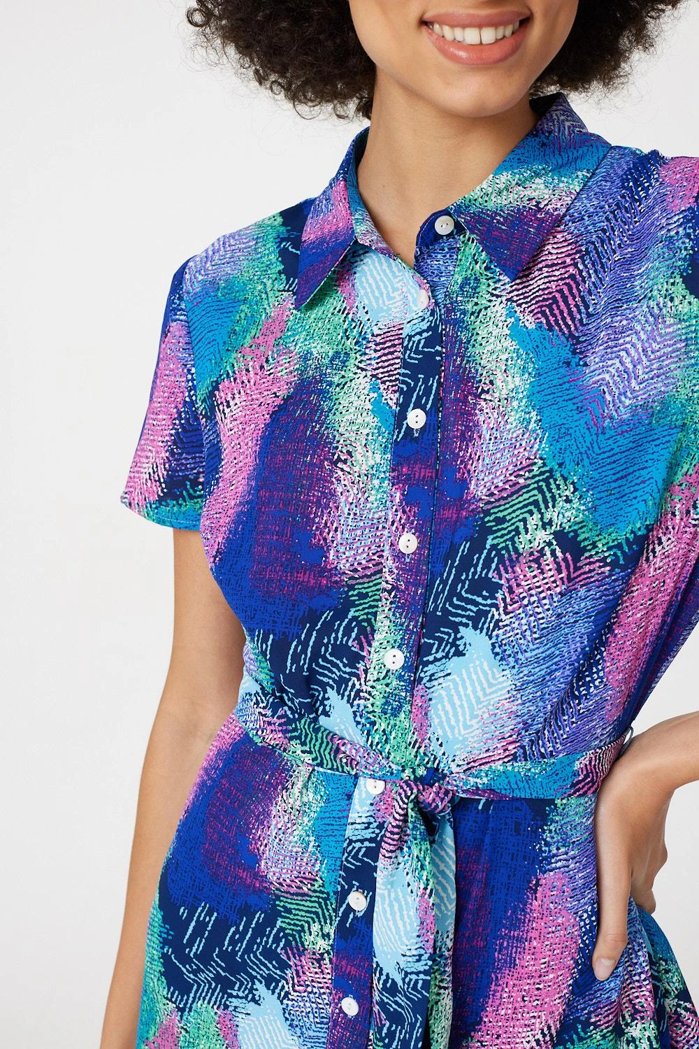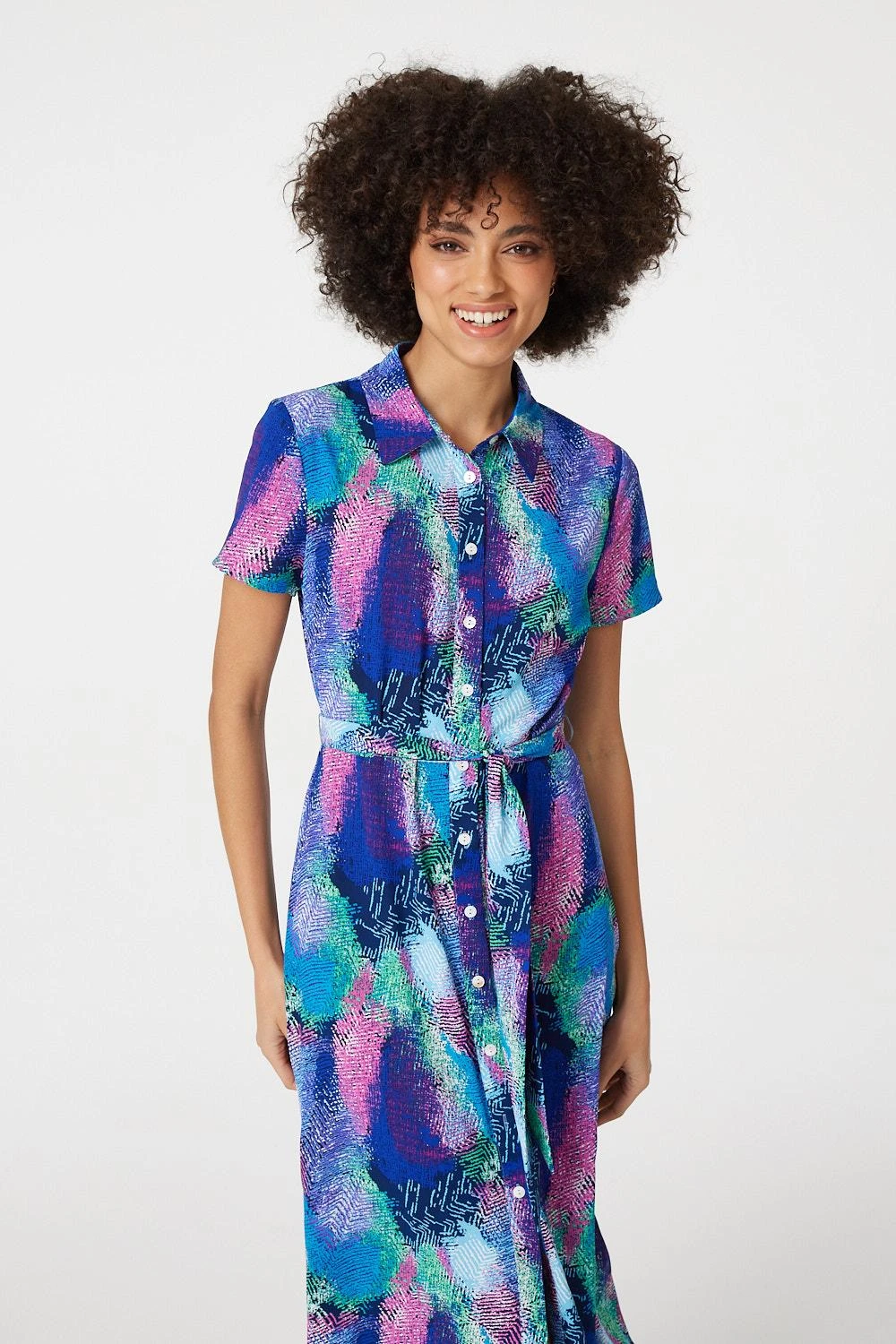 Add a vivid feather print to your holiday capsule wardrobe with this vibrant maxi shirt dress. It has a collar, v-neck, button front, short sleeves, a removable self tie belt and an a-line maxi length skirt. Pair with flat sandals or elevate with heeled wedges for a standout warm weather style.