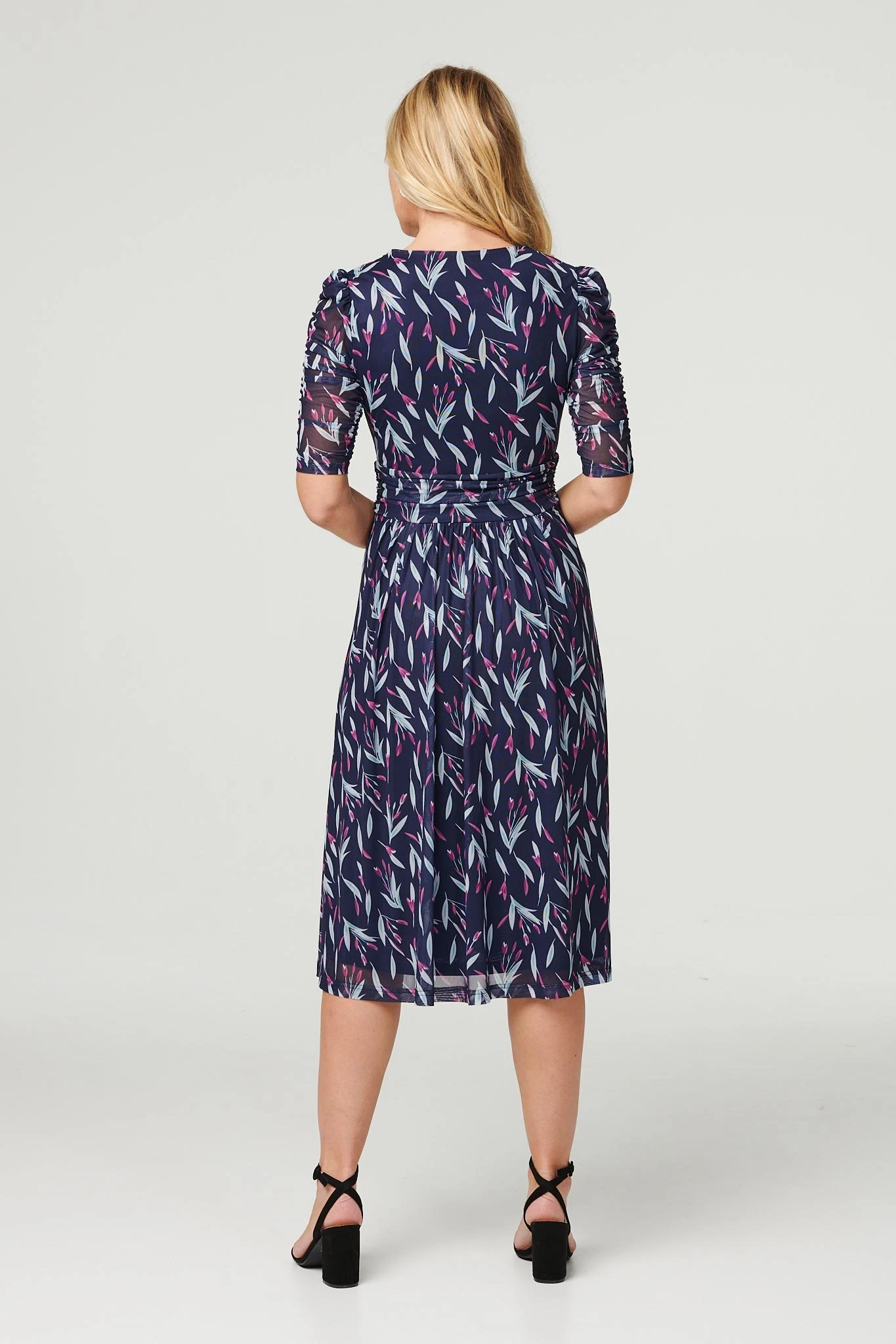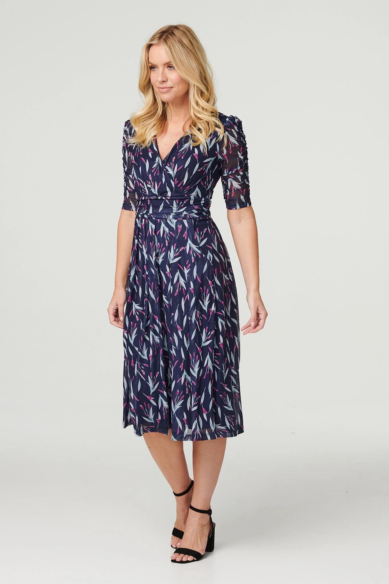 Every capsule wardrobe needs a go-to occasion dress like this one. It has a v-neck, 1/2 sleeves a faux wrap front with a ruched waist detail and a straight midi length skirt. Pair with neutral heels for an elegant style you can wear on repeat to almost any event.