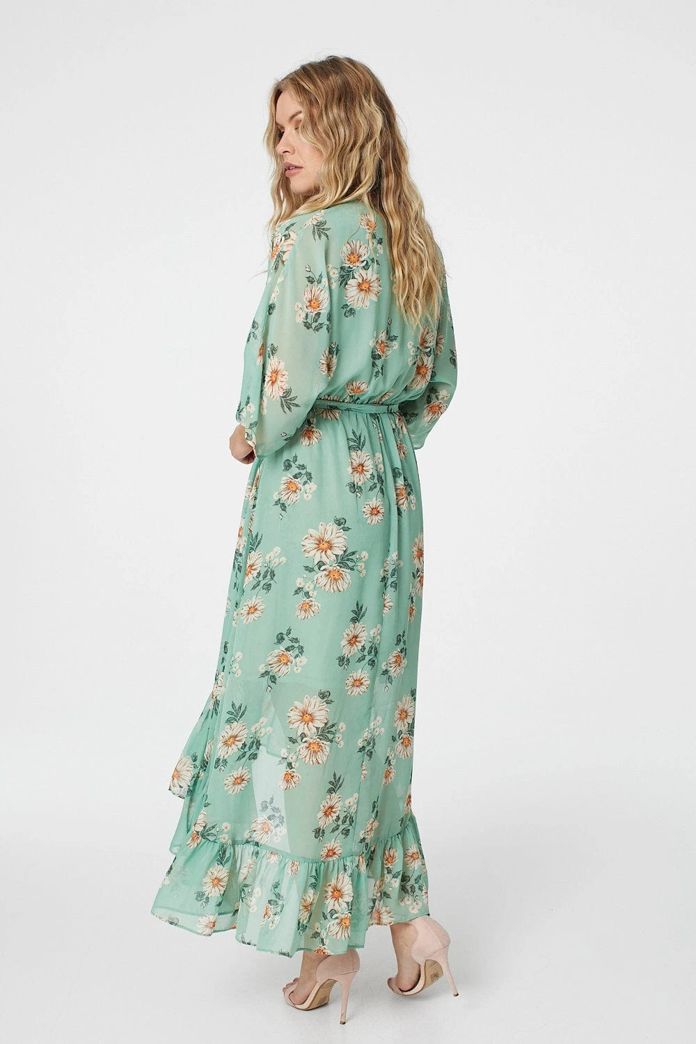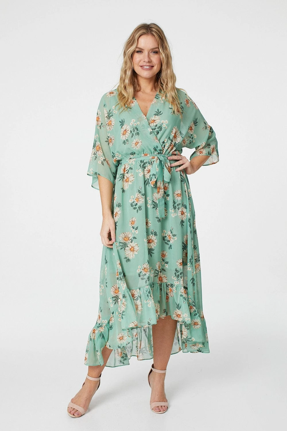 No warm weather collection is complete without a floral wrap dress. With a deep v-neck, batwing 3/4 sleeves with a semi sheer detail, a tie waist and a pephem midi skirt with a high low cut. Style with heeled wedges for an outdoor event or dress down for a sunshine break with sandals.