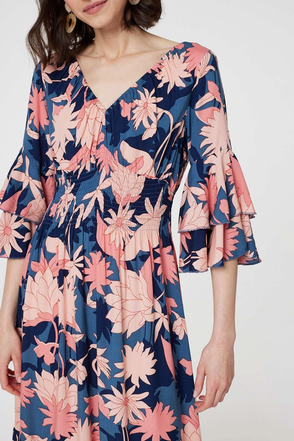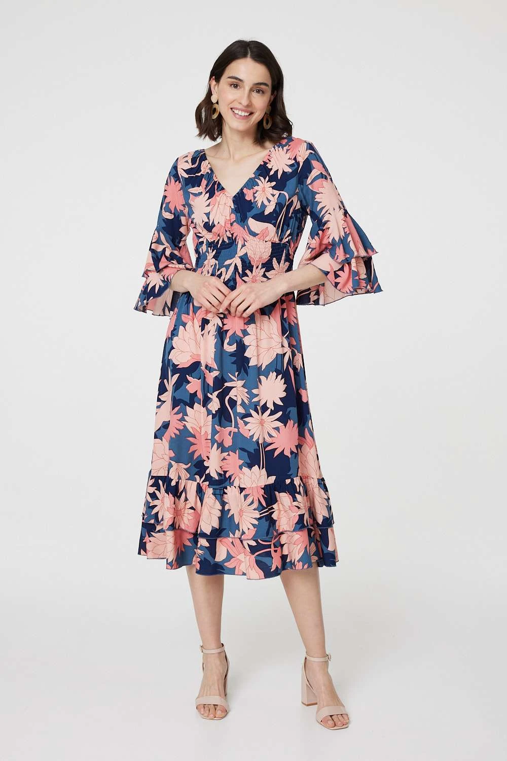 Feel confident and look great in this classic midi dress. It has a flattering v-neck and ruffled details, with 3/4 sleeves and a midi length hem. Whether you’re dressing up for a formal event or styling it more casually for a day out, you’re sure to turn heads in this beautiful midi.