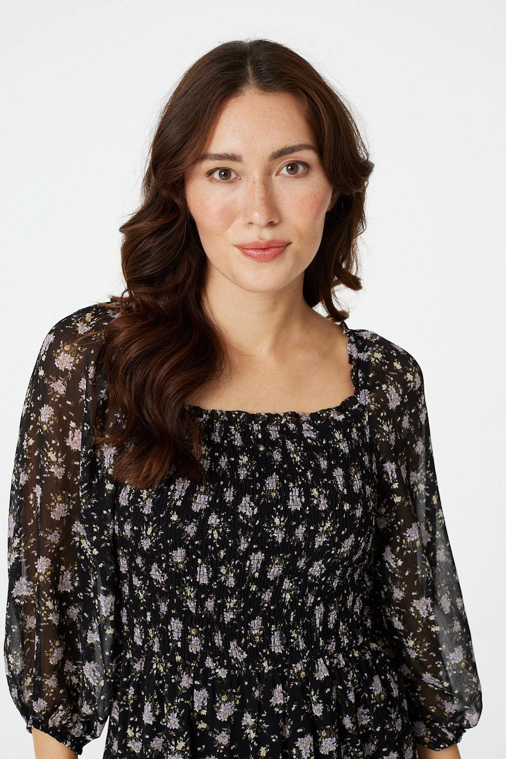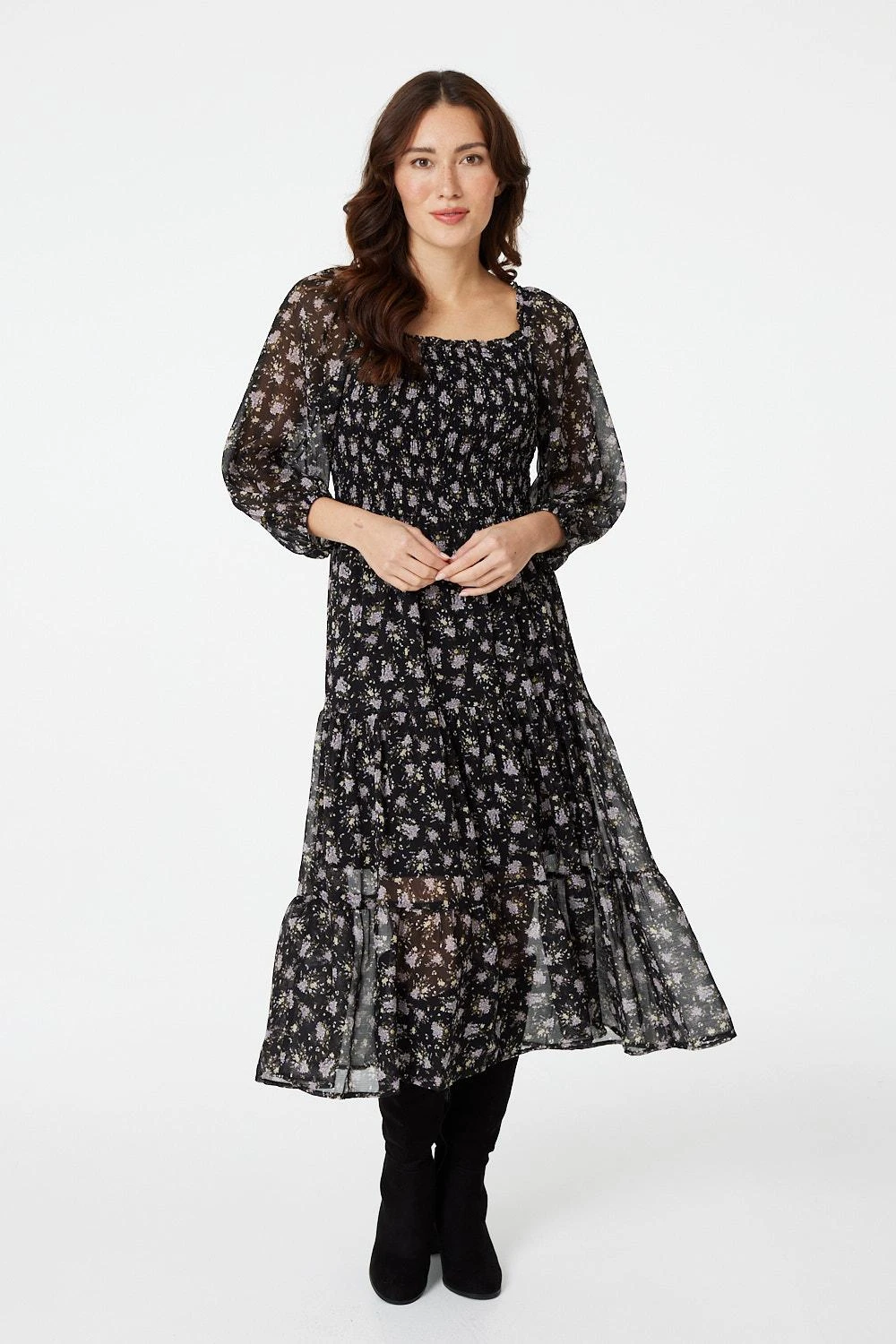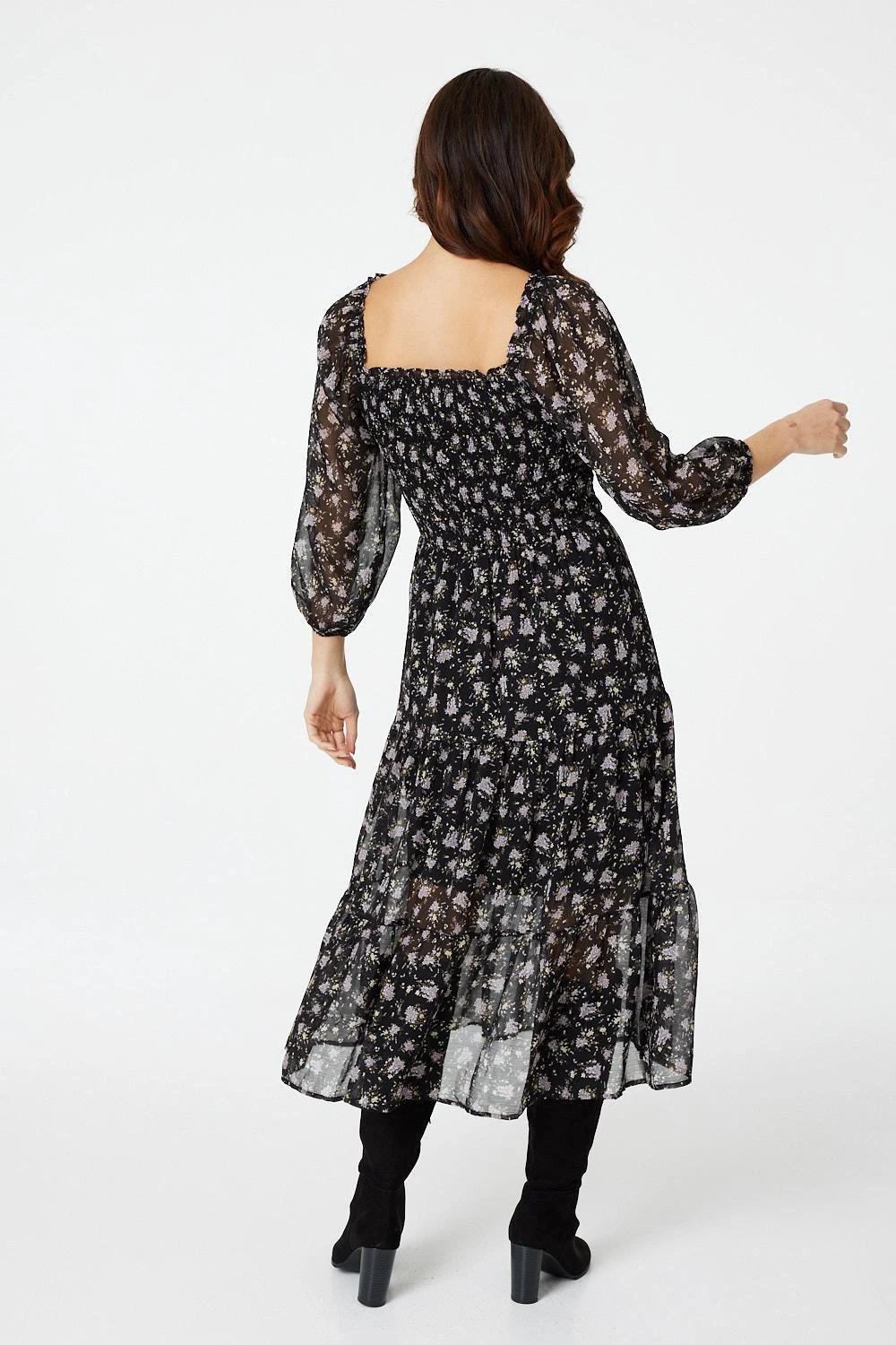 No closet is complete without a delicate floral midi dress. With square neck, 3/4 semi sheer sleeves, a smocked bodice and a flattering tiered midi skirt. This dress can also be worn as a bardot style with the sleeves dropped off the shoulder for a summery look. Style with heeled boots and tights when the weather turns cold or pair with heeled wedges when the sun is shining.