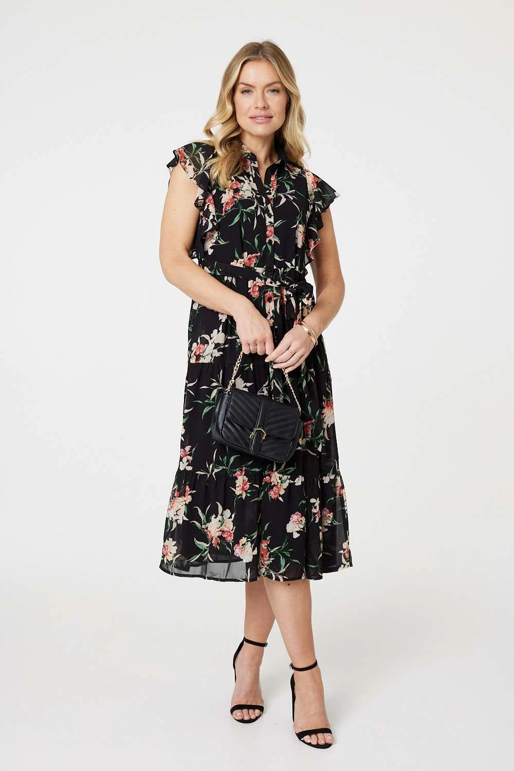 Add a bold floral shirt dress to your closet with this midi look. With a classic collar, a button front, sheer cap sleeves, a tie detail belt and an a-line midi skirt. Style with black heeled wedges for a chic holiday ready outfit.