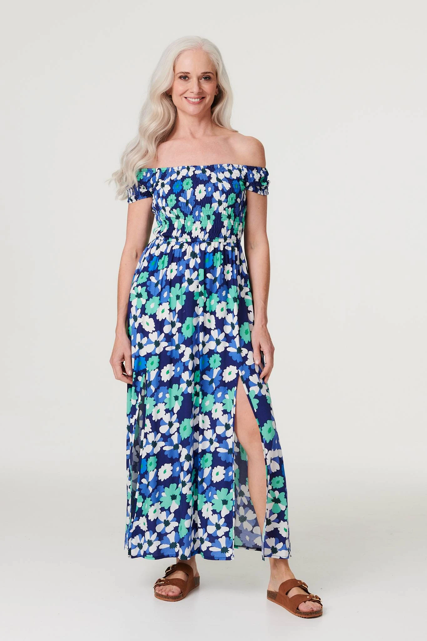 Get sunshine-ready wearing this fresh summer dress. It has a Bardot neckline, smocked bodice, side split and maxi length hem. Make the most of that beautiful off-shoulder neckline by accessorising with your favourite statement necklace.