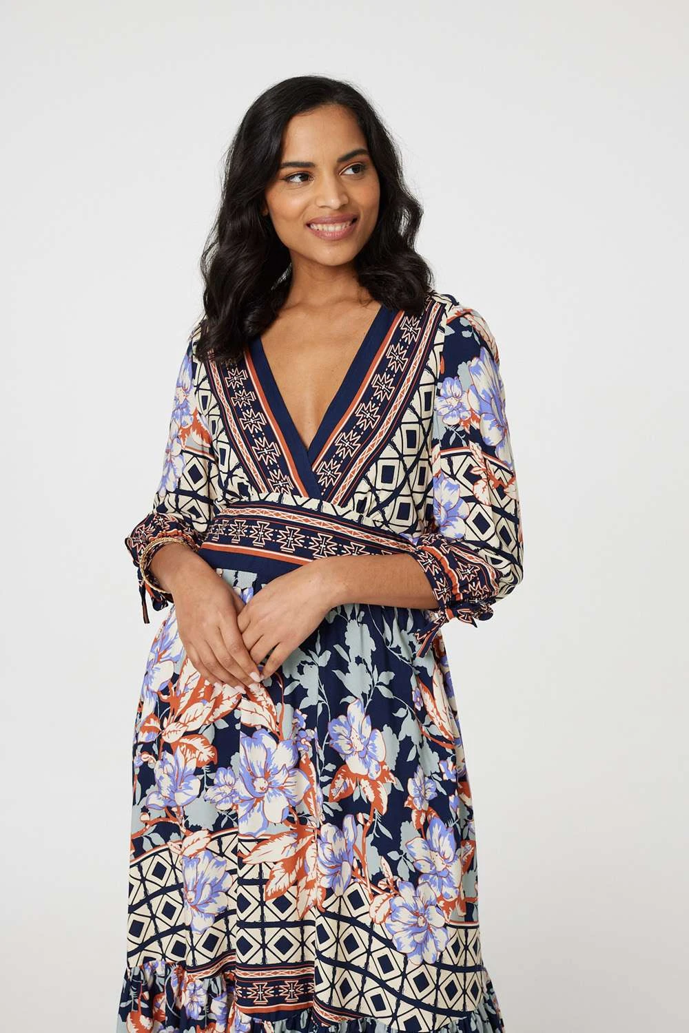 Stand out in a bold print with this floral midi dress. It’s made from 100% viscose so you’ll stay cool while looking stylish, and has a flattering v-neck with 3/4 tie sleeves. It has an empire waist and tiered midi length hem for a laid-back look that’s beautiful on all figures.