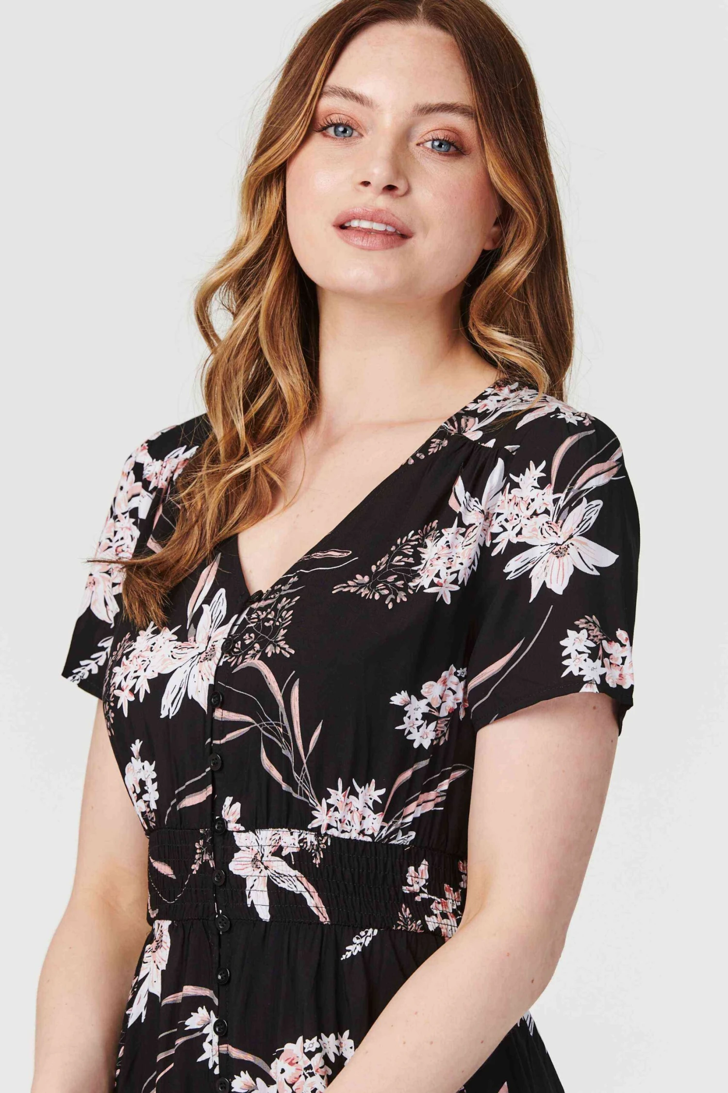 No dress collection is complete without a tropical floral a-line maxi dress. With a v-neck, button front, short sleeves, pockets and a full a-line maxi skirt. Style with strappy heels for a daytime event or with flat sandals for a chic vacation outfit.