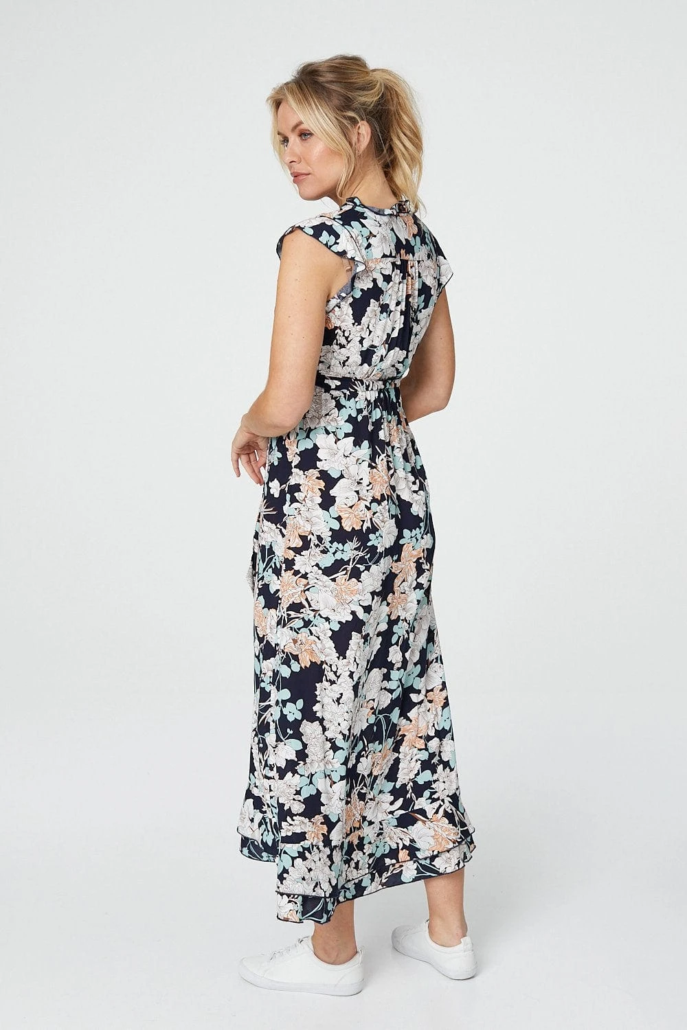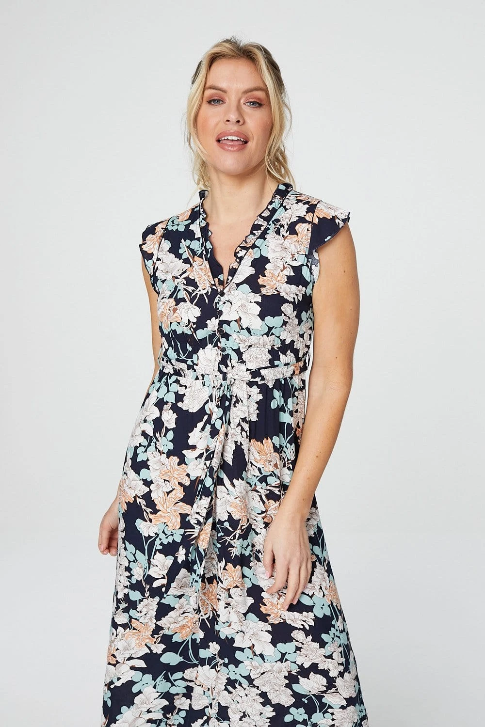 Everyone needs a classic floral midi dress like this empire waist dress. With a frilled v-neck, a button detail front, a removable belt, and a midi length skirt with a pephem detail. Dress down with trainers or dress up with nude heels.