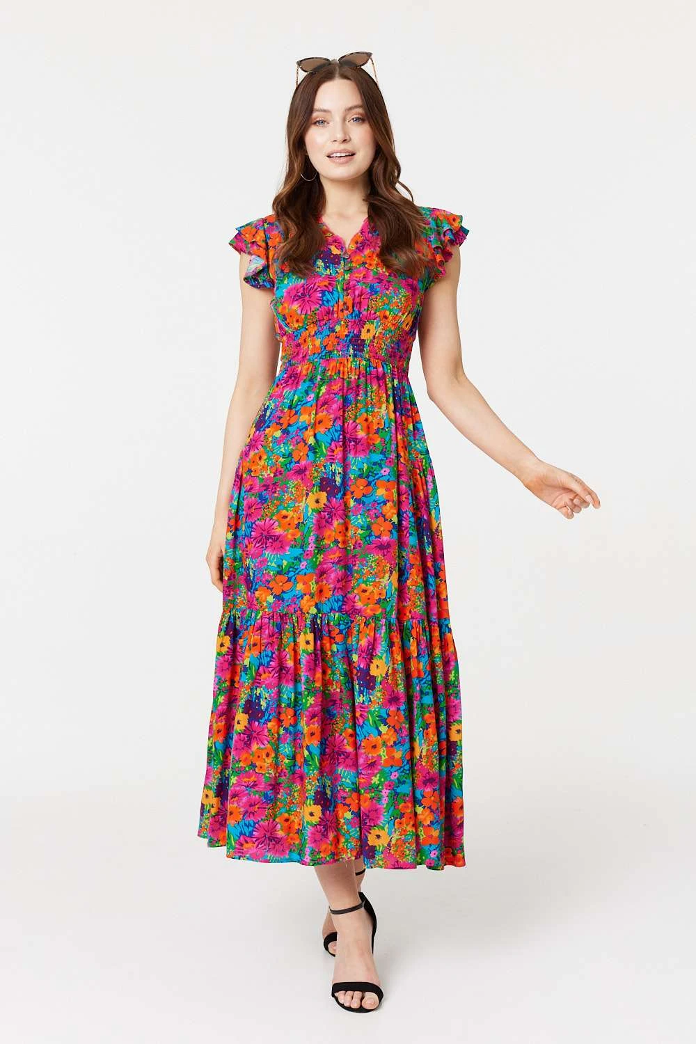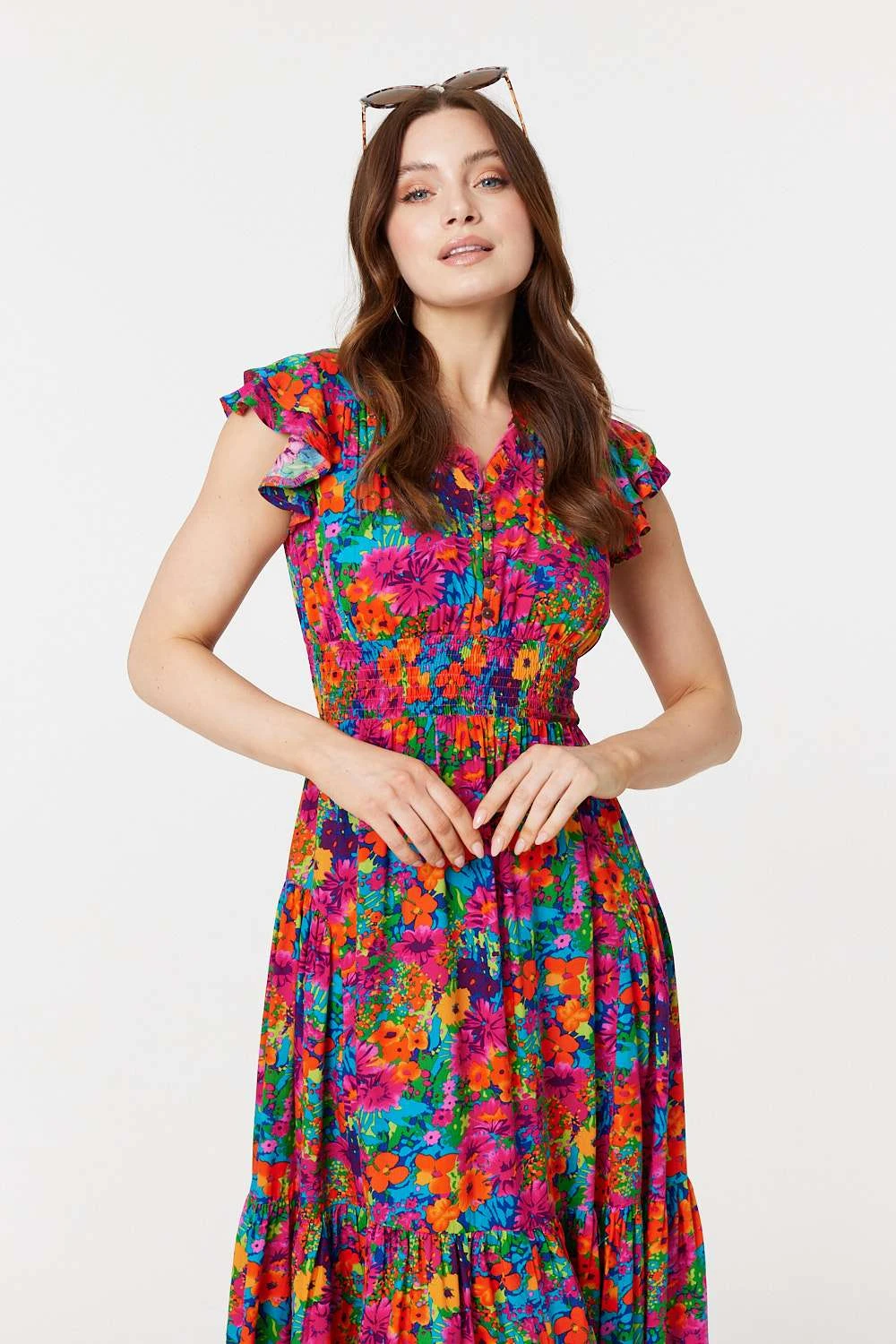 Add some colour to your summer wardrobe with this midi dress, featuring a shirred waist and frilled cap sleeves. It also has a v-neck, buttons and a tiered midi length hem – prefect for pairing with trainers for a casual look, or heels for a night out.