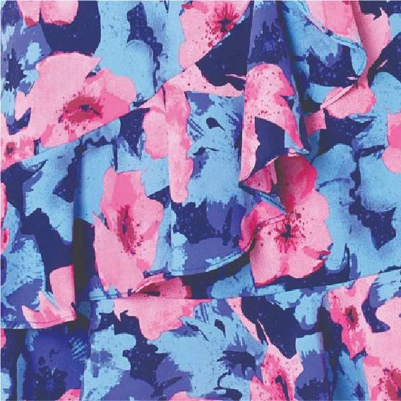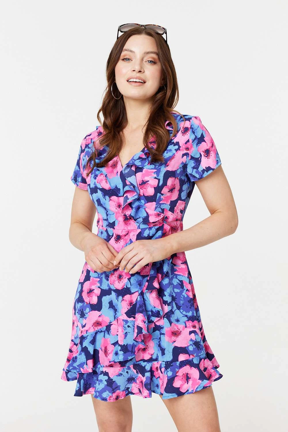 Brighten up your seasonal wardrobe with this floral dress. It has a short length layered hem with a frill detail, as well as a frilled v-neck. The faux wrap fit compliments all body shapes. Stay cool with short angel sleeves in the summer, too.