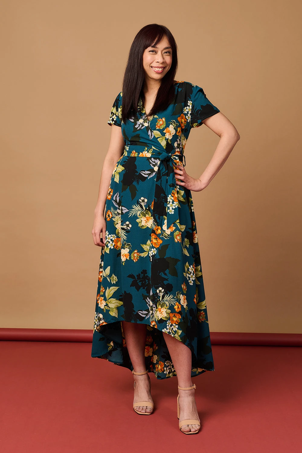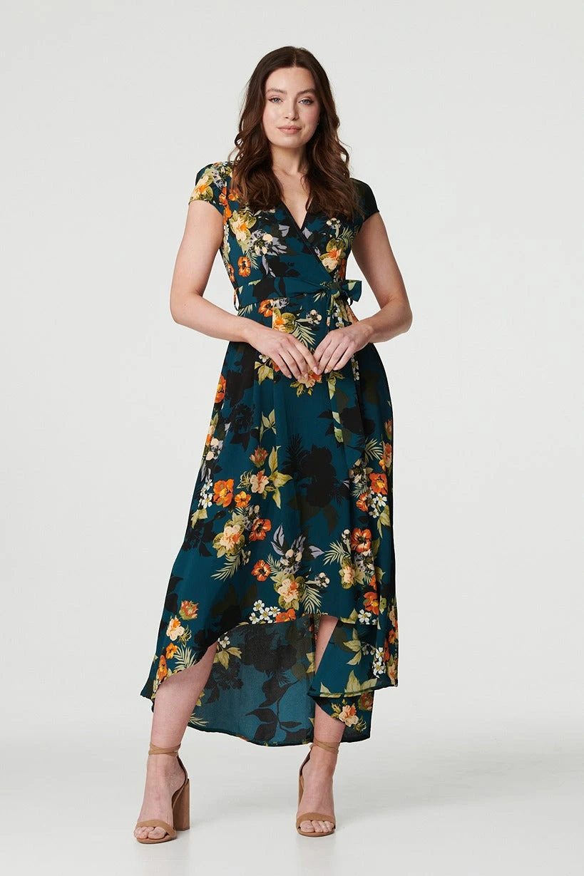 Turn heads in this dramatic floral maxi dress. It has a v-neck, faux wrap front, self tie belt, short cap sleeves, a zip back and a maxi length skirt with a high low hemline. Pair with strappy heels neutral strappy heels to make a style statement at any occasion.