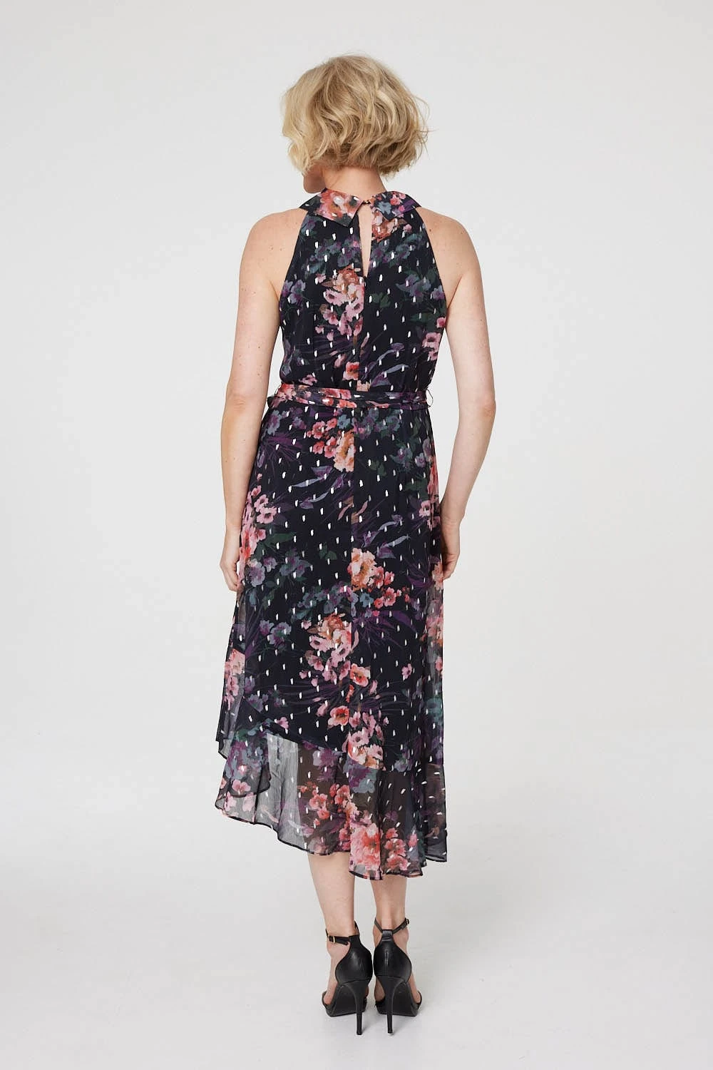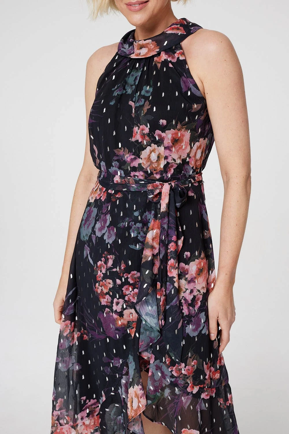 Add a pretty floral print to your wardrobe with this midi wrap dress. It has a high neck with a keyhole back fasten, a sleeveless fit, self-tie waist and an asymmetric wrap front midi length skirt. Pair with strappy heels for an elegant style that’ll look chic at any occasion.