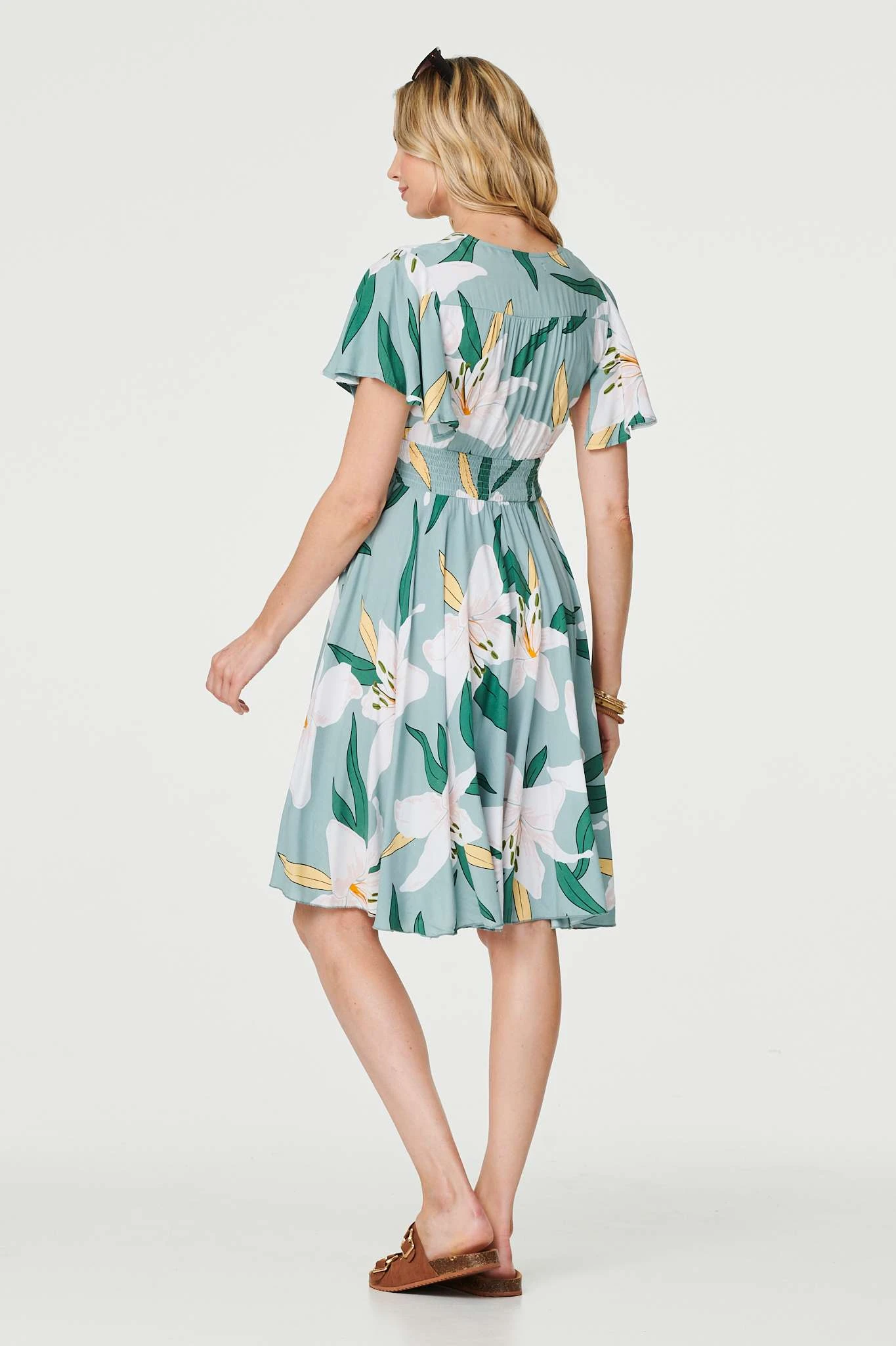 Feel summery and comfortable in this knee length dress. It has a v-neck with button details, 1/2 angel sleeves with splits, a shirred waist and a knee length skater skirt. It’s perfect for warm days when you want to feel a breeze on your skin.