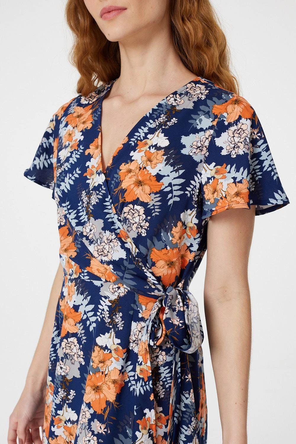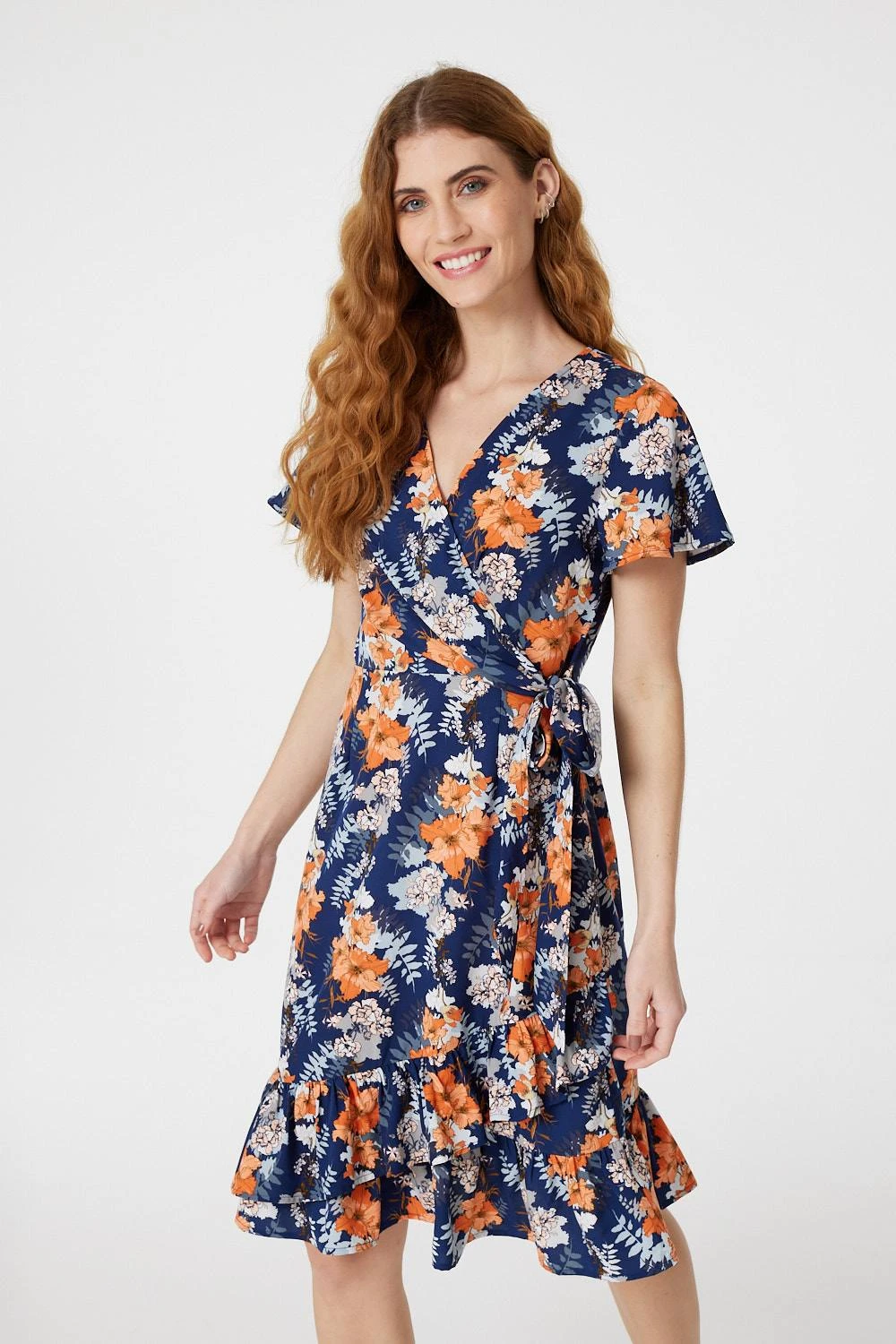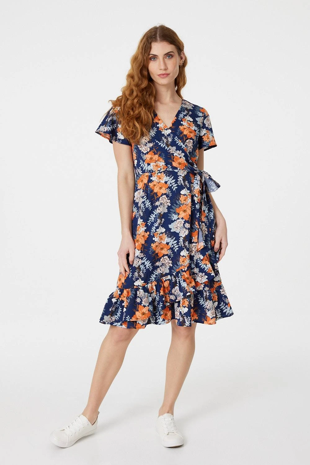 Every collection needs an uplifting printed skater dress like this floral look. With a v-neck, short sleeves, a wrap front, tie waist, wrap skirt and a knee length pephem detail. Style with trainers and a denim jacket for a casual off-duty outfit or add ballet pumps for a polished office friendly look.