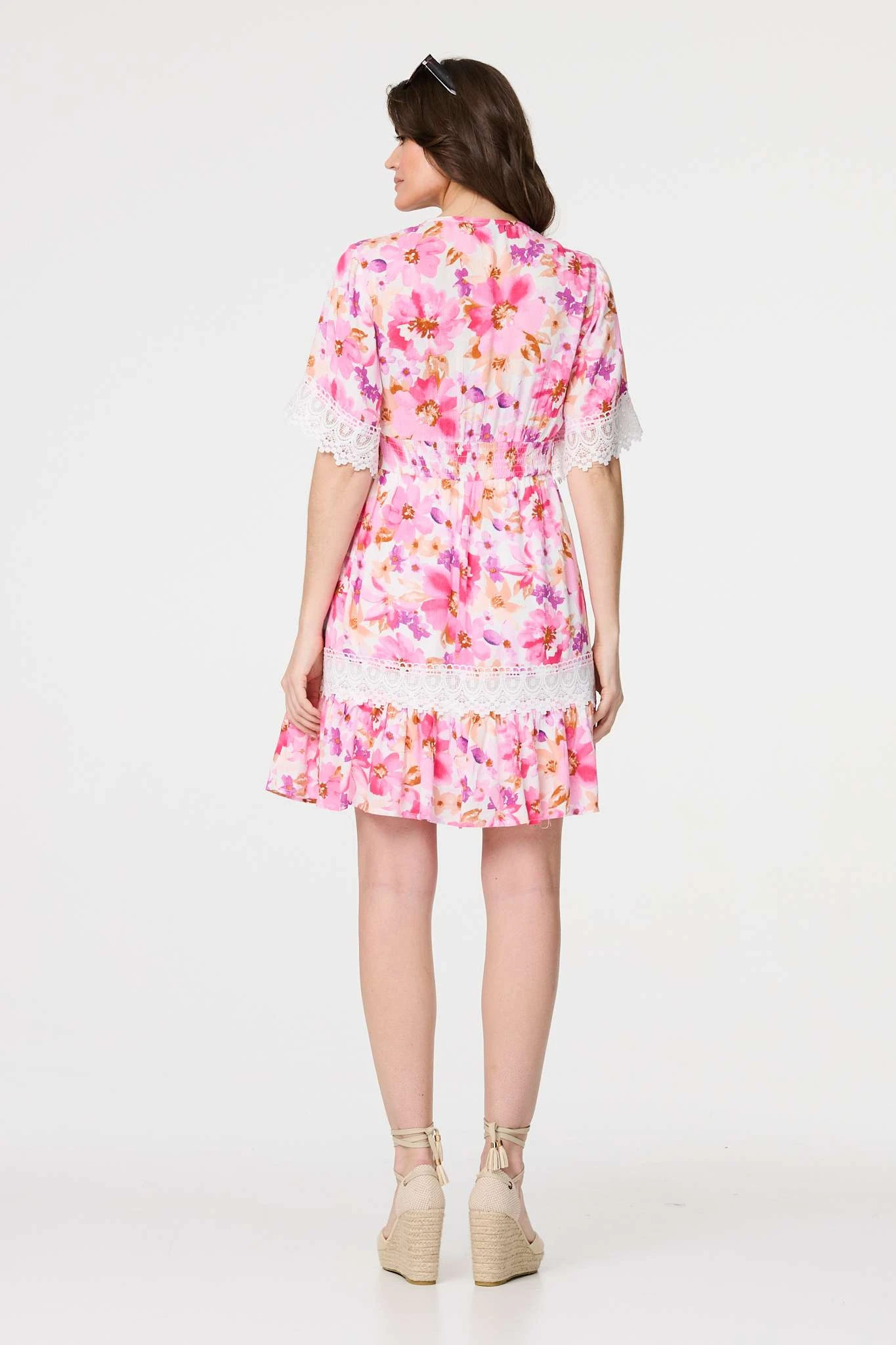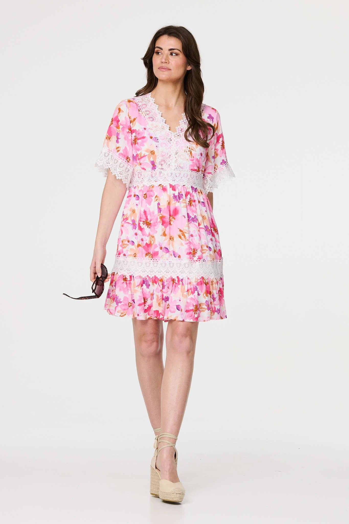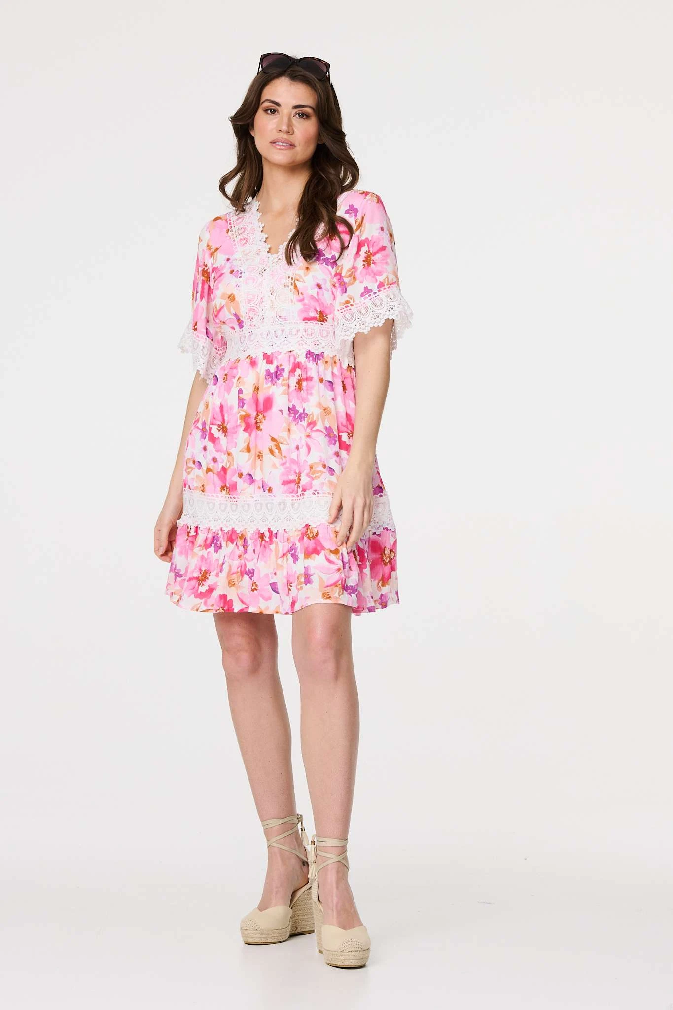 Look effortlessly stylish this summer wearing this floral dress. It has beautiful lace panels around the neck and sleeves, with a flattering empire waist. It’s also made from 100% viscose for a comfortable and cool fit, even on hot days. This dress comes complete with v-neck, 1/2 sleeves and a short length hem.