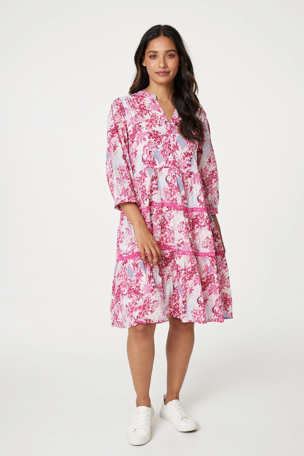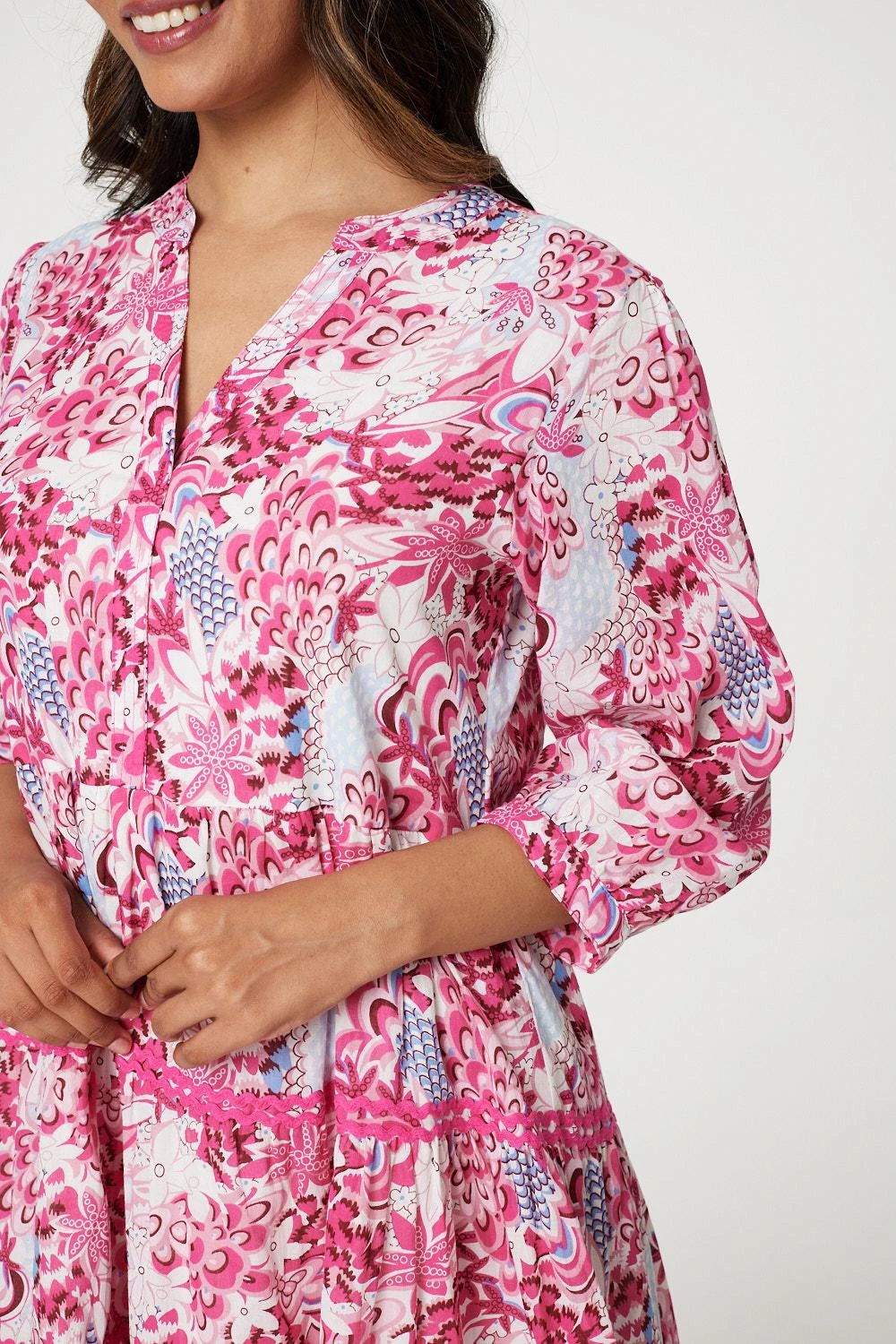 Add a vibrant floral print to your wardrobe with this collarless short dress. It has a v-neck, 3/4 sleeves, relaxed fit and a tiered short skirt with a pretty lace trim. Made from 100% cotton, it’s a great breathable style to keep you cool on a warm day. Pair with neutral heels for a chic daytime look.