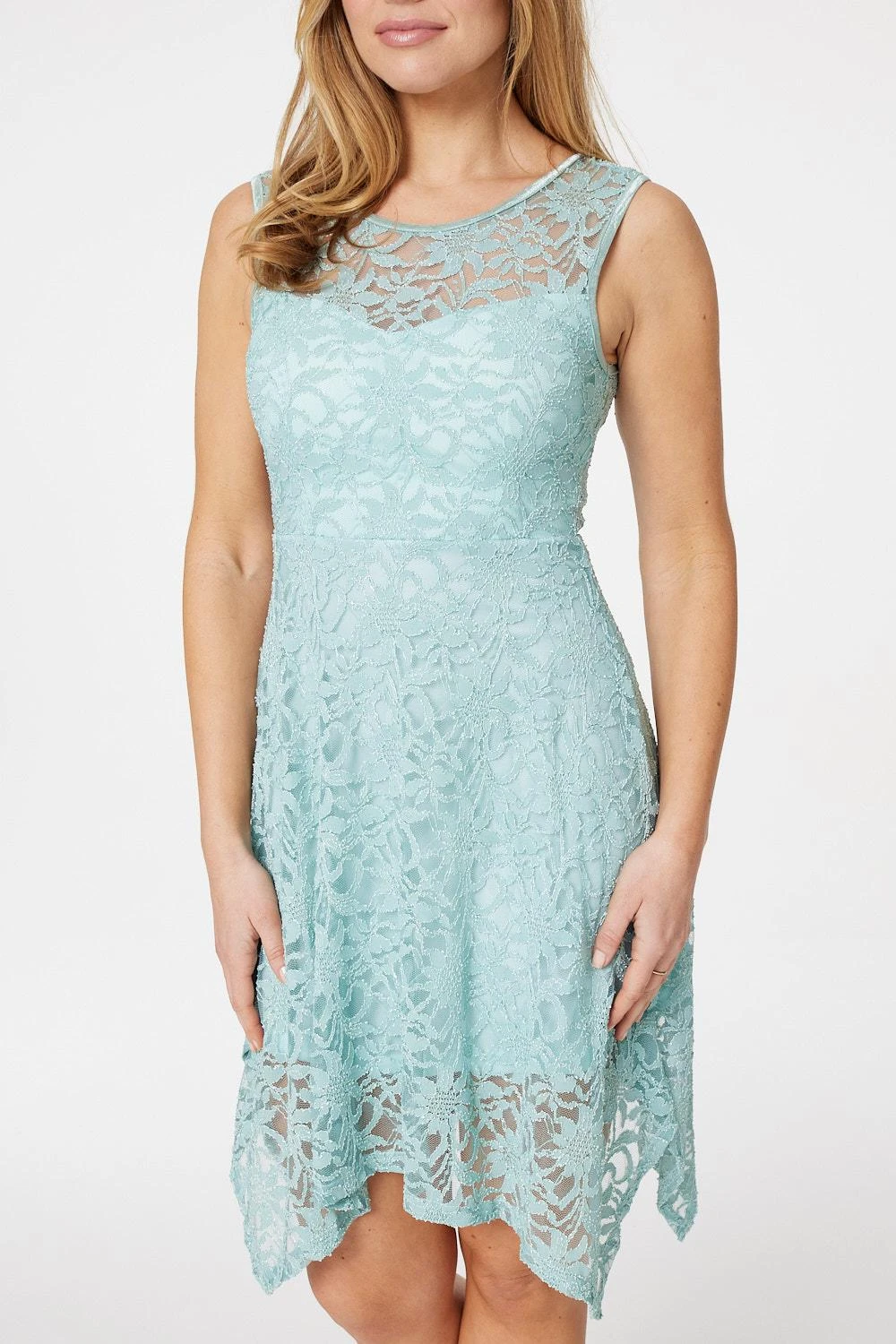 Every wardrobe needs a go-to occasion frock like this floral lace skater dress. It has a round neck, a back zip closure, a delicate hanky hemline and a short skirt. Style with neutral strappy heels for a perfect party ensemble.