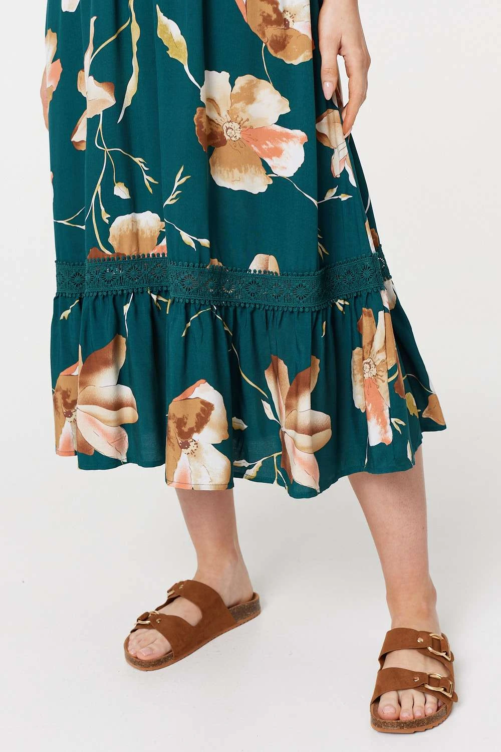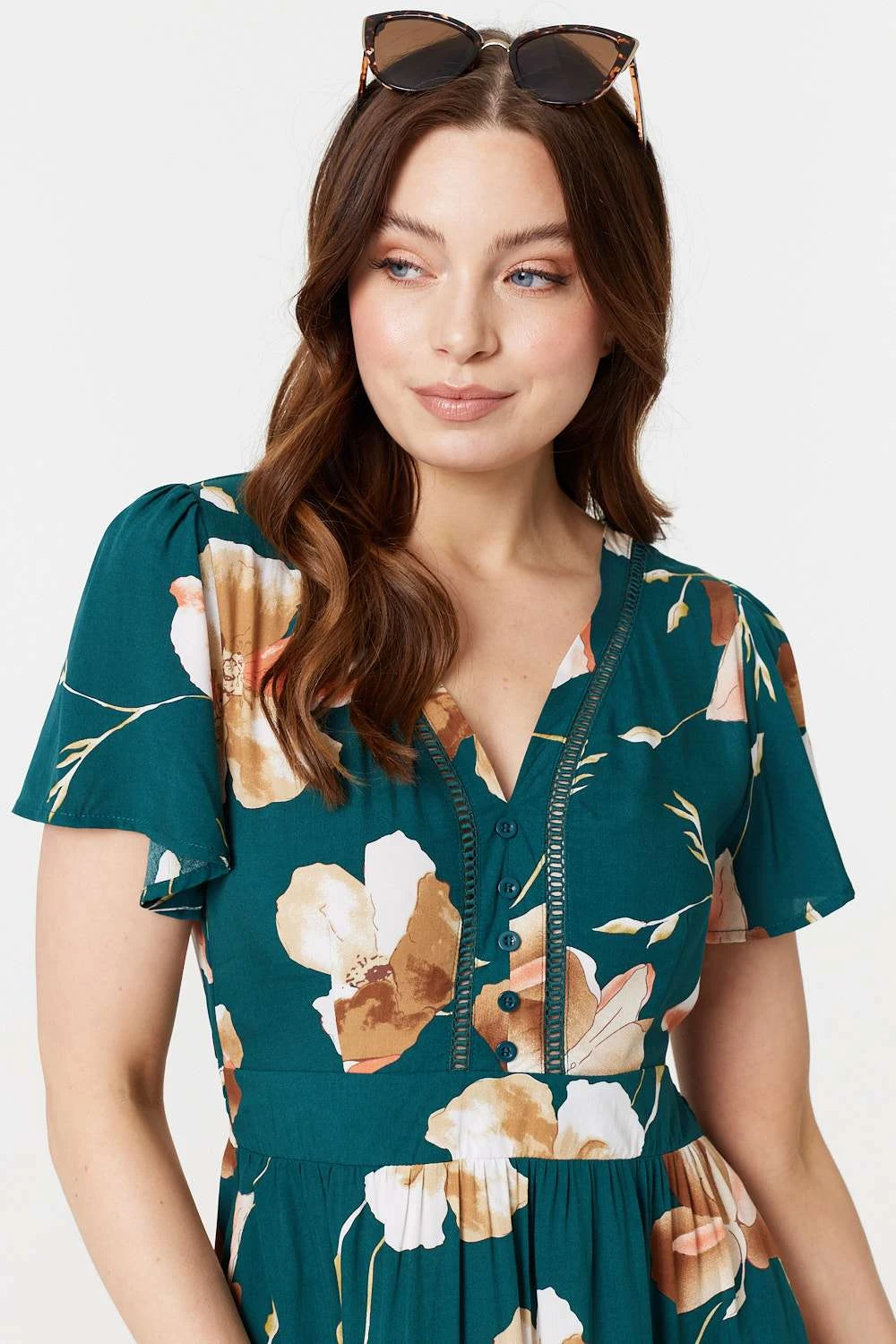 For a classic look that will never go out of style, try this lace trim midi dress. Complete with hidden pockets, this dress has a flattering v-neck, short angel sleeves, lace details and a ruffled midi length hem. It can be dressed down for a casual day out, or dressed up as the perfect wedding guest outfit.