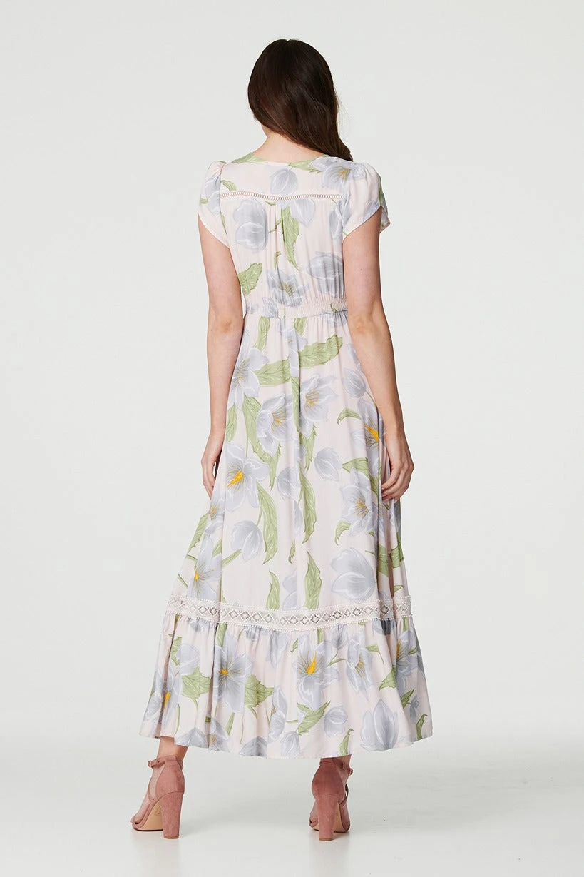 You’ll certainly suit summer in this floral dress. It has a relaxed fit with a shirred waist to keep you cool even on a hot day. This dress has buttons, short tulip sleeves and a v-neck – but the real drama happens on the skirt which includes lace details, a front split and a frill maxi length hem.