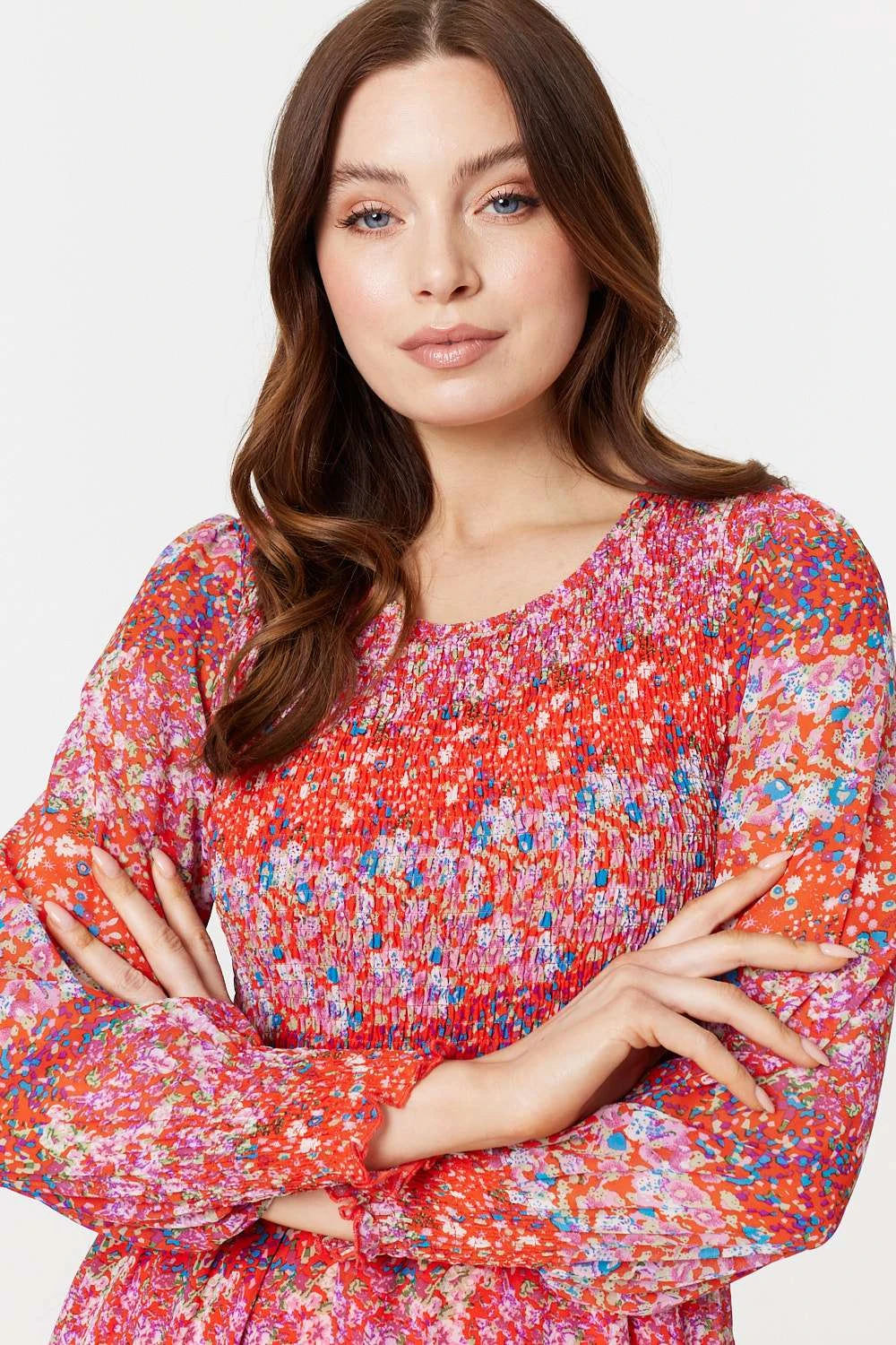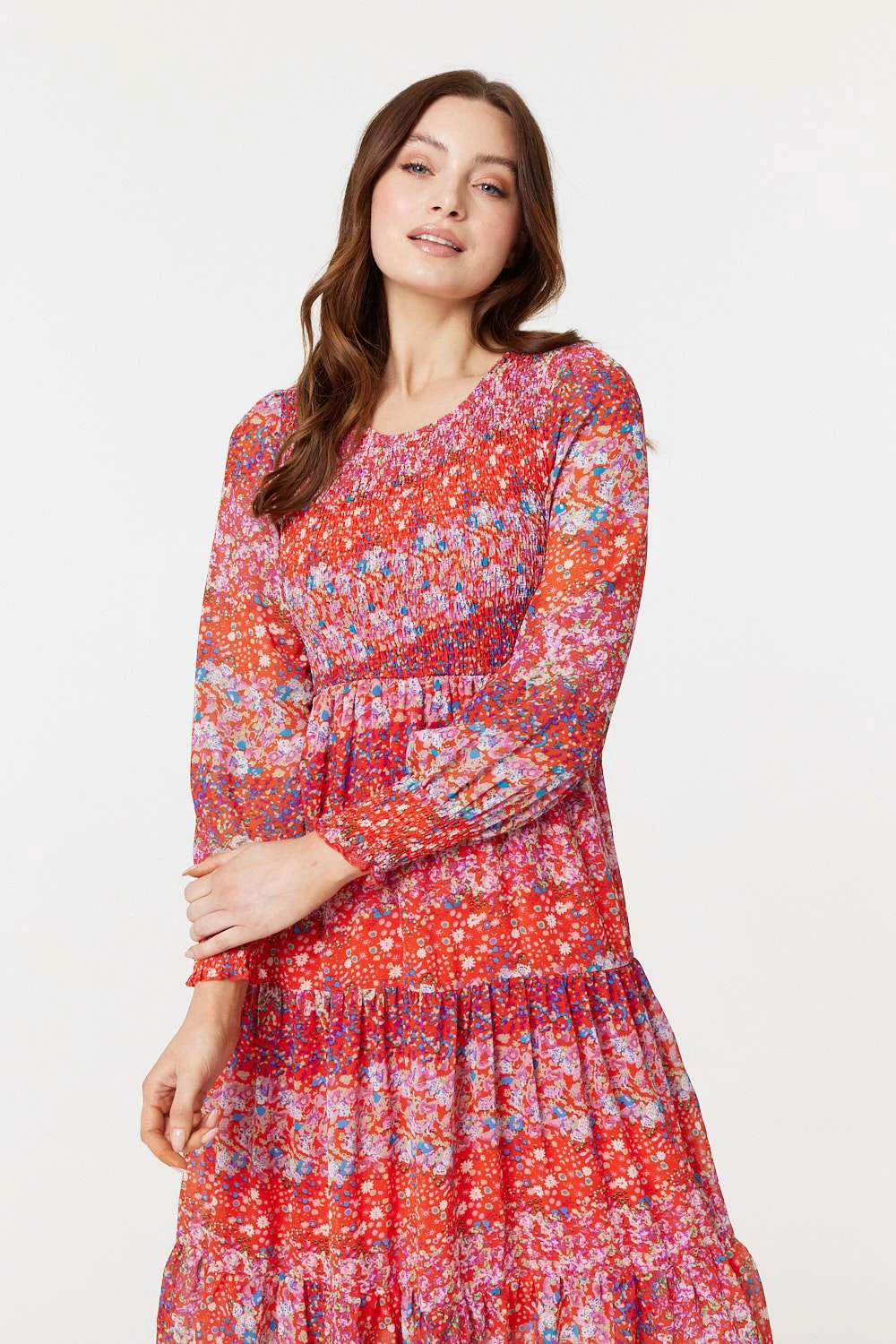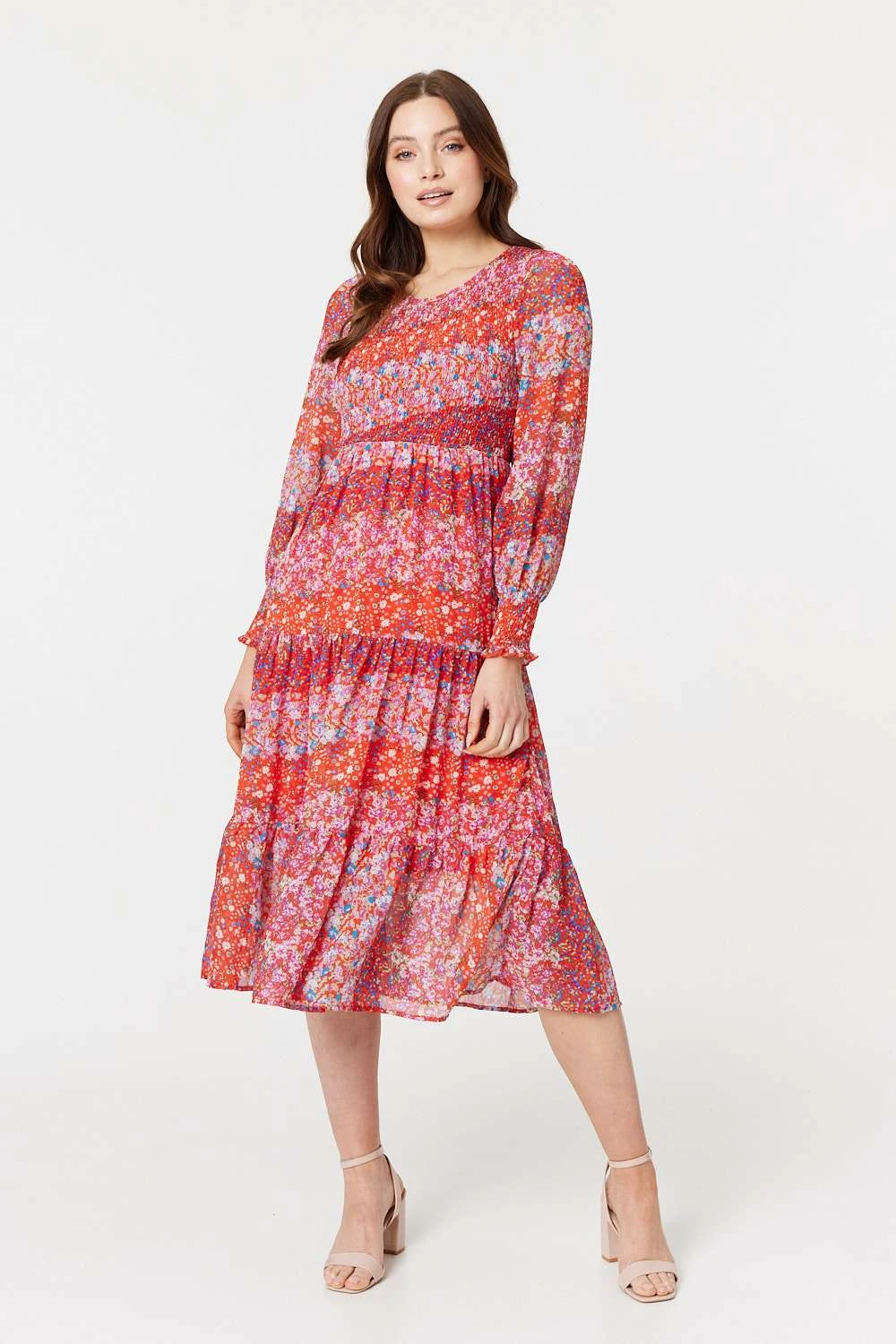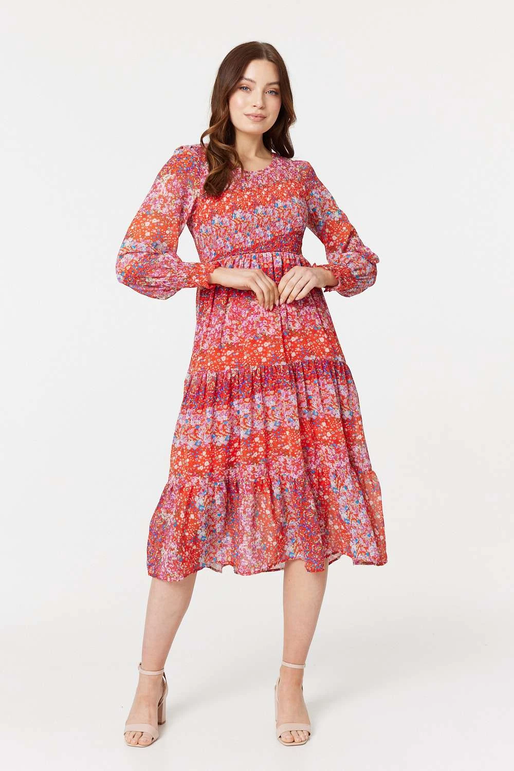 For a silhouette that’s as timeless as it is stylish, you can’t go wrong with this smock dress. It has a round neck, shirred bodice, long puff sleeves with cuffs and a tiered midi skirt. You’re sure to feel confident when you feel this dress float across your skin.