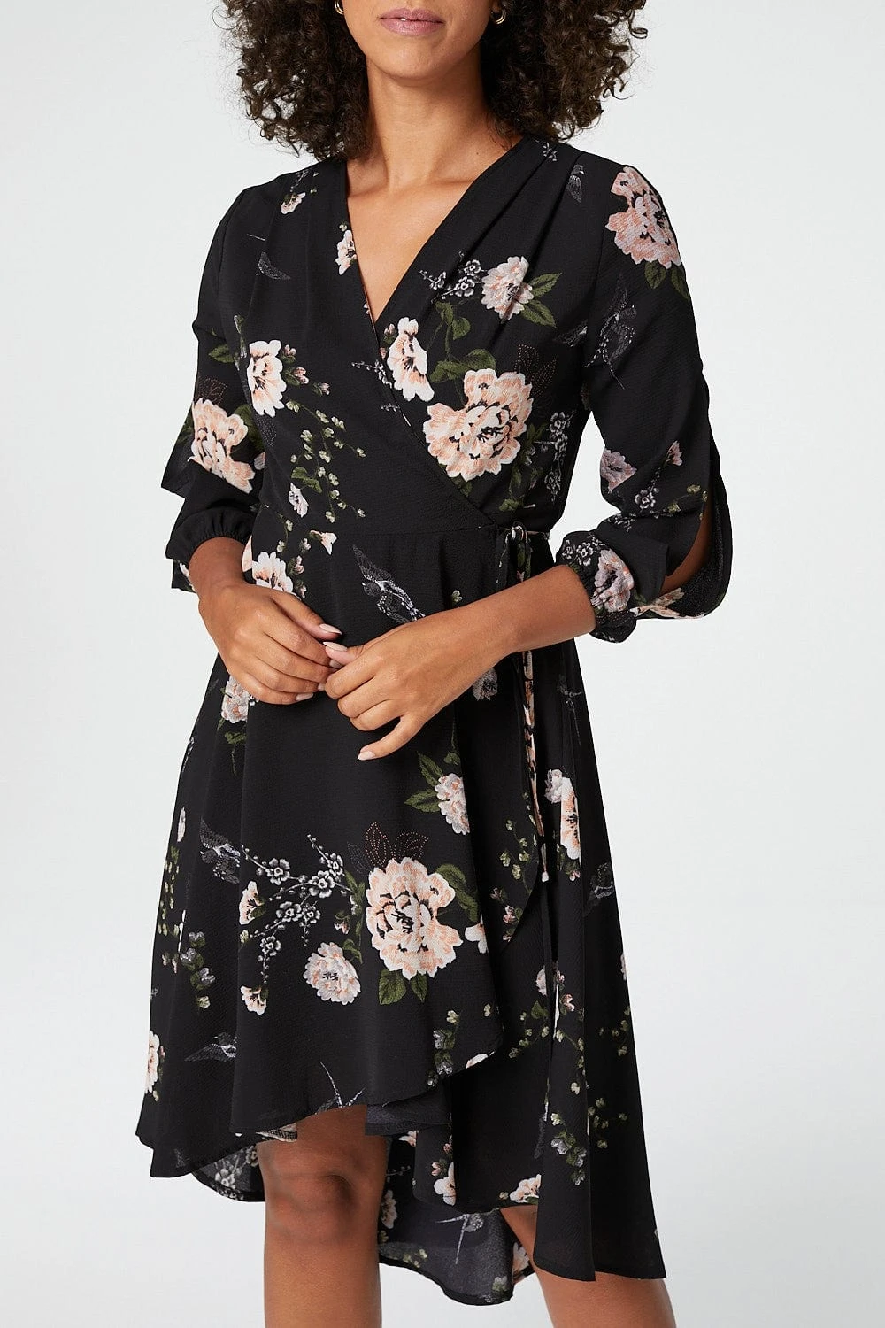 Stay on trend in this floral wrap dress. With a b-neck, 3/4 split detail sleeves, a tie waist and a high low flared skirt sitting at the knee. Pair with strappy heels for a polished wedding guest look.