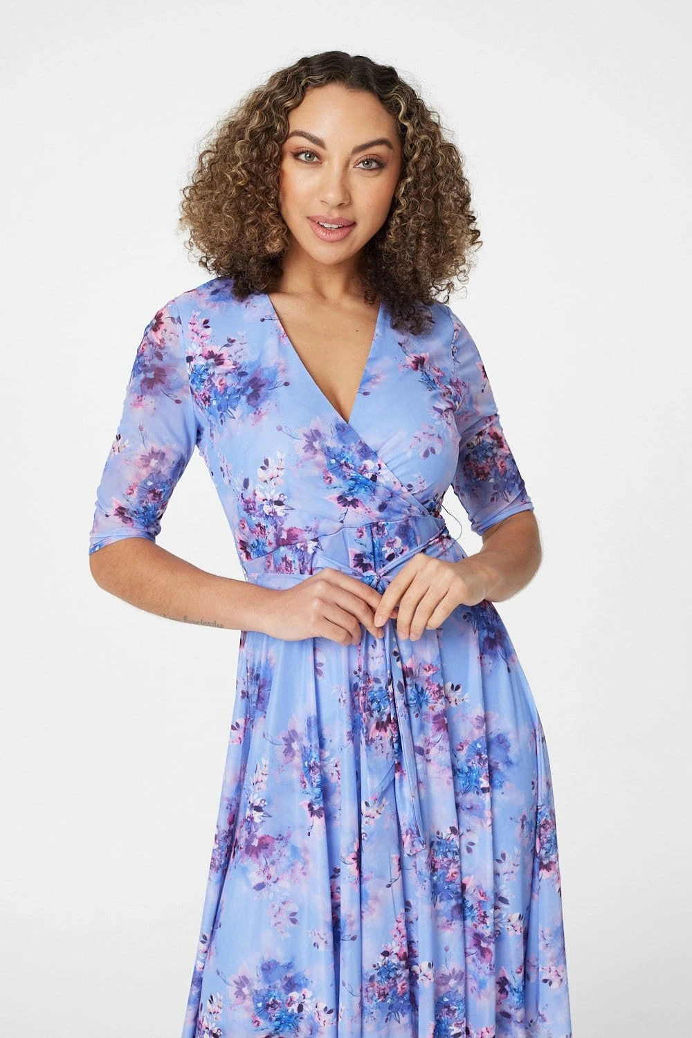 Add a pretty floral tea dress to your closet with this mesh wrap midi. It has a V-neck, wrap front, self tie waist, 1/2 sleeves and a hanky hem midi skirt. Pair with strappy neutral heels for a chic daytime occasion look.