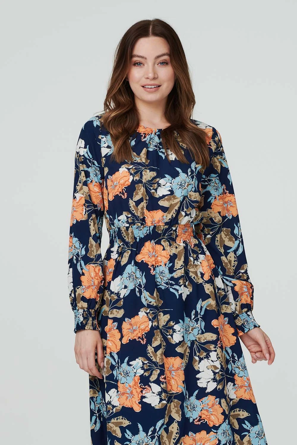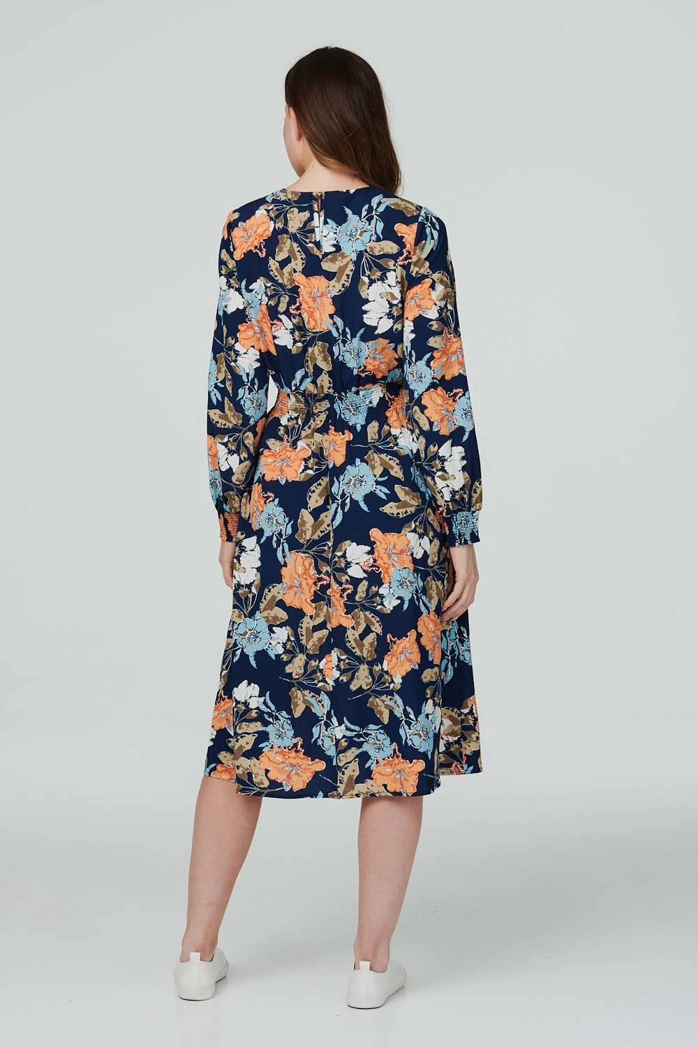 Add a pretty floral tea dress to your wardrobe with this shirred midi. It has a round neck with a front pleat detail, a shirred waist, long sleeves with shirred cuffs, a keyhole back and a midi skirt. Pair with neutral flats or trainers for a casual but chic weekend style.