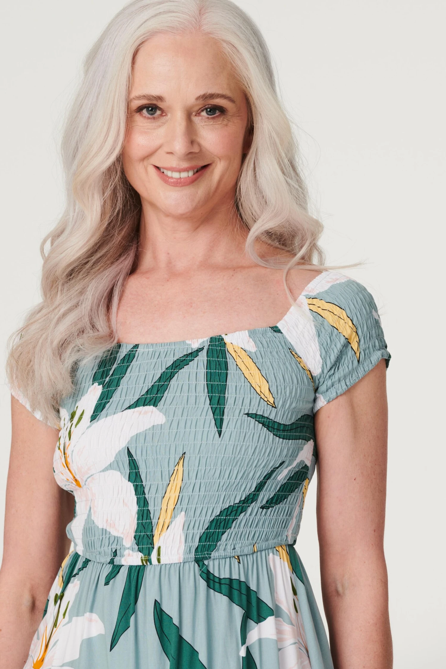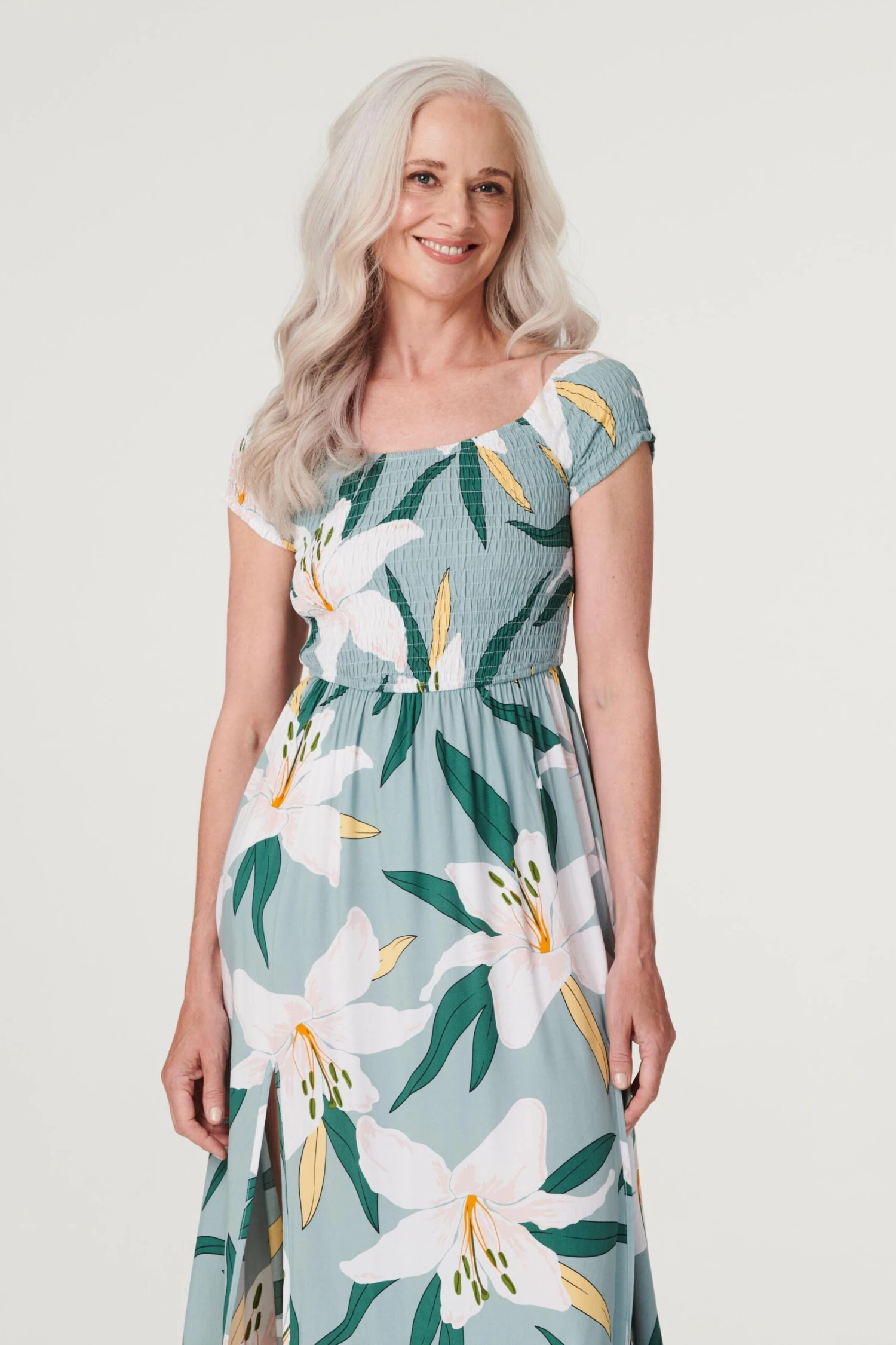 Make a statement in this bold floral print off the shoulder maxi dress. With a bardot neckline, cap sleeves, a smocked elasticated bodice, a straight column skirt and a full length hemline. Style with a sun hat and flat strappy sandals on holiday.