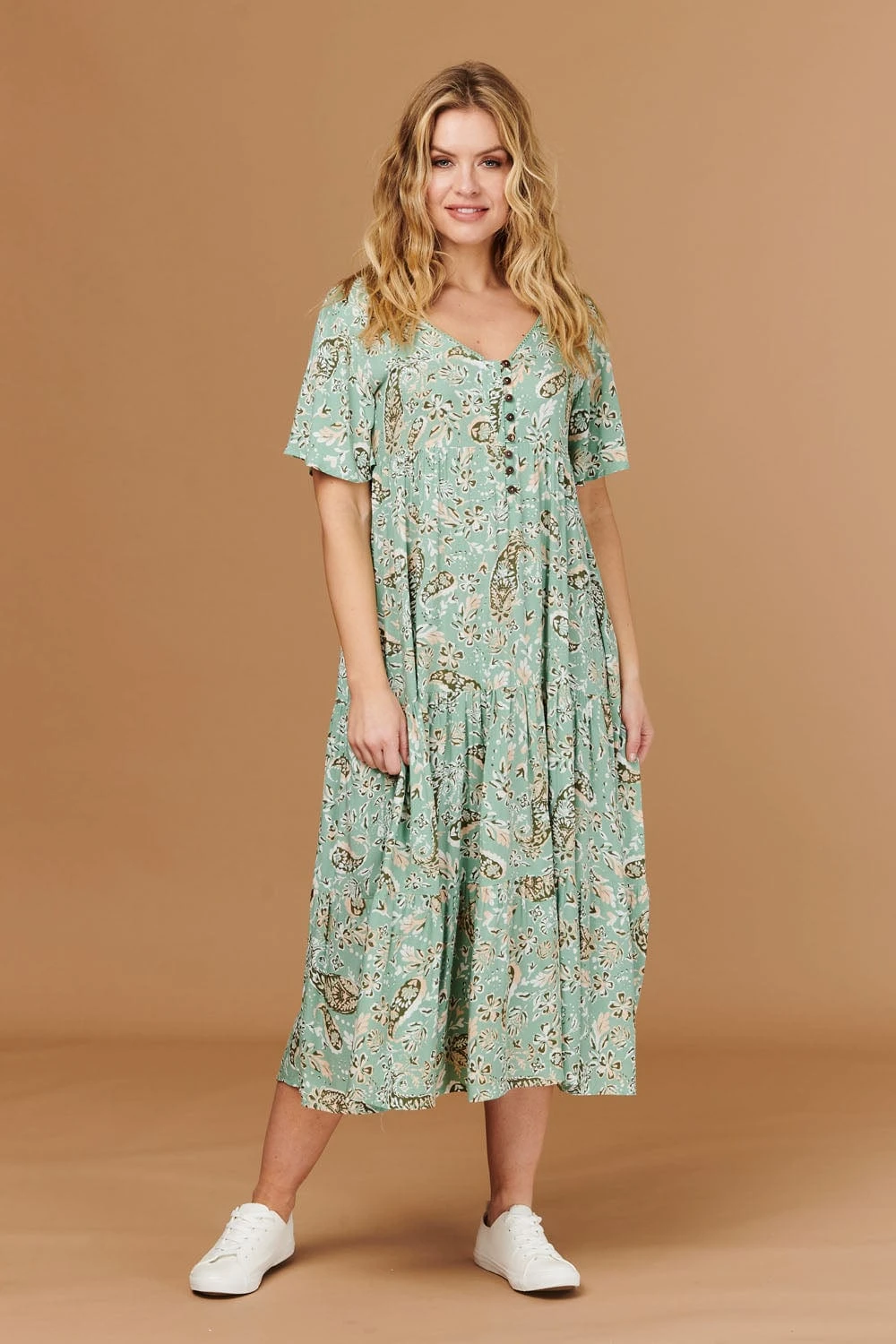 Every closet needs a relaxed smock dress like this floral style. With a v-neck, button front, short sleeves and a tiered oversized midi skirt. Pair with trainers for a comfortable off-duty look.