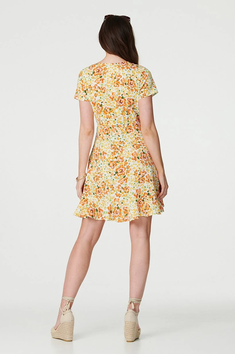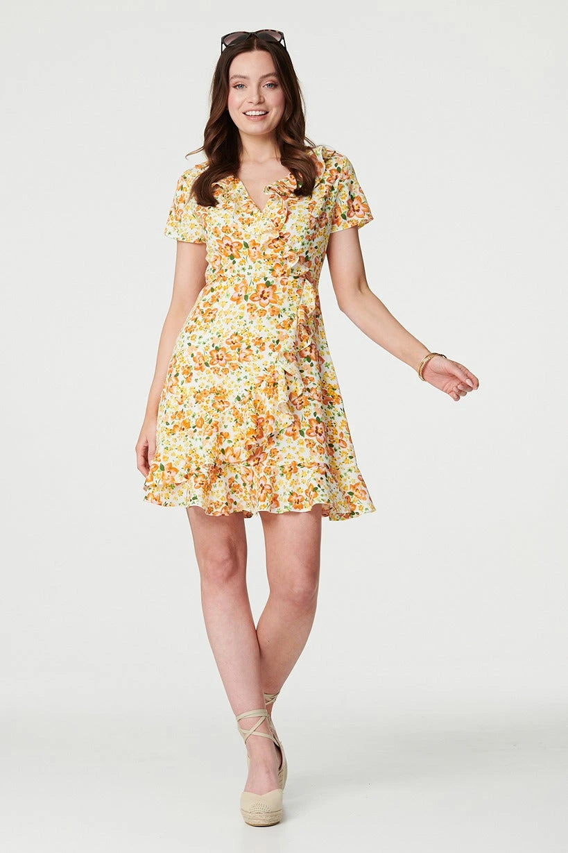 Stay summer-ready wearing this short wrap dress. It has a waist tie, ruffled v-neck front, short sleeves and a short ruffled hem. Keep it simple with your favourite sandals and a sunhat on a warm day.