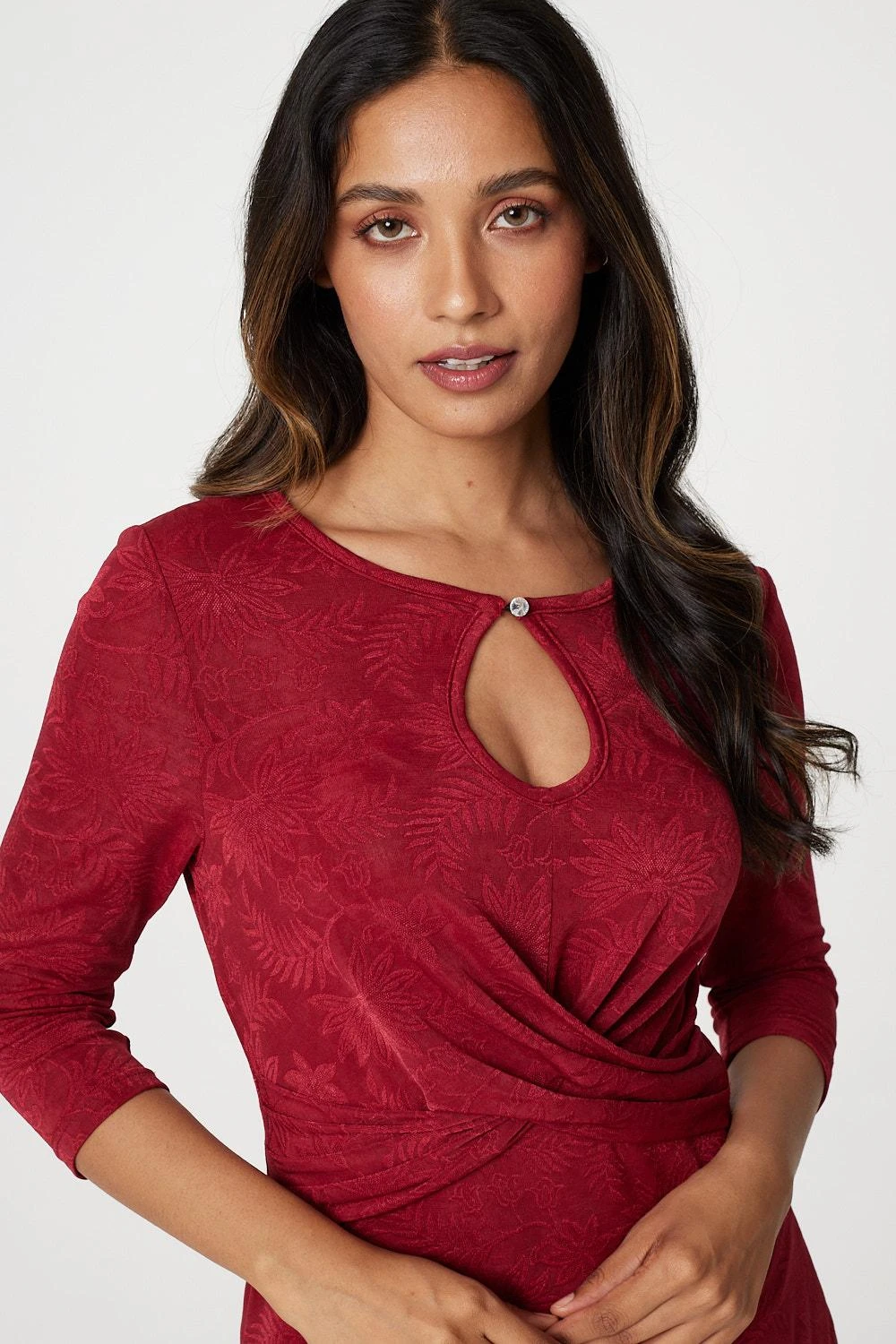 Try a skater style for your next formal occasion with this fit & flare short dress. It has a round neck, a keyhole front detail, 3/4 sleeves, a ruched crossover detail and a short skater skirt. Add a pair of elegant strappy heels for a look that’s perfect for an evening out with friends.